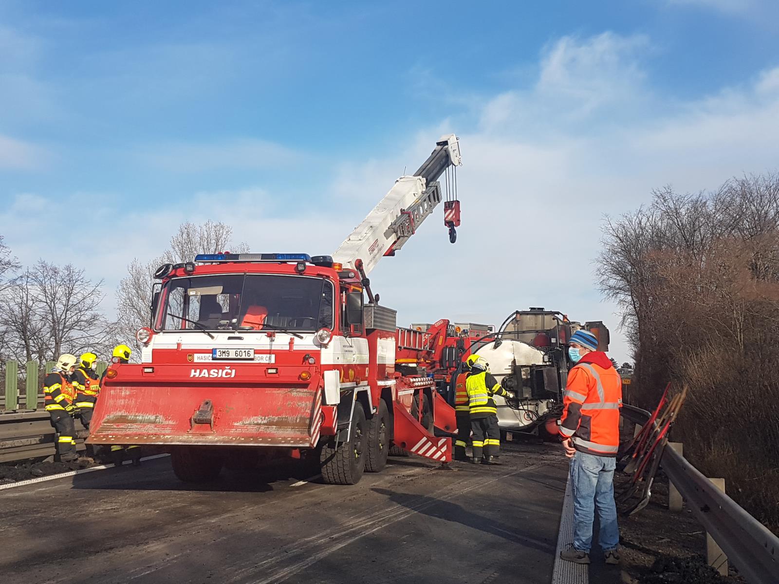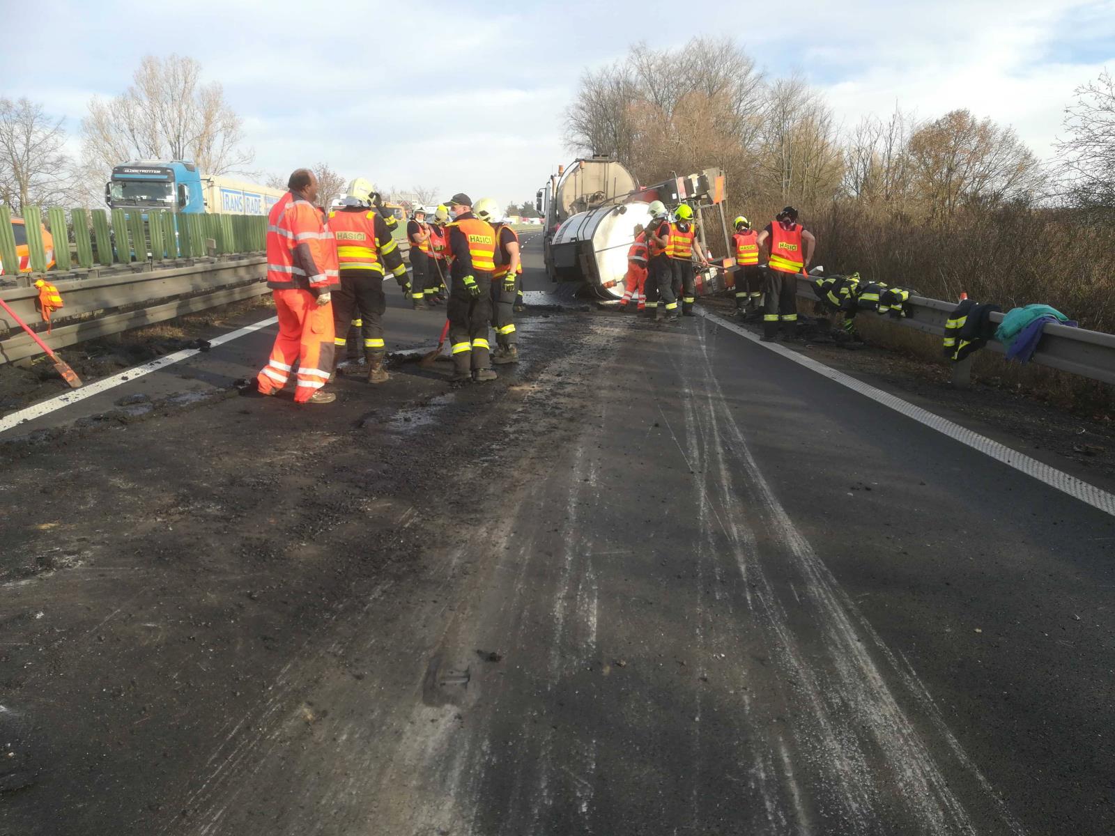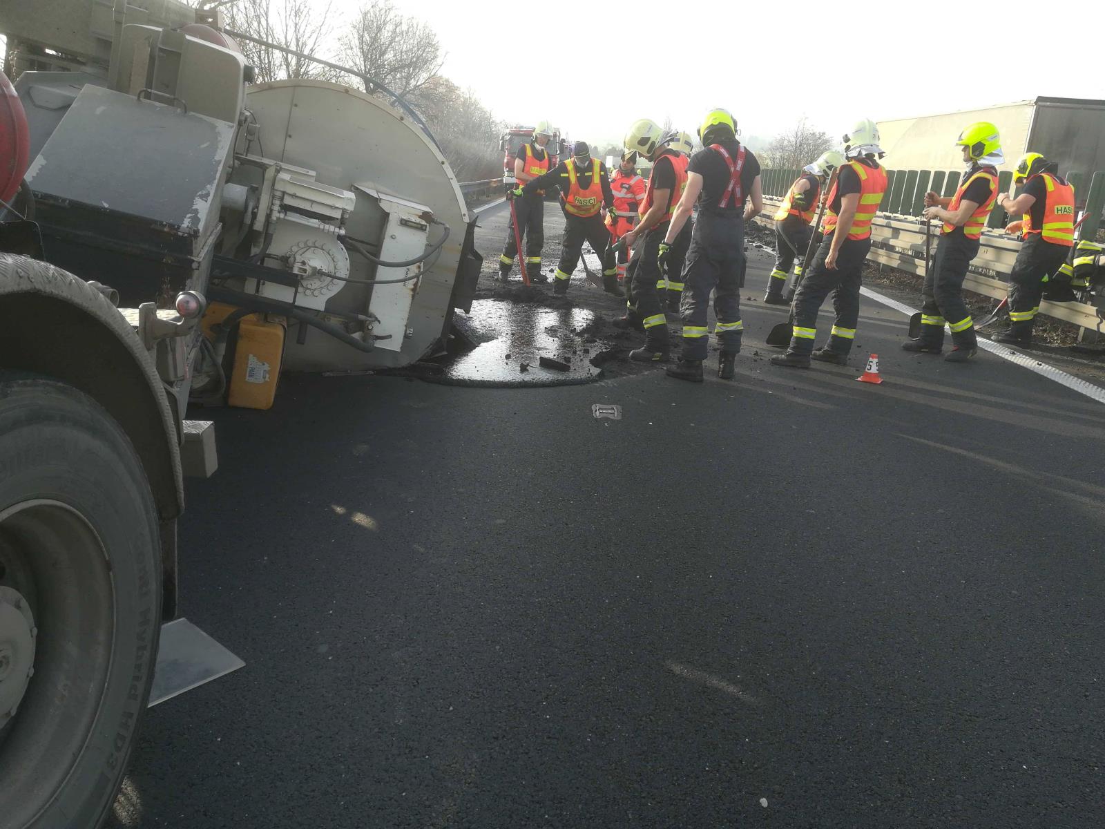Při nehodě se převrátila a z jedné části nákladního automobilu se vylilo 10 tun asfaltu. Díky rychlému zásahu jsme odstranili velkou část lopatami, ještě než stačil materiál ztuhnout. Následně jsme pomocí vyprošťovacího automobilu vrátili cisternu zpět na kola. Radlicí jsme poté odstranili zbylý a již ztuhlý materiál z vozovky a uklidili jsme ji.