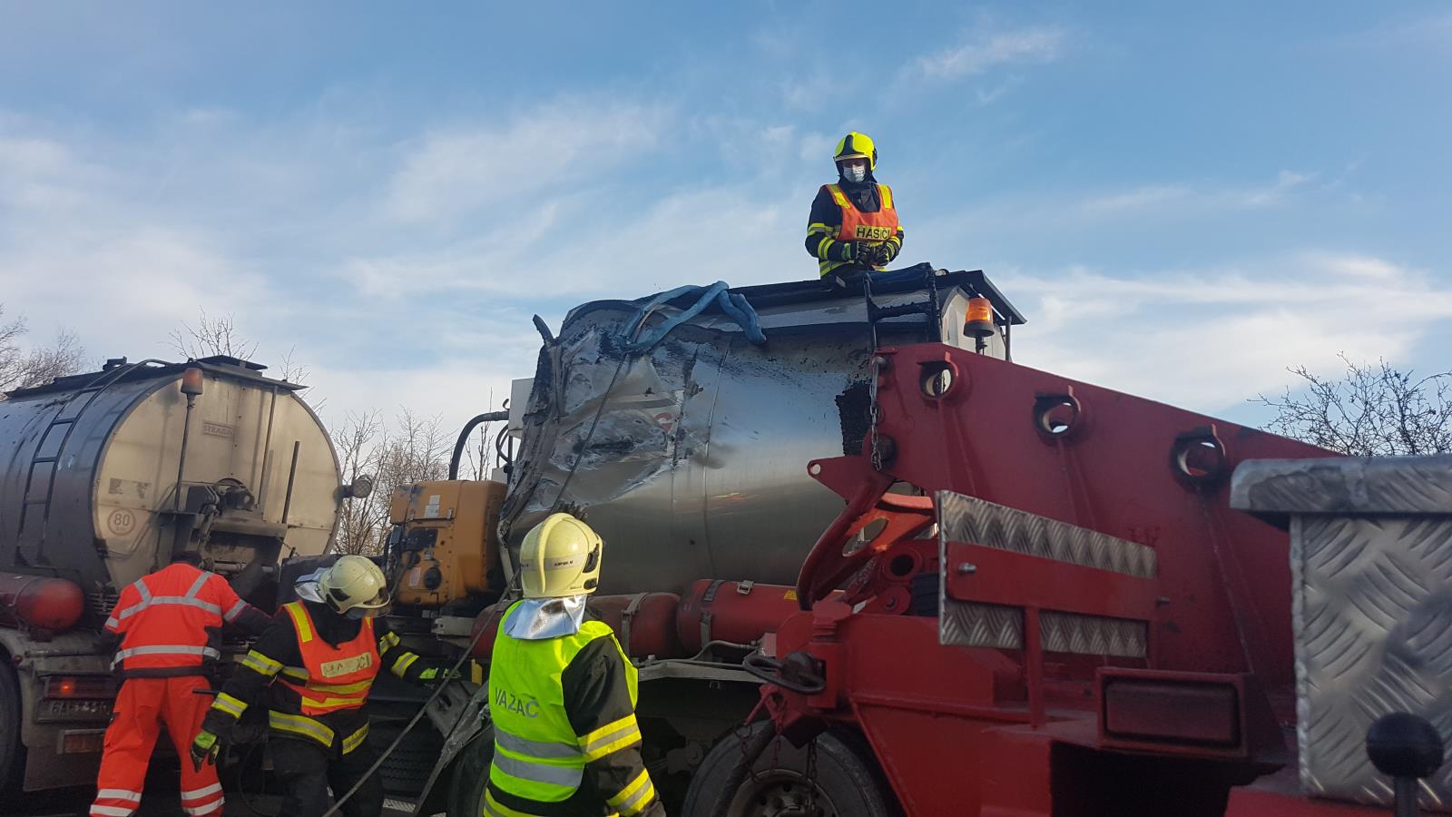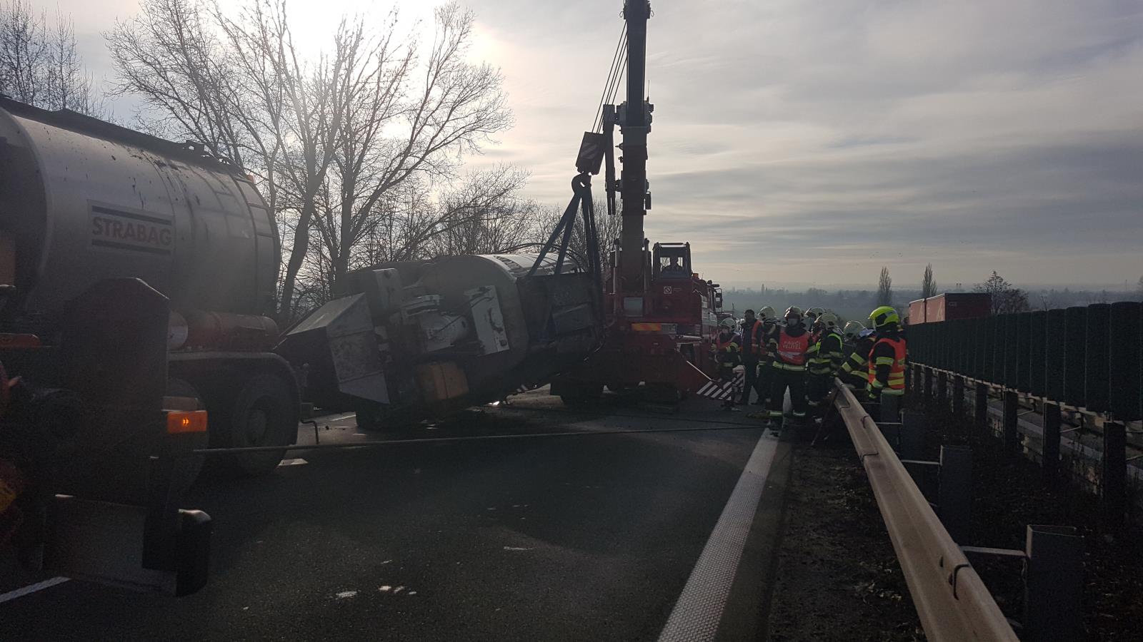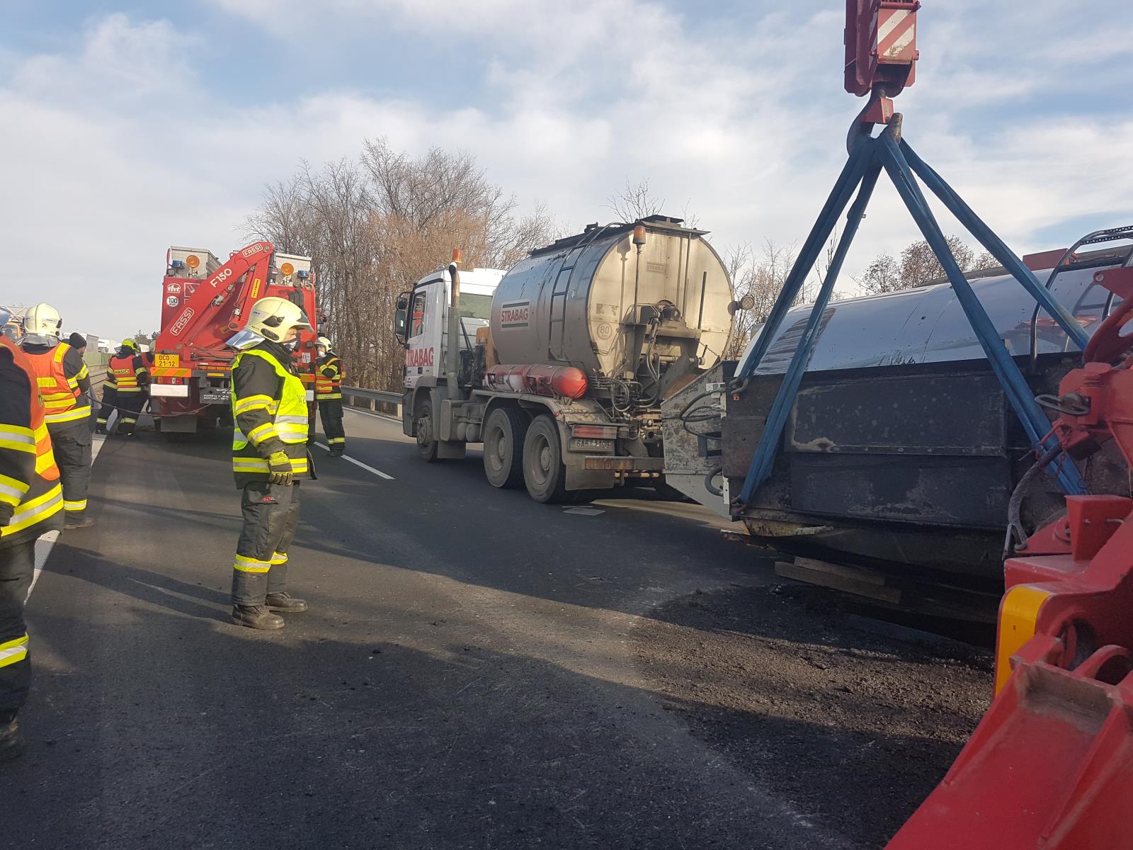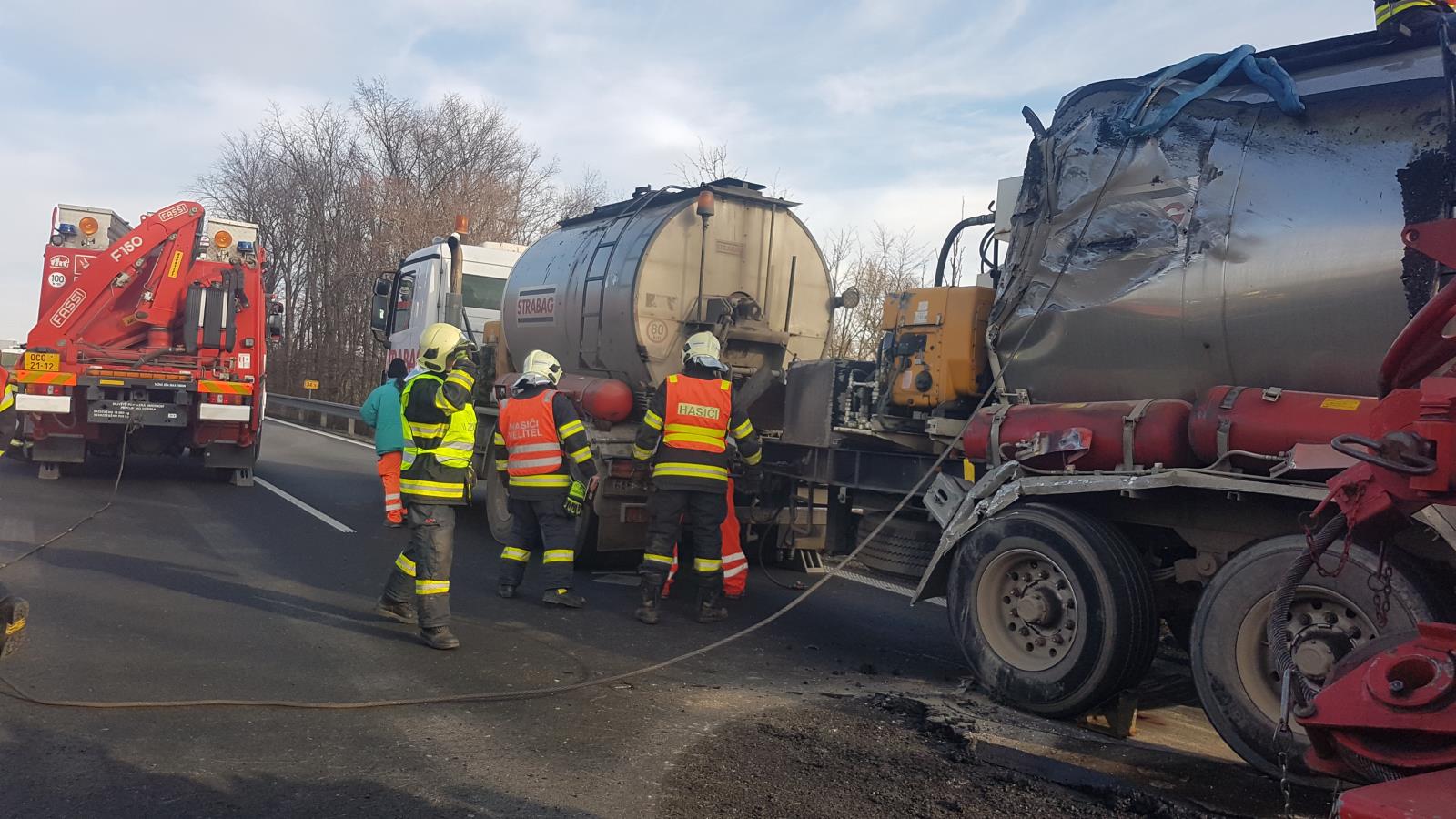 Při nehodě se převrátila a z jedné části nákladního automobilu se vylilo 10 tun asfaltu. Díky rychlému zásahu jsme odstranili velkou část lopatami, ještě než stačil materiál ztuhnout. Následně jsme pomocí vyprošťovacího automobilu vrátili cisternu zpět na kola. Radlicí jsme poté odstranili zbylý a již ztuhlý materiál z vozovky a uklidili jsme ji.