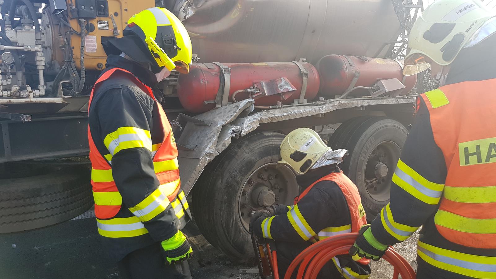 K dopravní nehodě nákladní cisterny převážející asfalt jsme dnes vyjížděli na D46 k Bystročicím ve směru na Olomouc.