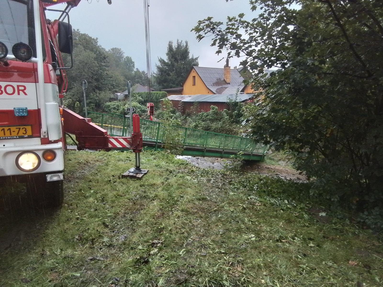 Pátek v souvislosti s výstrahami ČHMÚ pro celý Olomoucký kraj pokračujeme v preventivním odstraňování lávek a mostů na řece Bělé v Bělé pod Pradědem a jejich místních částech na Jesenicku. Ve čtvrtek jsme pomocí vyprošťovacího jeřábu a jeho silného navijáku odstranili 5 mostů, dnes budeme pokračovat v místní části Tomíkovice. Podobným způsobem přemístíme další lávku.