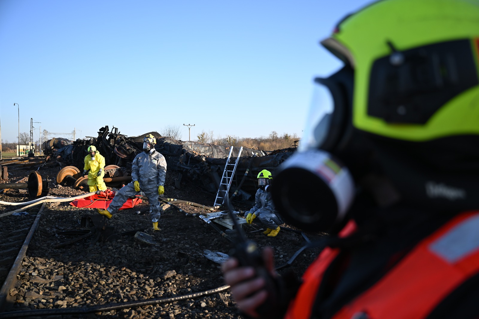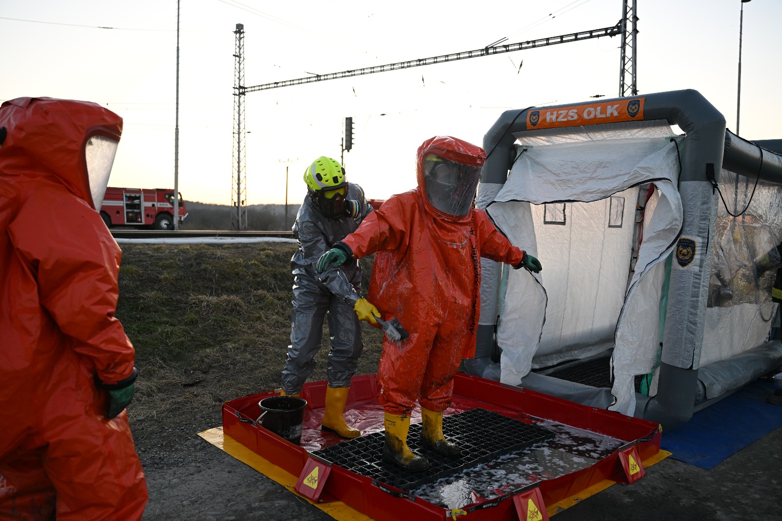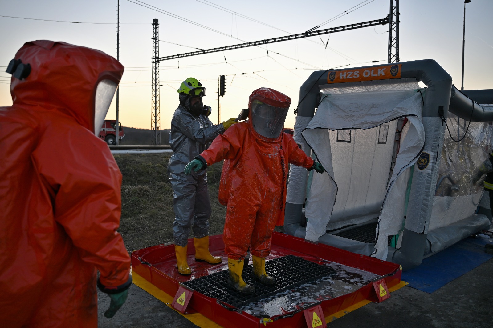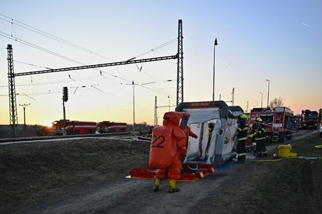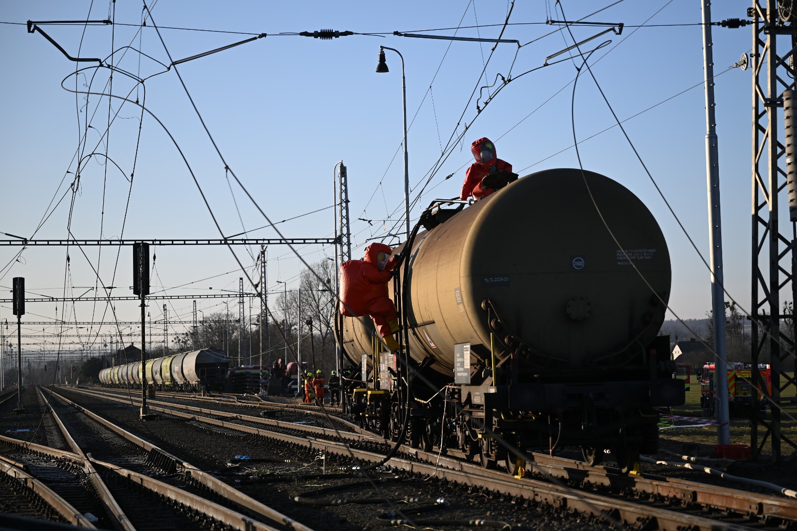 V Hustopečích nad Bečvou stále pokračuje komplexní zásah u místa nehody cisteren s benzenem. Hasiči v protichemických oblecích pracují v nebezpečné zóně a připravují nasazení lokomotivy s parním generátorem, která pomůže s hrubou očistou 12 poškozených vagónů. Cílem je snížit výbušnou koncentraci benzenu uvnitř i v okolí cisteren, což je zásadní krok pro další postup dekontaminace.