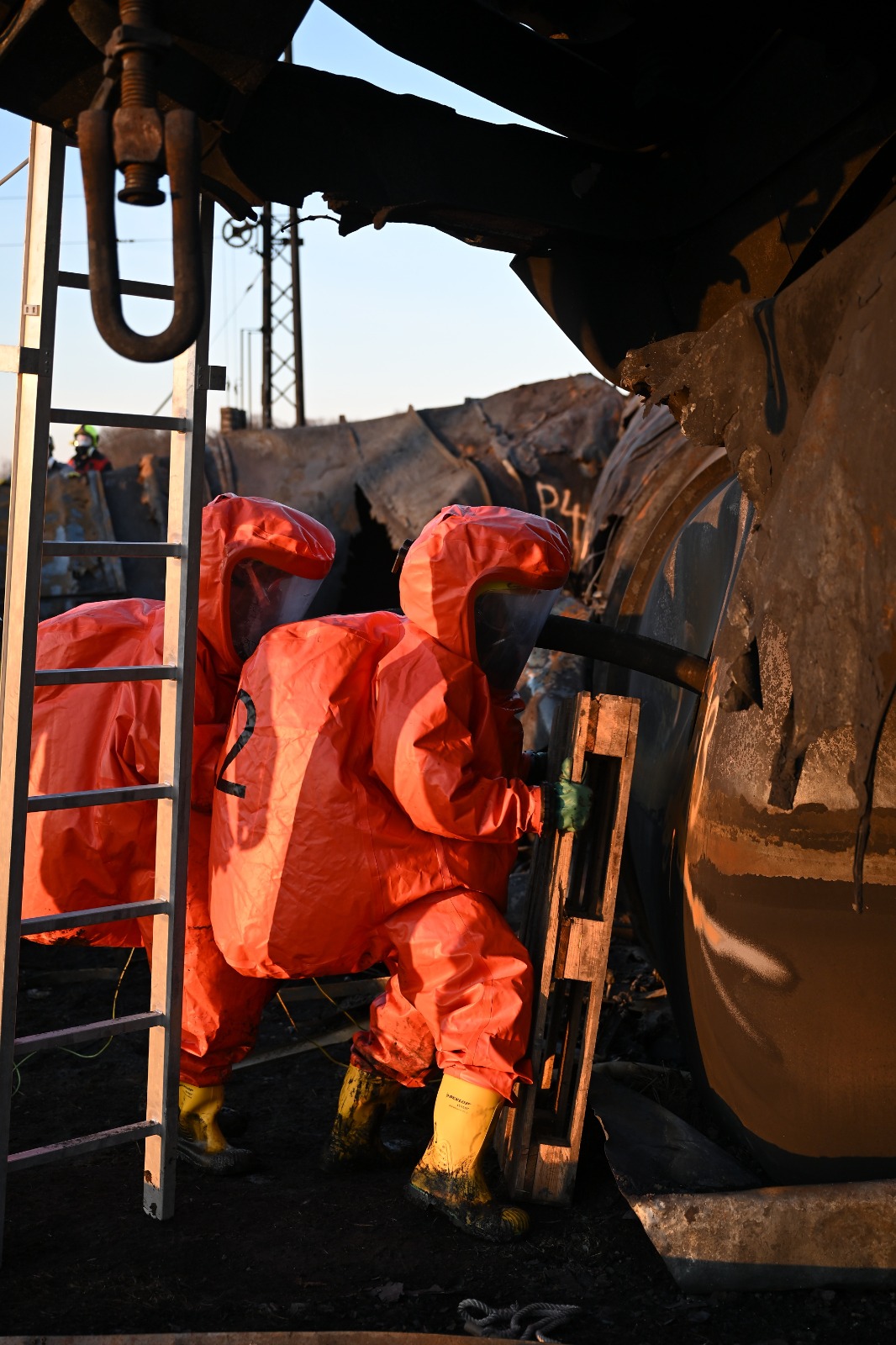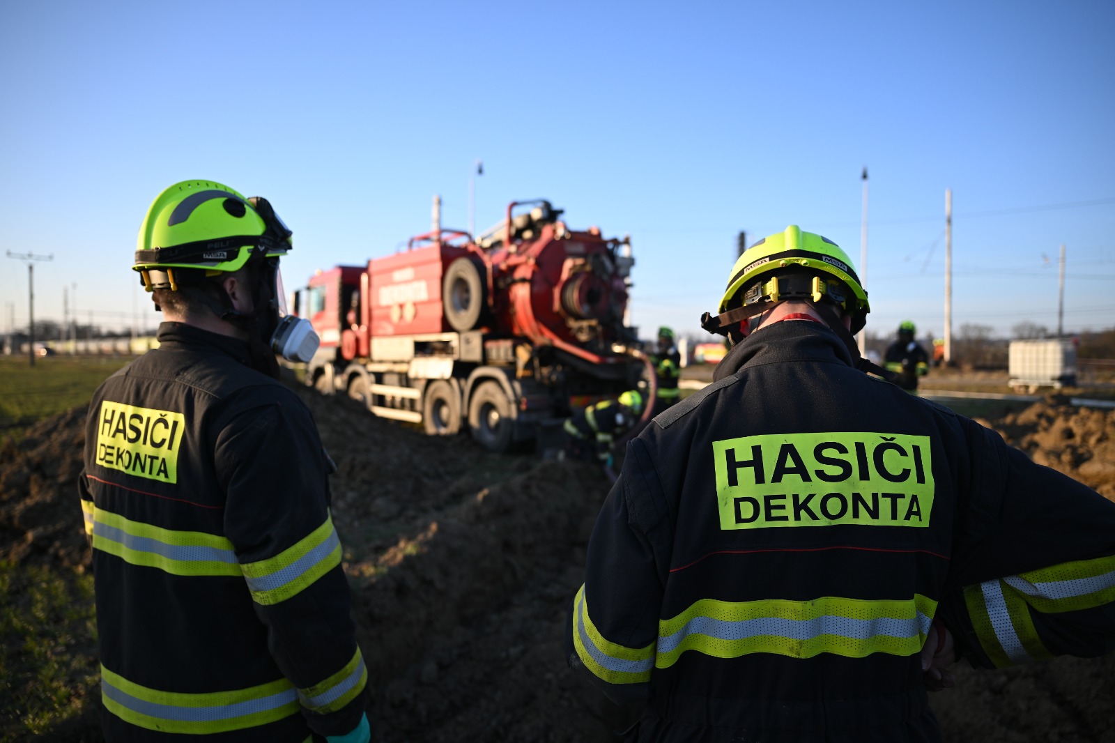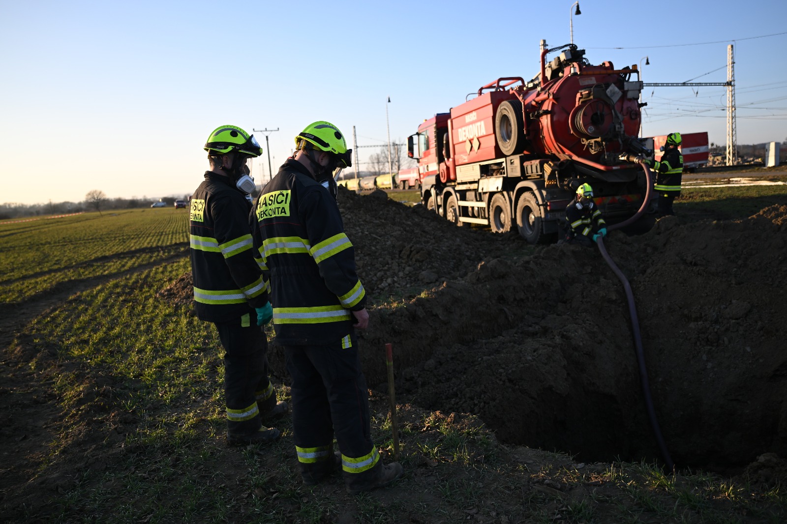 Na místě dochází k odčerpání posledních zbytků benzenu. Vzhledem k nebezpečným podmínkám probíhá veškerá práce za přísných bezpečnostních opatření. Po ukončení směny hasiči procházejí dekontaminací, která minimalizuje riziko přenosu nebezpečných látek.