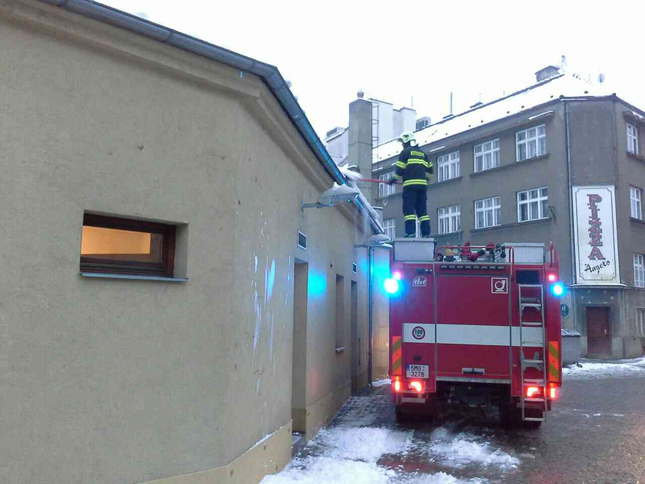 Hasiči pomáhají s odstraňováním padajícího sněhu ze střech.