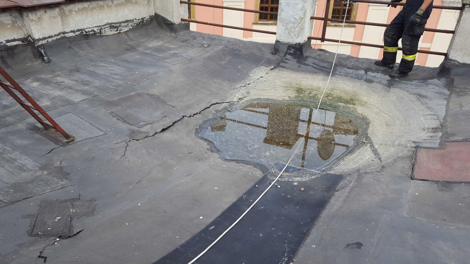 Na místo vyjeli profesionální hasiči z Olomouce, kteří po příjezdu zjistili, že ve 4. nadzemním podlaží bytového domu se částečně propadly dřevěné stropy v jedné místnosti rekonstruovaného bytu. Na střeše domu se vytvořila vodní laguna, jejíž váhu stop neudržel. Velitel zásahu si proto na místo vyžádal speciální techniku, která se používá při závalech.