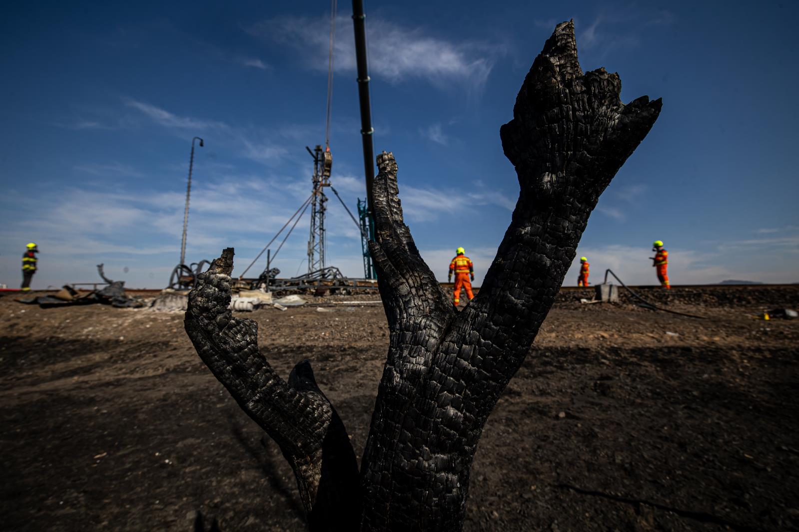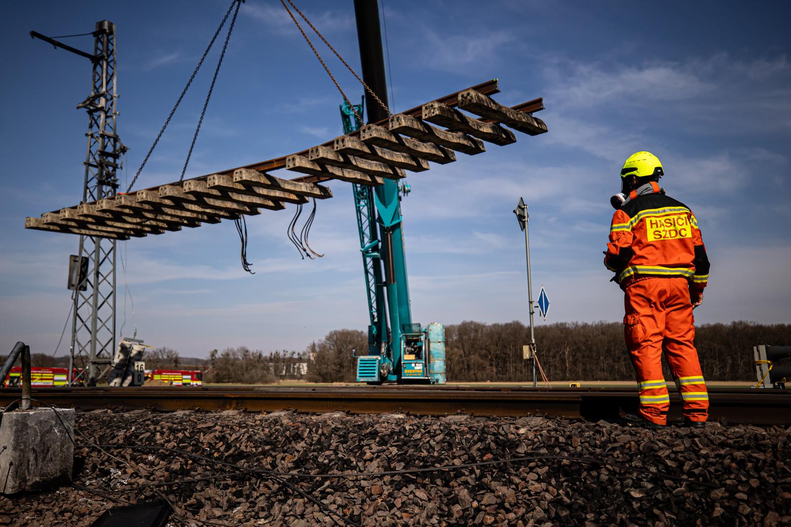 Hustopeče nad Bečvou – Pásový jeřáb v pondělí odřezal deset kolejových polí, každé o délce přibližně deset metrů, a přemístil je z drážního tělesa. Současně odstraňoval i samostatné kolejnice a devět vagónových soukolí, která se po nehodě a následném požáru cisteren uvolnila a bránila pohybu těžké techniky. Na místě zasahovalo osmdesát hasičů z patnácti jednotek. Nasazení pokračuje i v úterý s maximální pečlivostí a důrazem na bezpečnost.