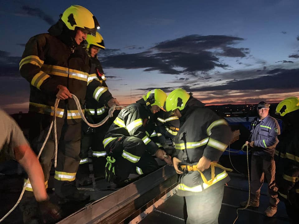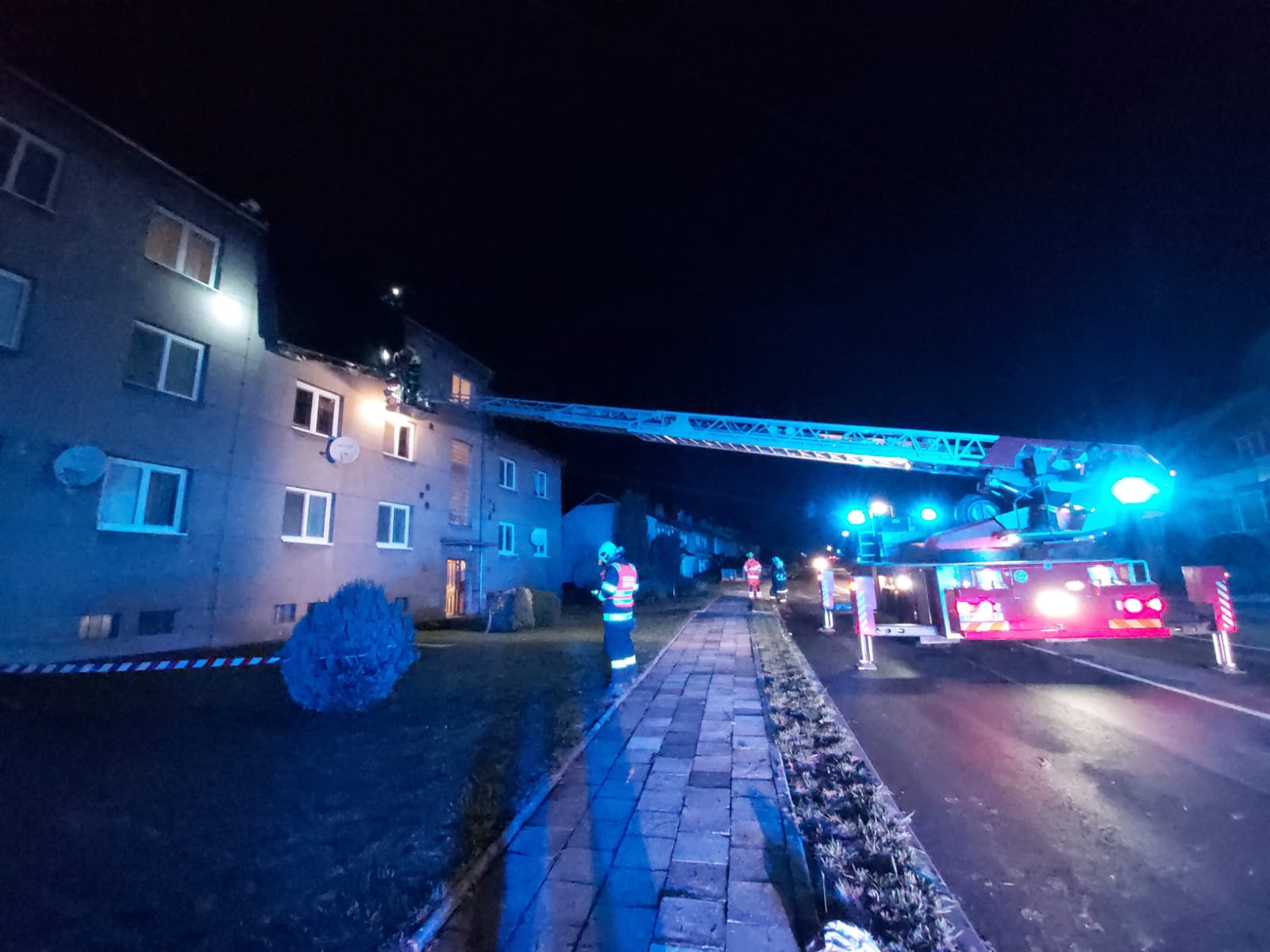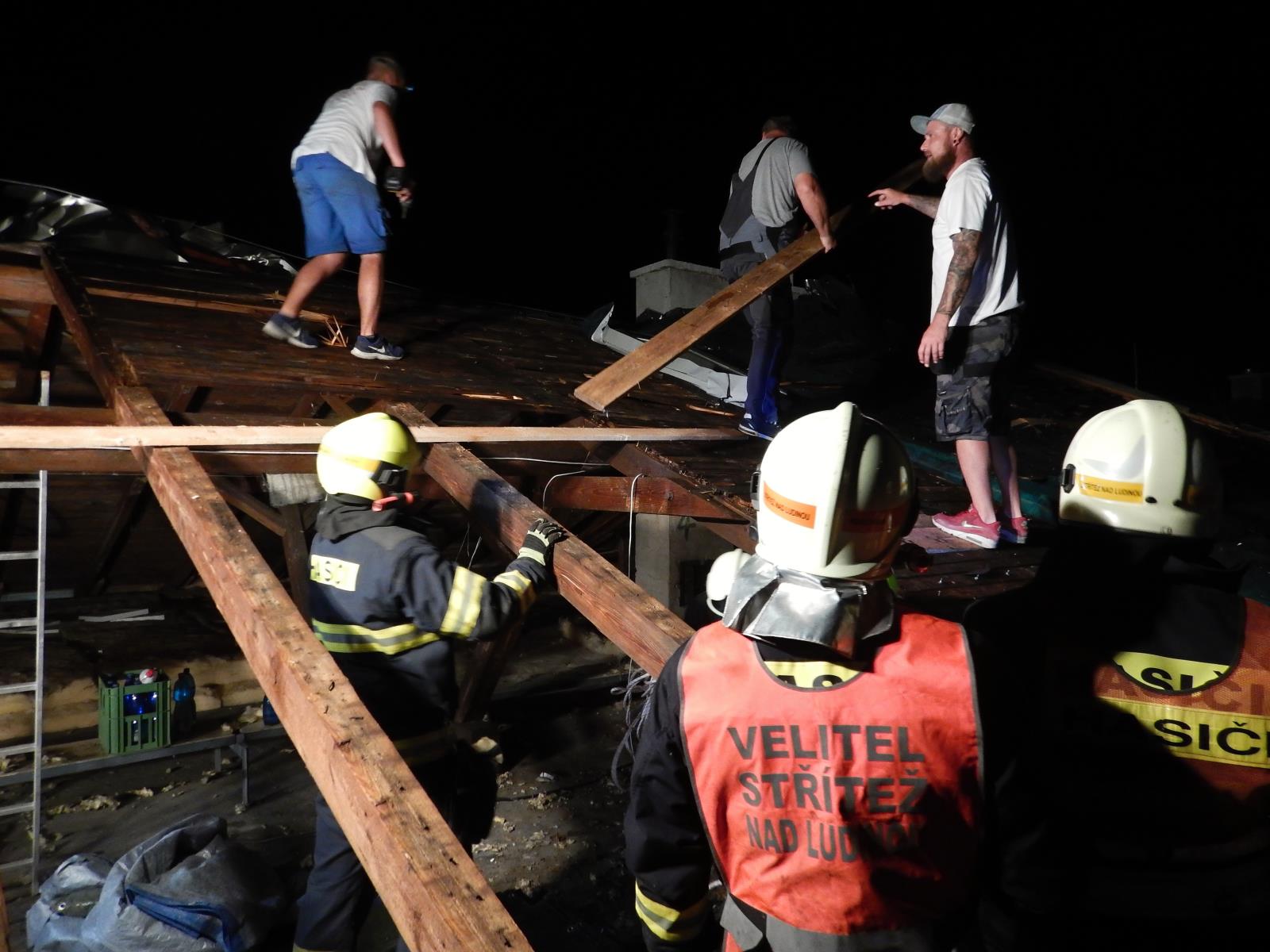 Pomoc se spadeným komínem a zaplachtování střechy. |