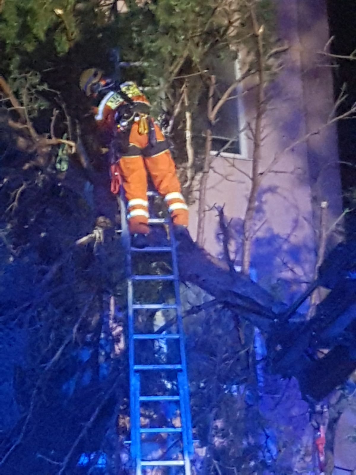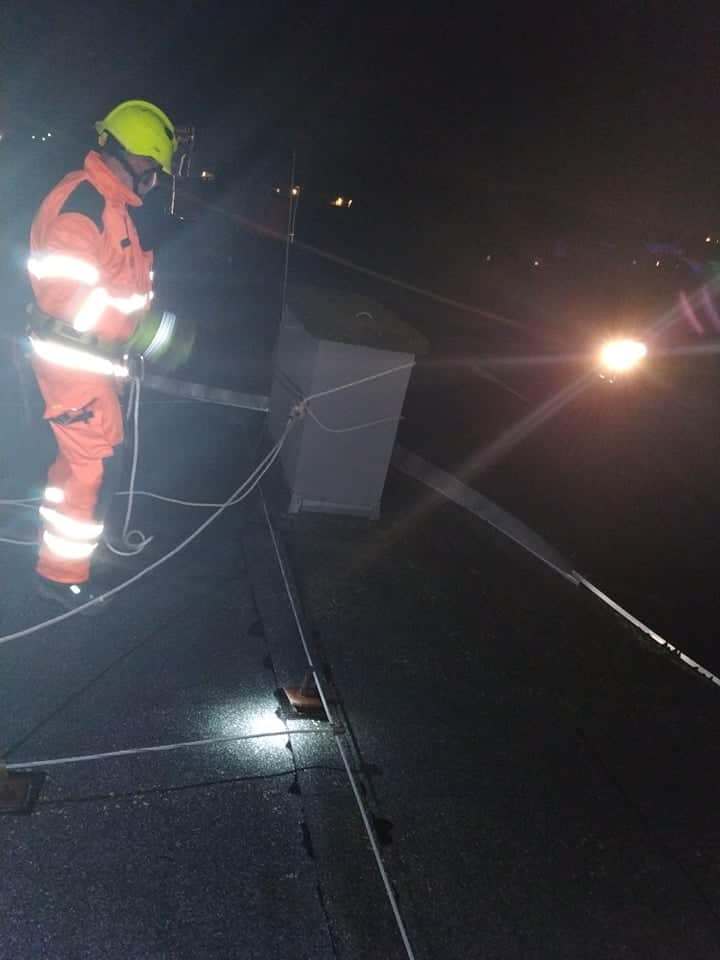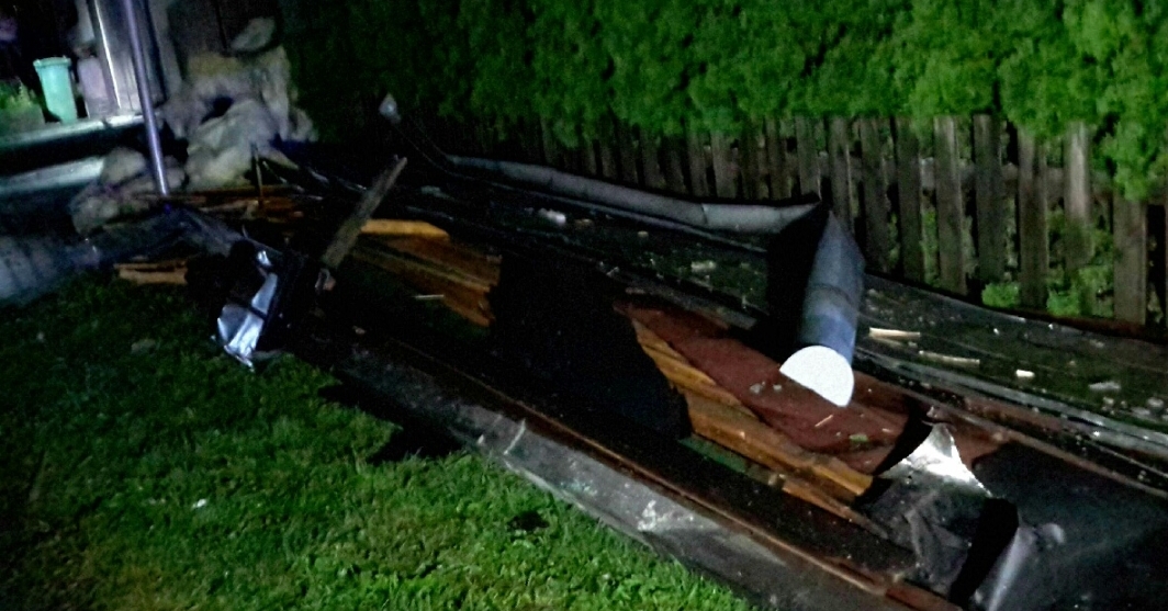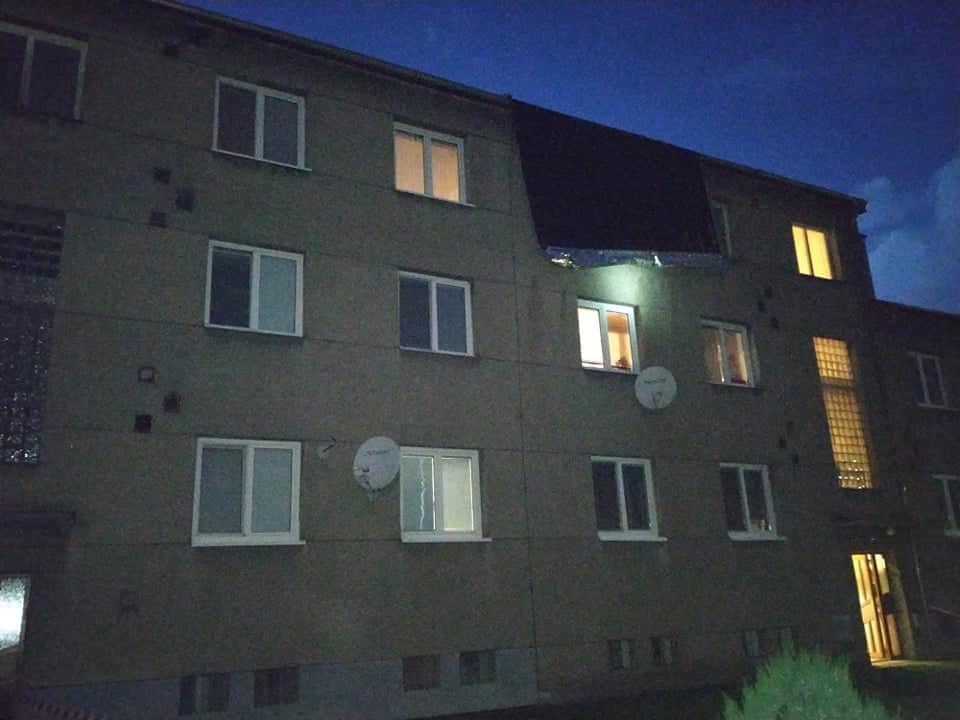 Pomoc se spadeným komínem a zaplachtování střechy. |