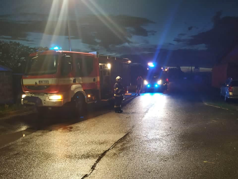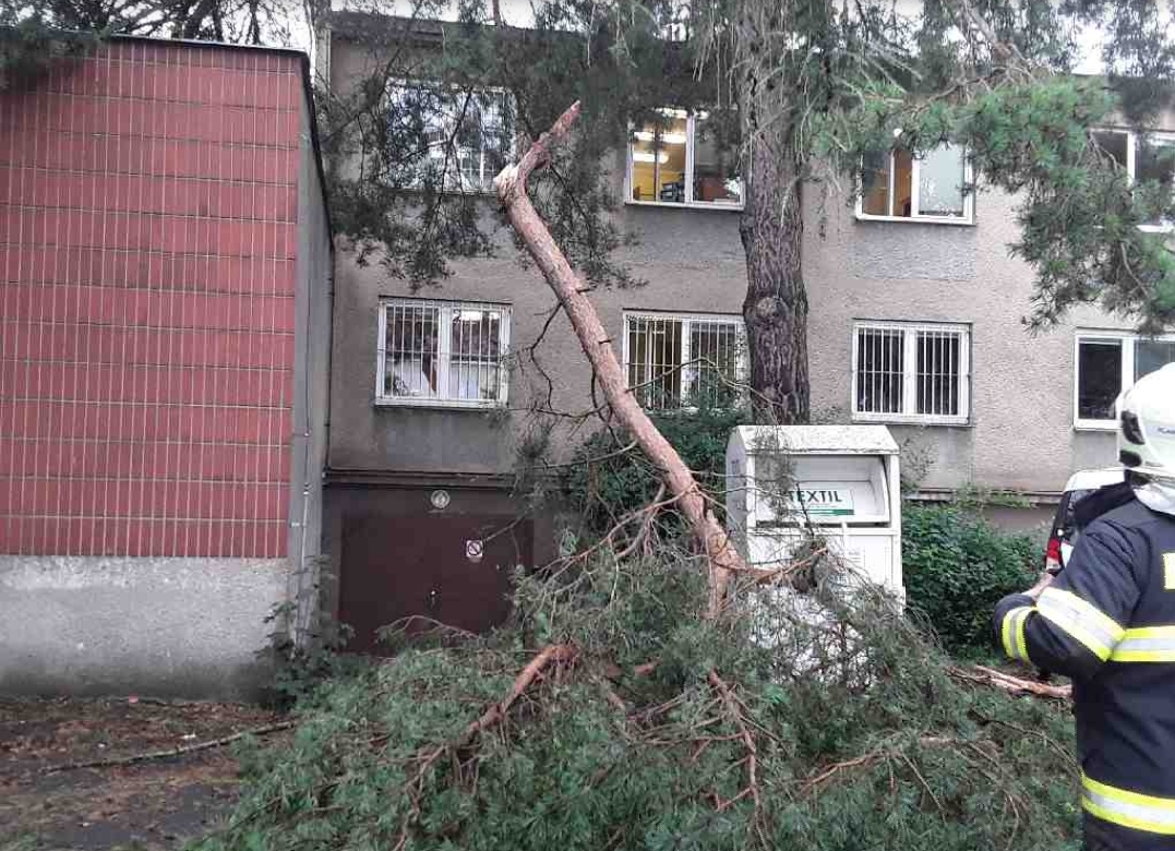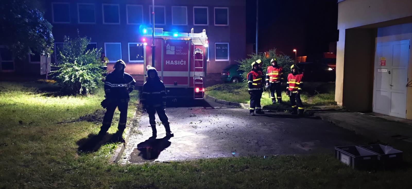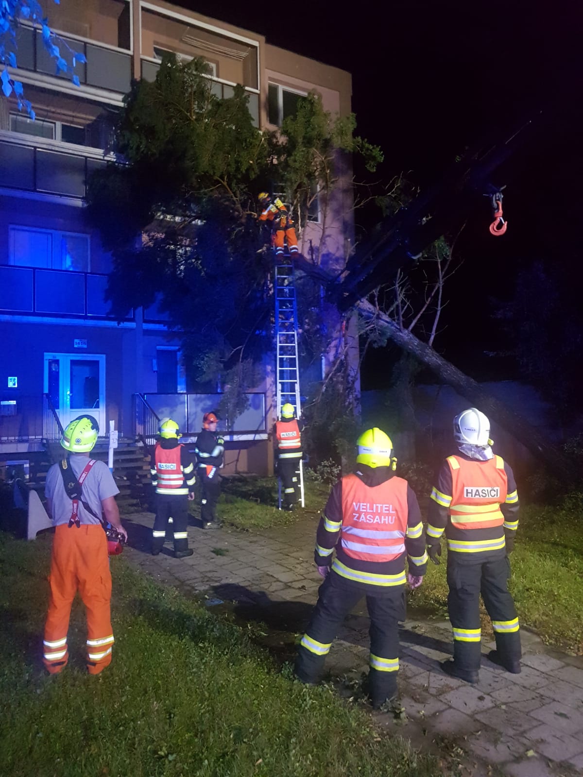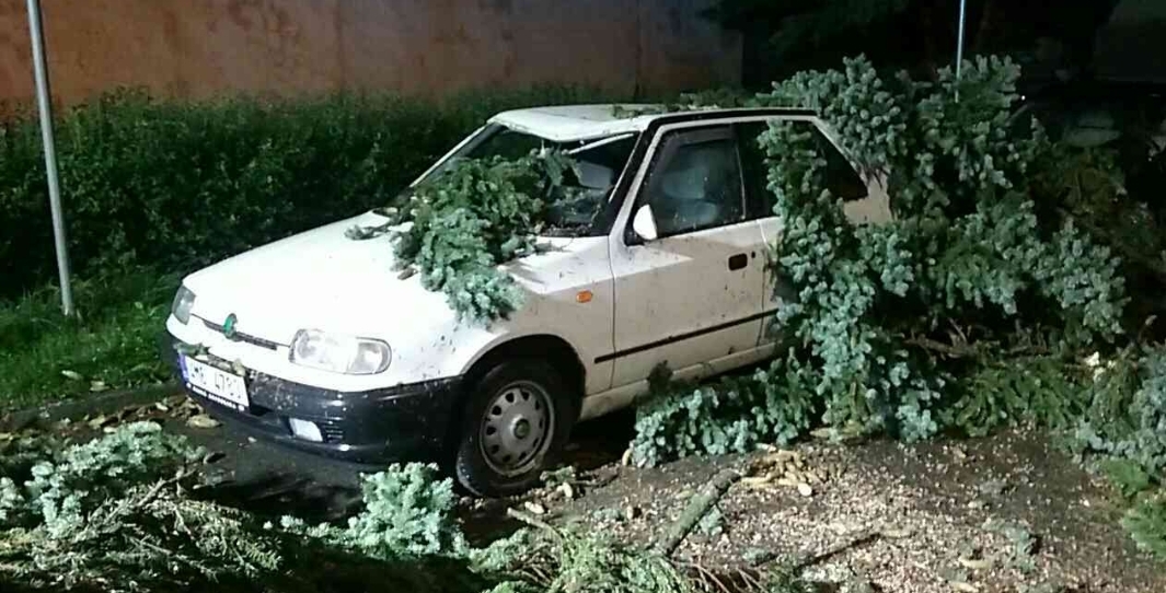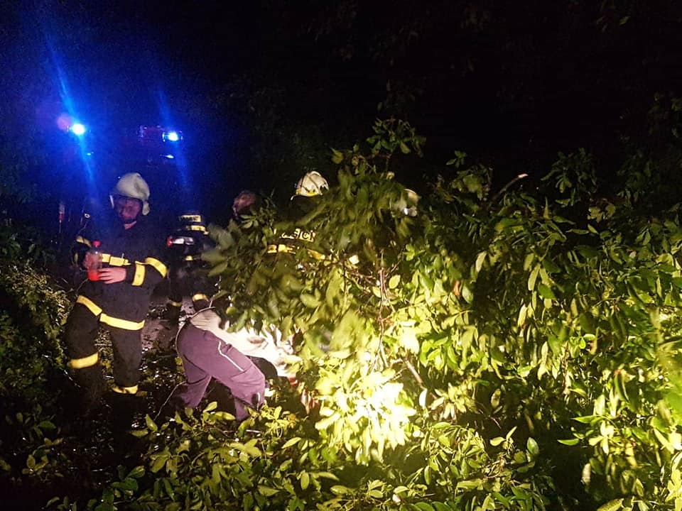 Likvidace spadlého stromu a zajištění poškozeného vozidla. |