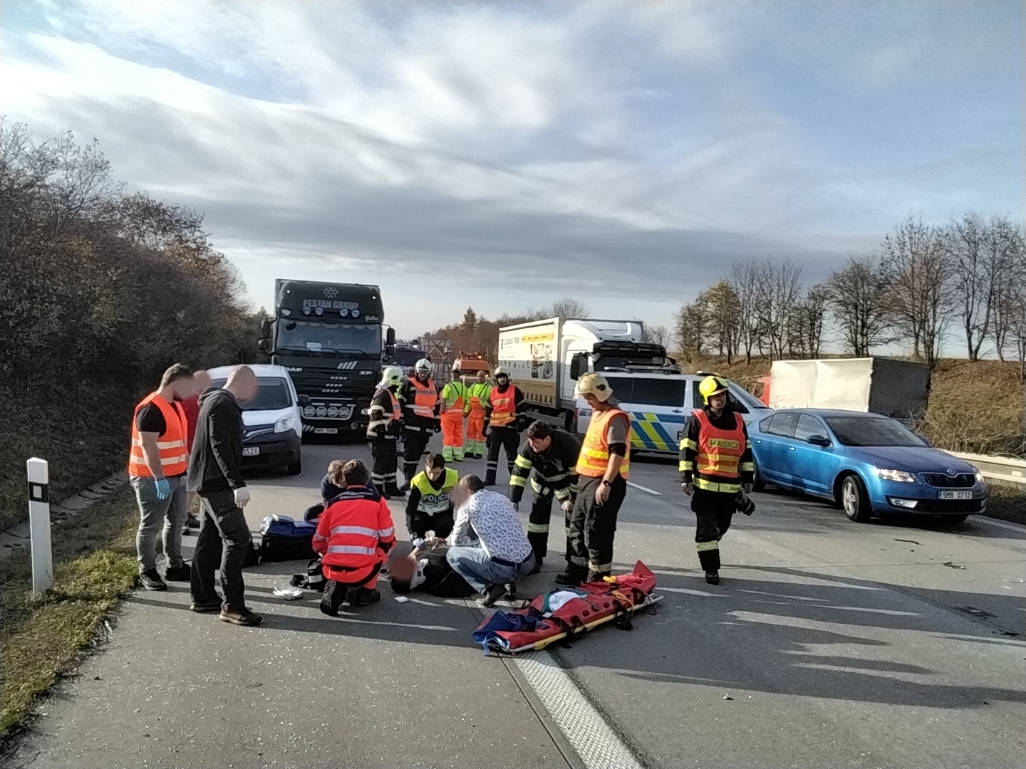 Jednoho zraněného jsme předali posádce LZS a asistovali jsme při transportu do vrtulníku. Dvě zraněné osoby jsme museli ze zdemolované dodávky vyprostit hydraulickými nástroji. Odstranili jsme dveře a využili jsme i rozpěrný válec, abychom odtáhli palubní desku a oba pasažéry z dodávky dostali bezpečně ven. Oba si převzali záchranáři ZZS.