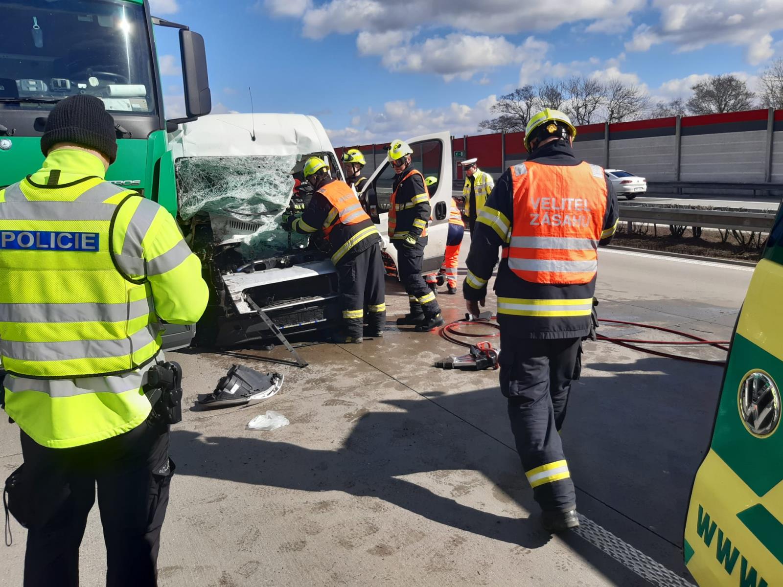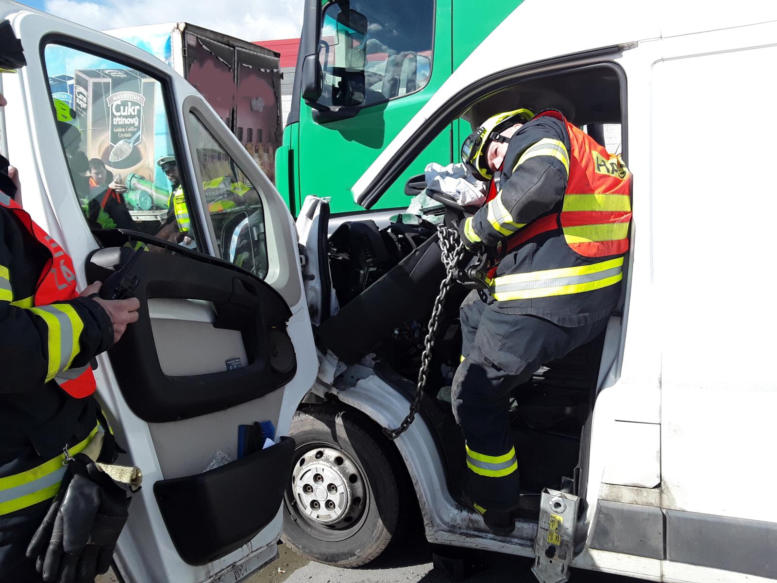 Využili jsme hydraulické nůžky a rozpínák s řetězy, abychom jej z auta dostali ven. Nůžkami jsme odstřihli jeden ze sloupků a pomocí řetězů jsme odtáhli palubní desku. Poté jsme jej předali ZZS. Dálnice byla ve směru na Olomouc po dobu našeho zásahu uzavřena, PČR odkláněla dopravu přes Hranice. Ve spolupráci s odtahovou službou byla vozidla odsunuta mimo komunikaci a následně se řešil jejich odtah.