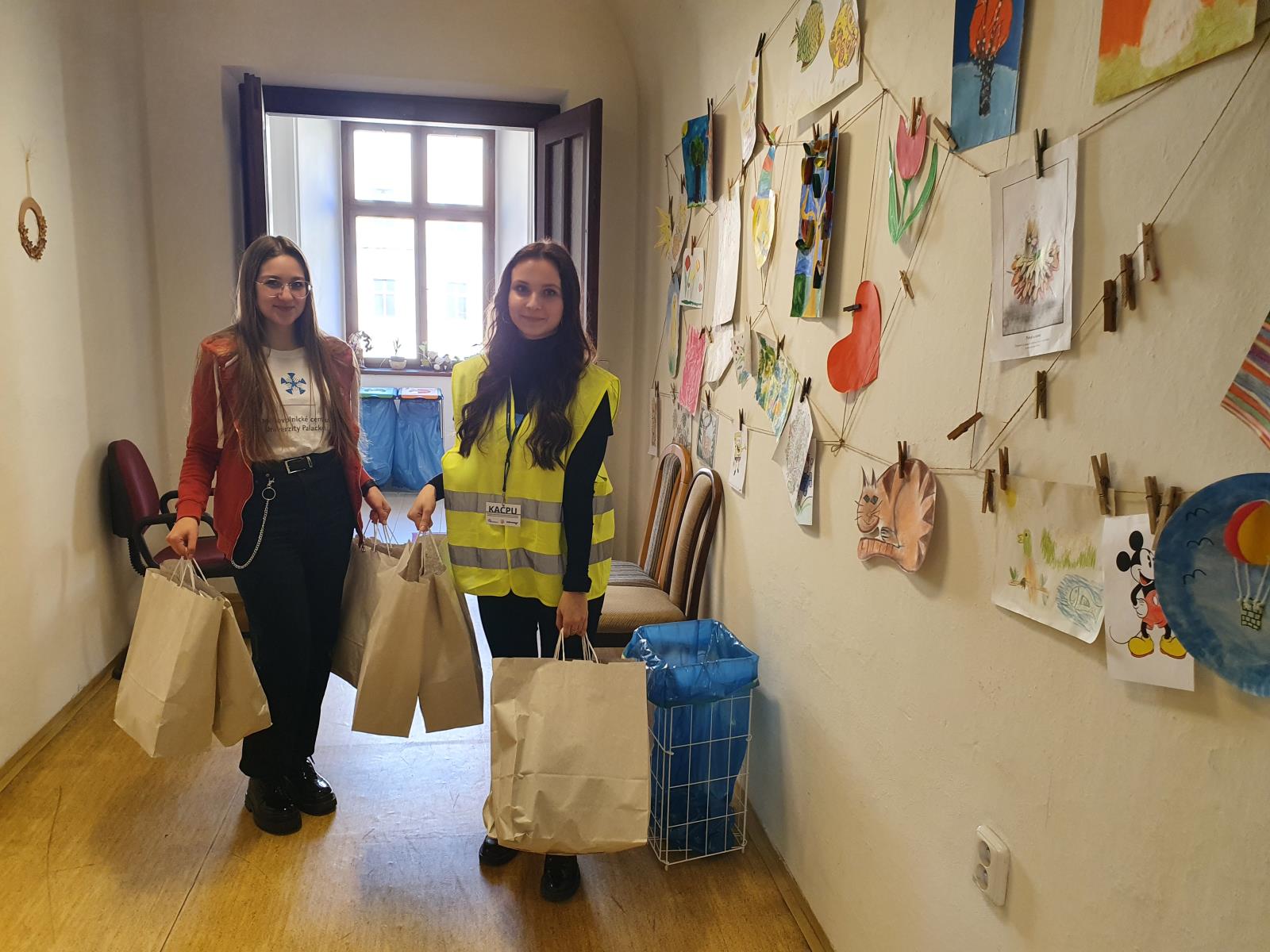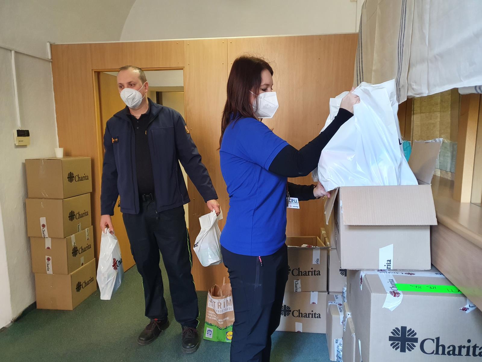 Sklad materiální pomoci zabezpečuje ve spolupráci s KACPU Arcidiecézní charita a Potravinová banka, kontejnery a sbírku ošacení organizujeme společně s Charitou Olomouc.