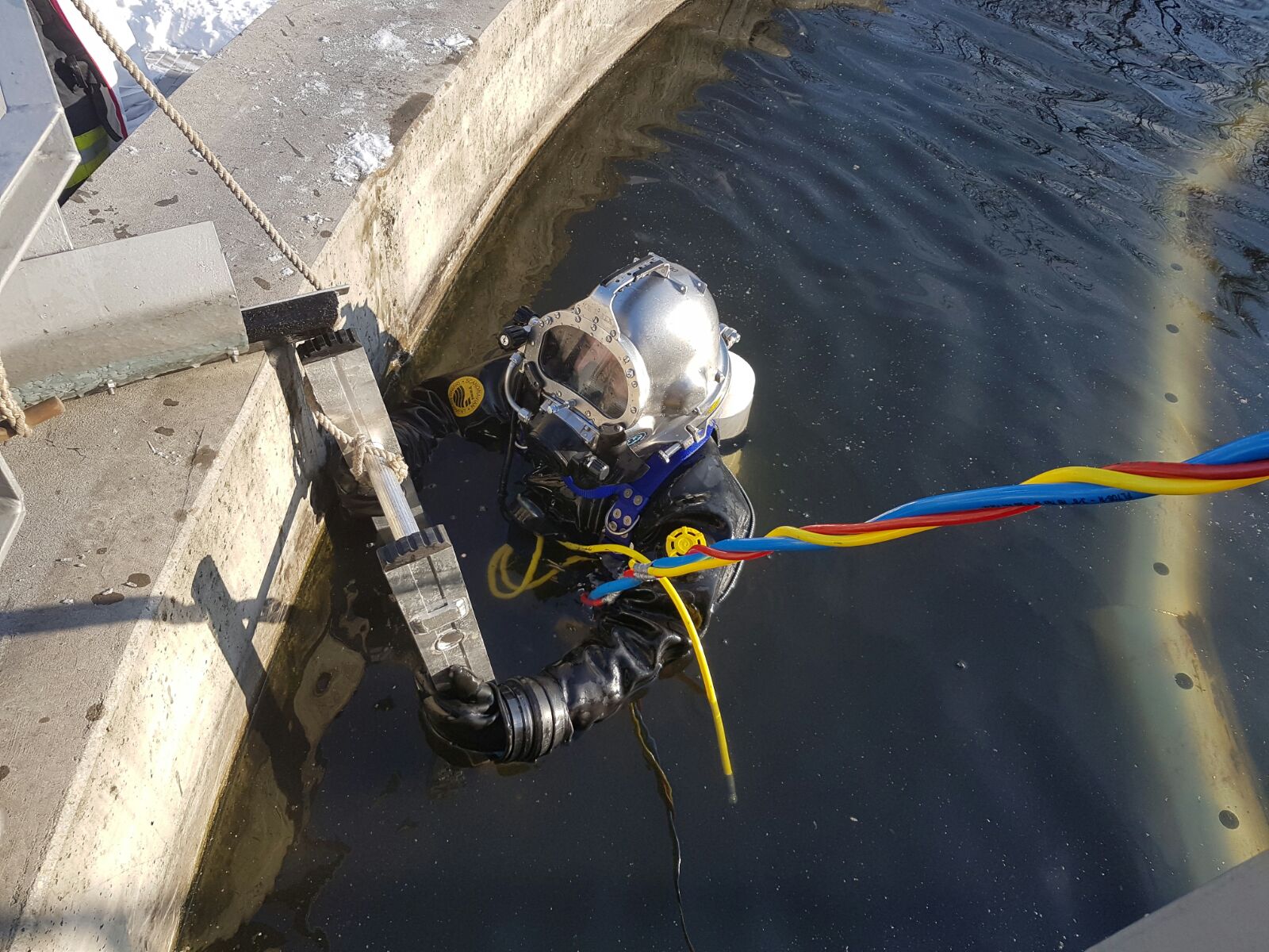 Před samotným ponorem do splaškové vody se hasiči poradili s technikem ČOV. Vzhledem k tomu, že uvíznutý předmět se nacházel v silně kontaminované vodě, využili hasiči pro zásah tzv. přilbové potápění. Potápěč oblečený ve skafandru jako z dob Jules Verna se po žebříku dostal nahoru na nádrž, odkud se potopil do kontaminované vody. Operátor ho naváděl na místo pravděpodobného výskytu potopeného nářadí. Asi v osmé minutě od ponoru potápěč ztracený krumpáč nalezl ve sběrné jímce ve středu nádrže. Všechno dobře dopadlo, technologie poškozena nebyla ani se nikdo nezranil.