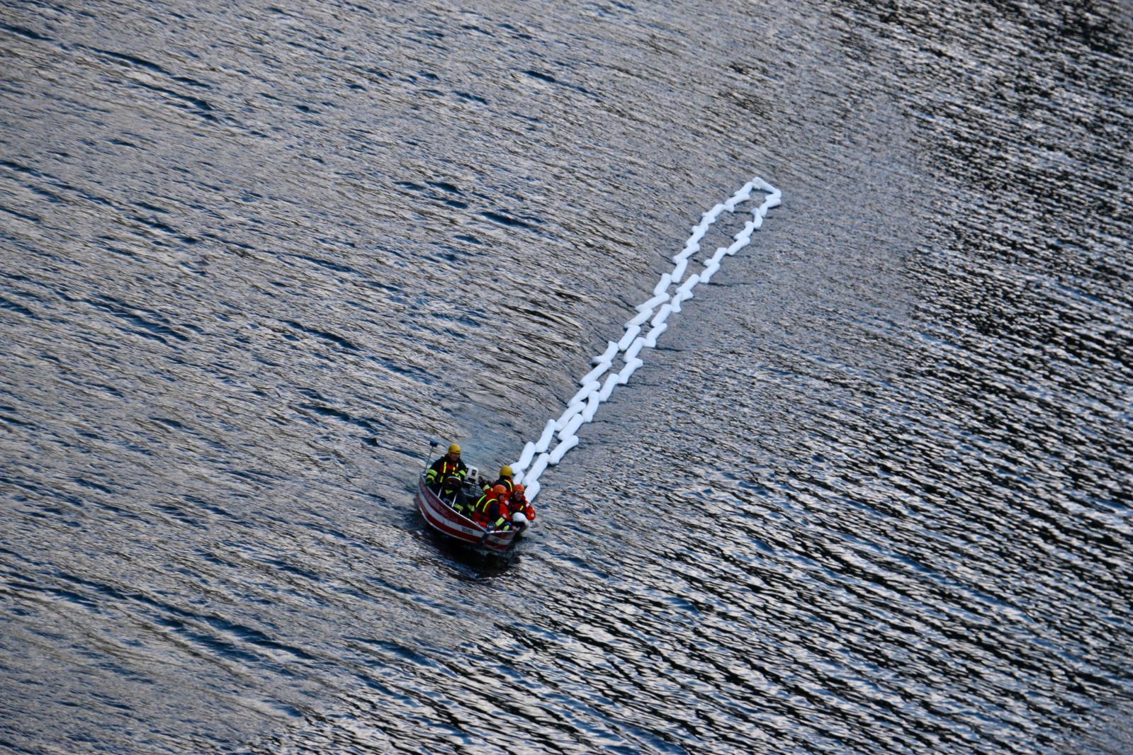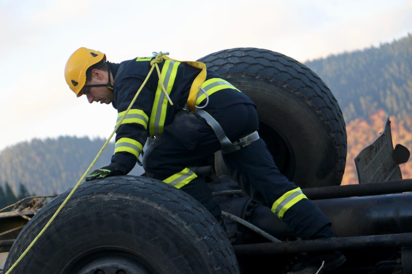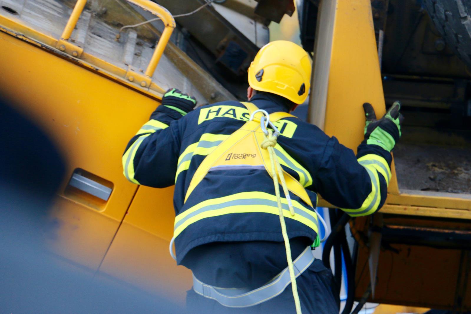 Na místo vyjeli profesionální hasiči ze Šumperku a z Jeseníku a dobrovolní hasiči z Loučné nad Desnou, kteří po příjezdu zjistili, že jeřáb, který pracoval na sdruženém objektu a prováděl jeřábnické práce při pravidelné revizi česel, se převrátil na střechu, částečně visel nad vodní hladinou a břemeno spolu s ramenem zasahovalo až do vody. Muž, který jeřáb obsluhoval, zůstal strojem zavalen a na místě svým zraněním podlehl. V prvotní fázi hasiči jeřáb zajistili lany, aby nedošlo k jeho dalšímu posunu. Do vody unikly provozní kapaliny, proto hasiči se člunem na hladinu natáhli norné stěny a sorbční hady. Zbylou naftu a hydraulický olej hasiči z nádrží havarovaného vozidla přečerpali. V další fázi velitel zásahu spolu s řídicím důstojníkem a pracovníky přečerpávací elektrárny řešili způsob, jakým jeřáb vyprostí.