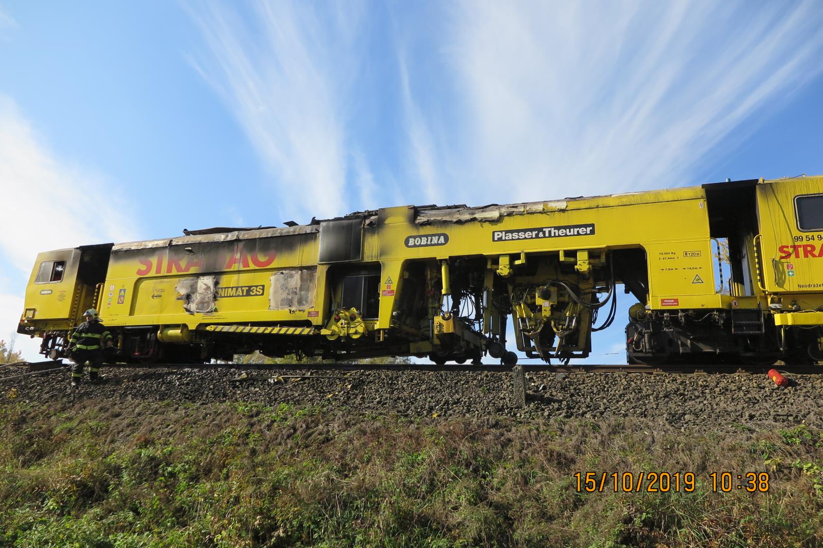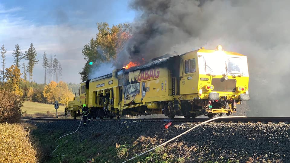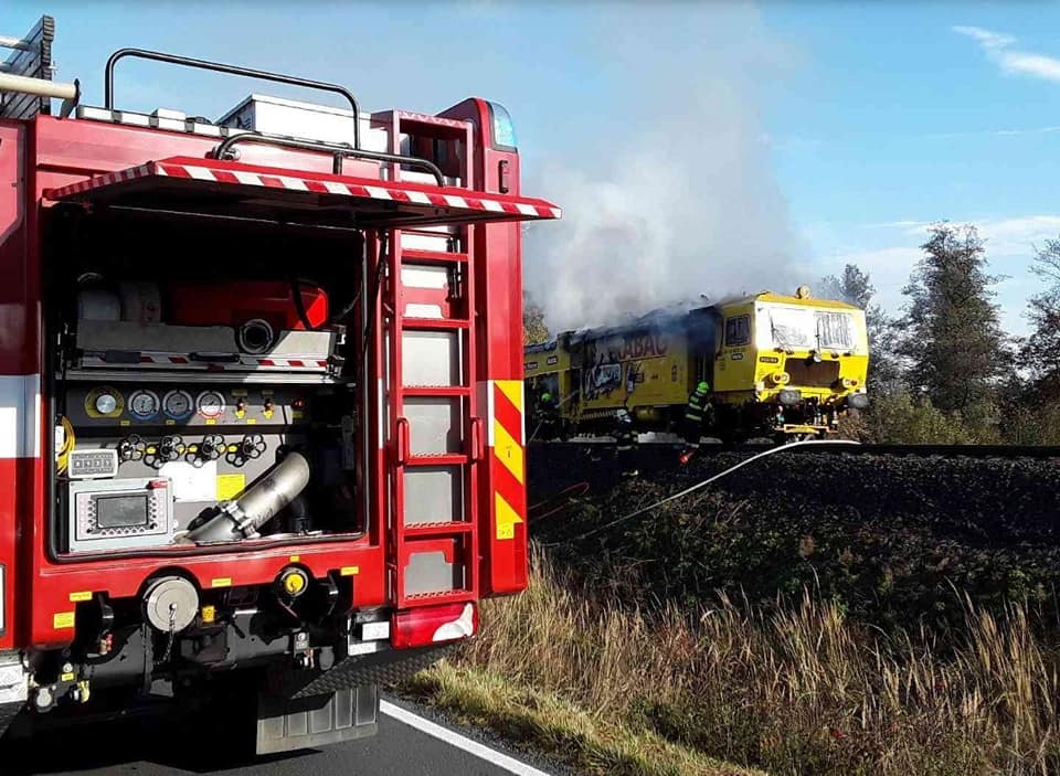 Na trati hořela mnohatunová podbíječka. Požár zdolalo sedm jednotek