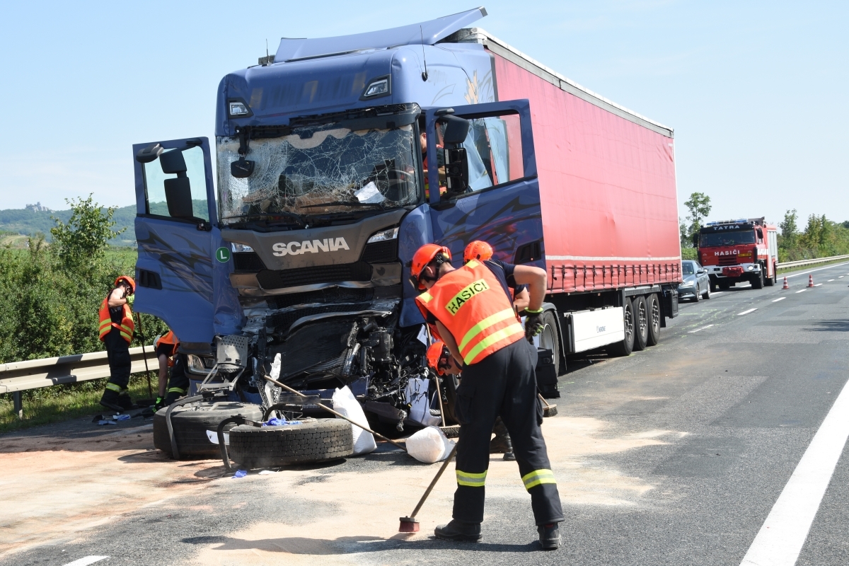 Před půl druhou odpoledne spěchali hasiči k vážné nehodě nedaleko vodní nádrže Nové Mlýny. Šest jednotek hasičů i se speciální výbavou na vyprošťování z nákladních vozidel jelo na 40. kilometr silnice I/52.