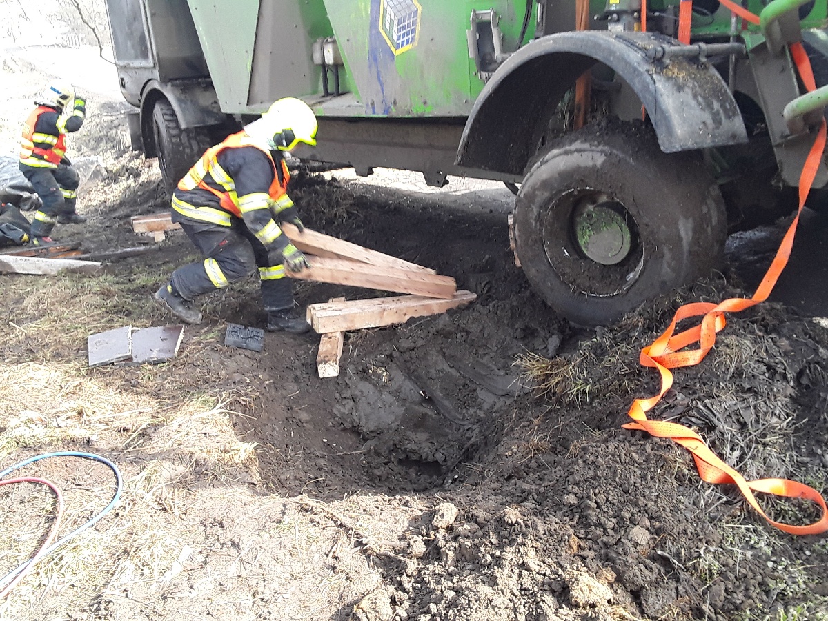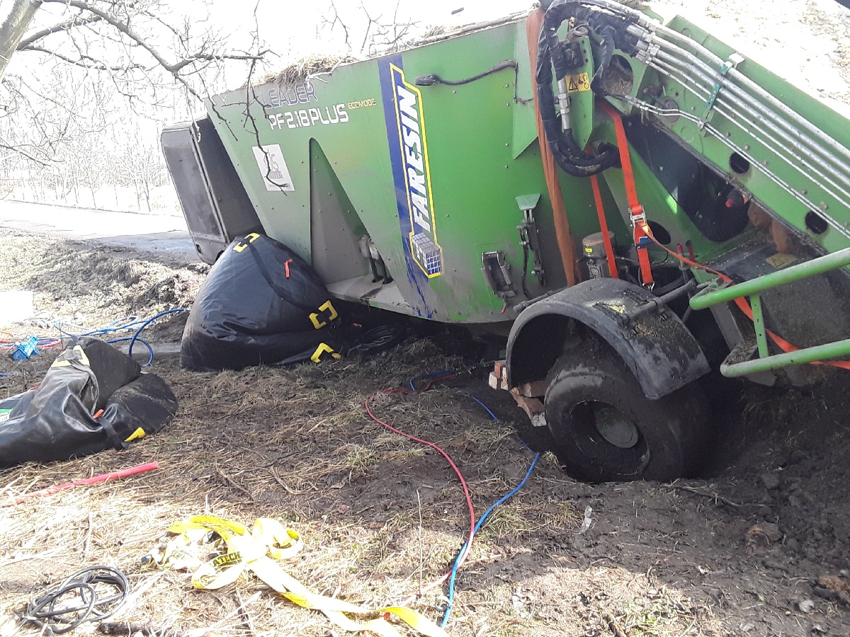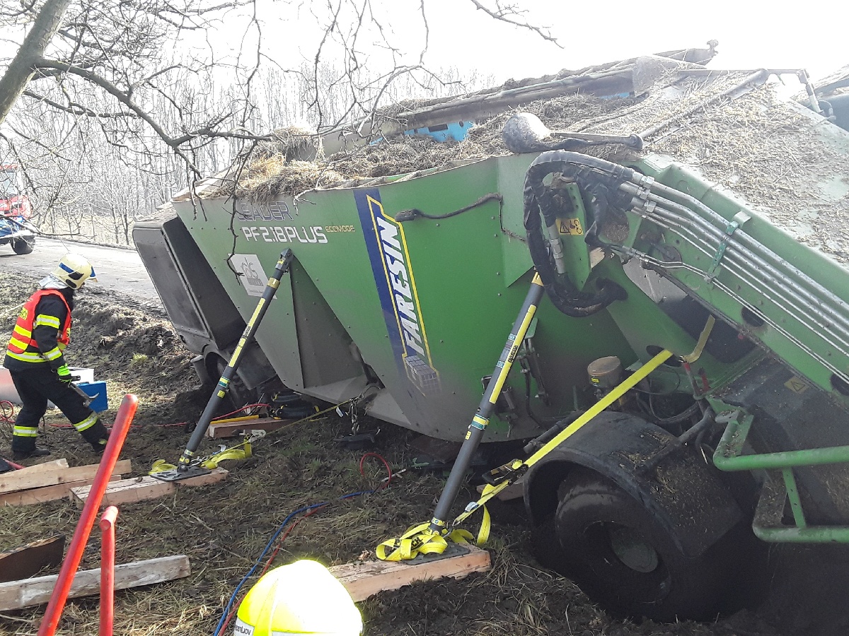 Vozidlo jsme stabilizovali pomocí stabilizačních tyčí a klínů, následně jsme k jeho vyproštění využili 5 kusů vysokotlakých i nízkotlakých zvedacích vaků. S vytažením z podmáčené půdy pomohl pak vyprošťovací automobil, který hydraulickou rukou vozidlo vytáhnul zpět na komunikaci. Do akce byla nasazen i technický speciál s výkonným navijákem. Využít jsme museli kvůli podmáčené půdě rovněž dřevěný podklad, abychom vytažení těžkého zemědělského stroje usnadnili.
