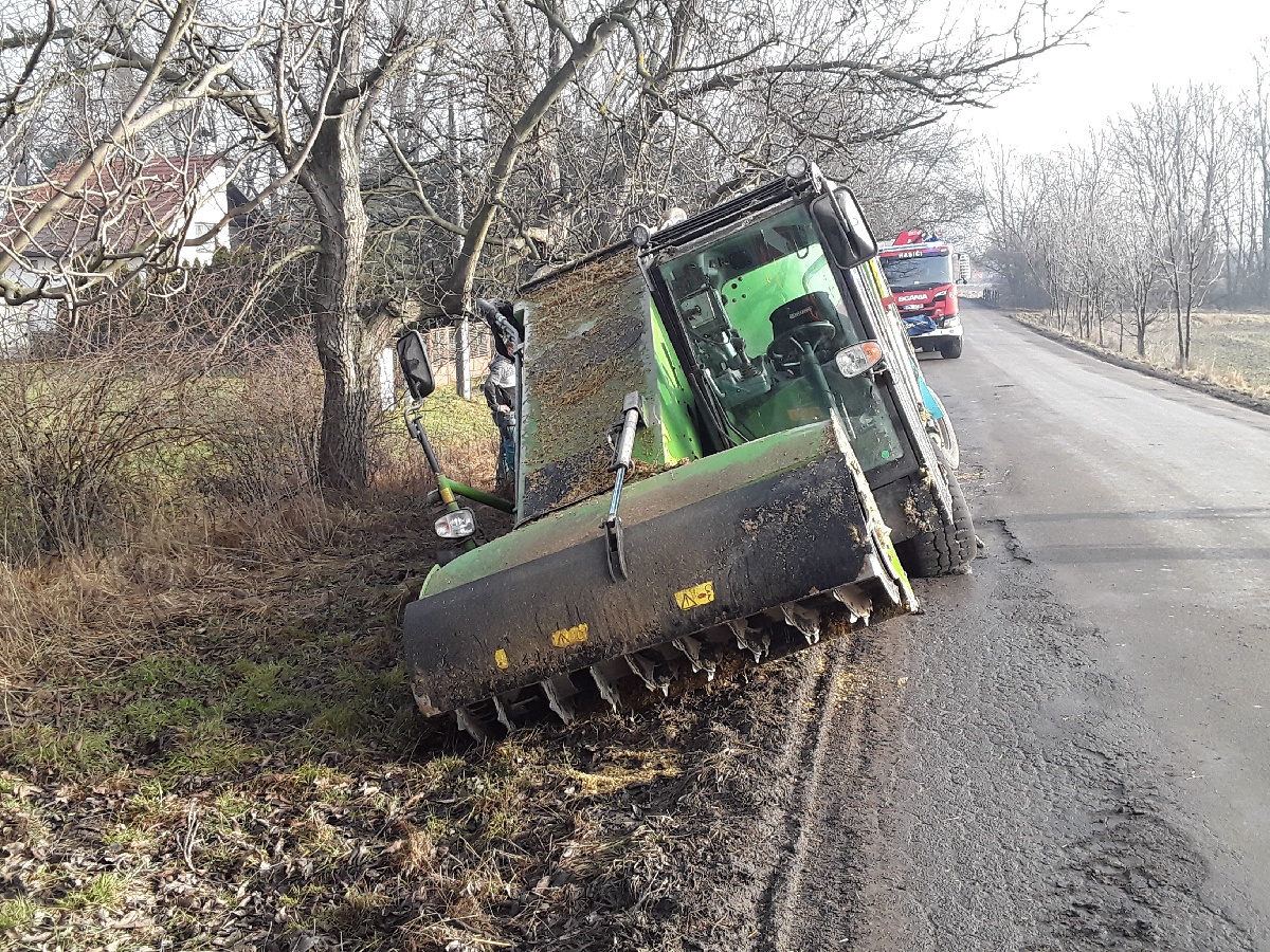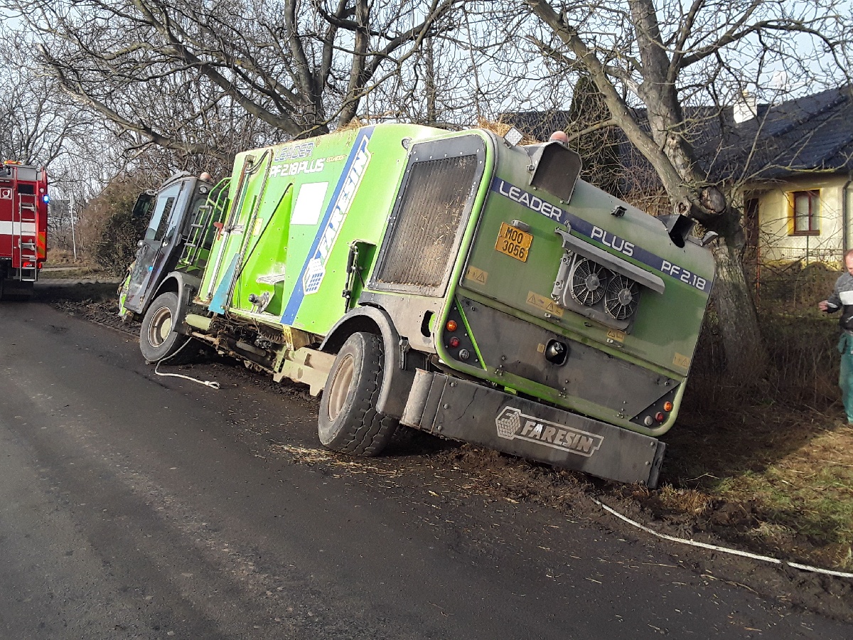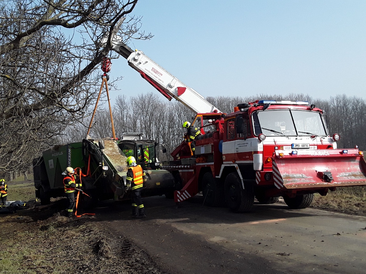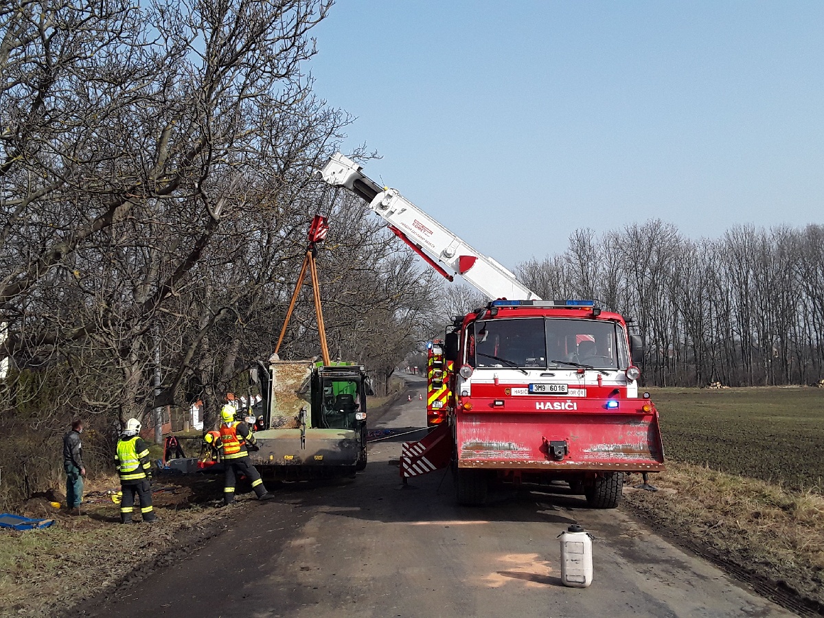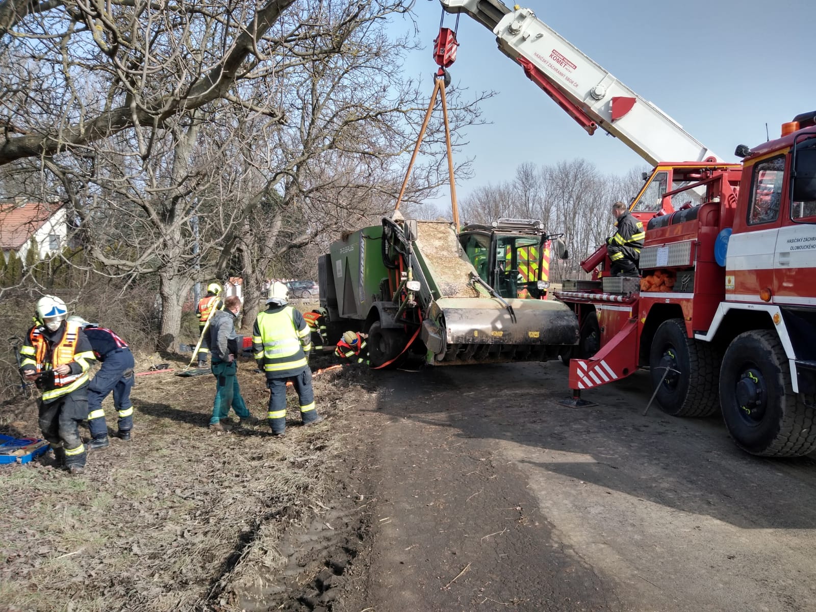 Pod osmnáctitunovým speciálním zemědělským strojem se utrhla krajnice a sjel do příkopy. Hrozilo jeho převrácení. Velitel zásahu po průzkumu a zjištění, že je půda pod strojem a v jeho okolí velmi podmáčená, rozhodnul o povolání vyprošťovacího automobilu a technického speciálu.