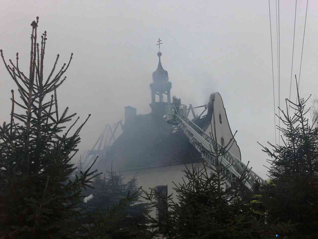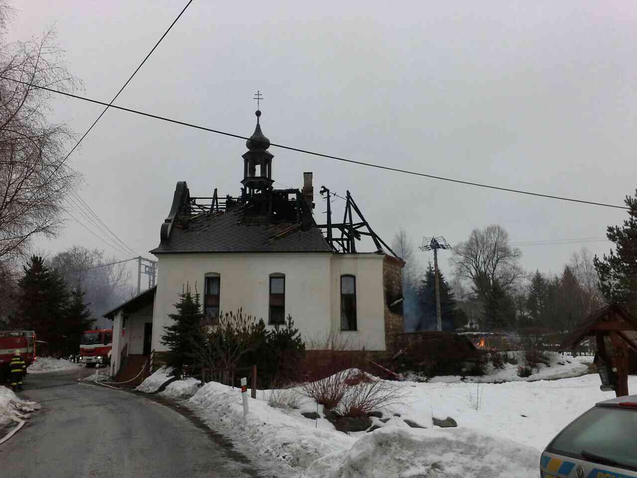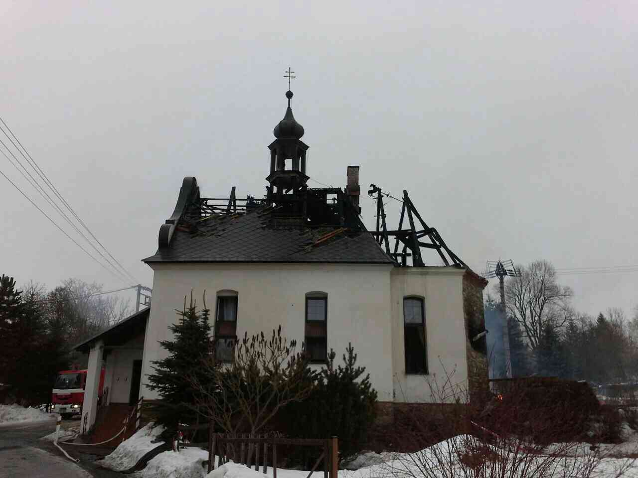 Plameny zničily celou střechu bývalé kaple a vážně poškodily věžičku. Hasiči v průběhu likvidačních prací rozebírali střešní konstrukci, dohašovali skrytá ohniska a odvětrávali zakouřené prostory. Jednotky jsou stále na místě (stav k 17:00 hodině).