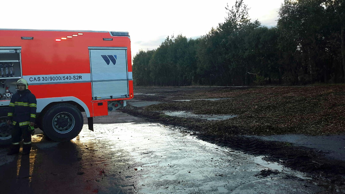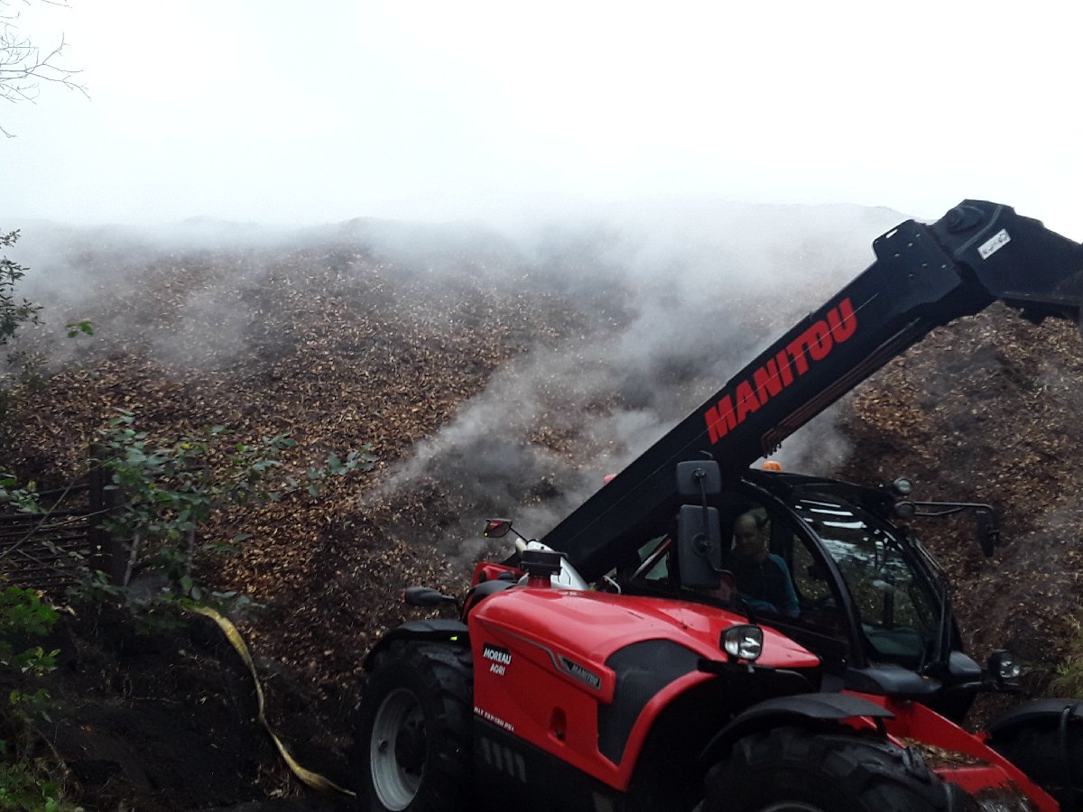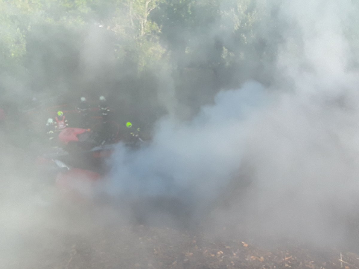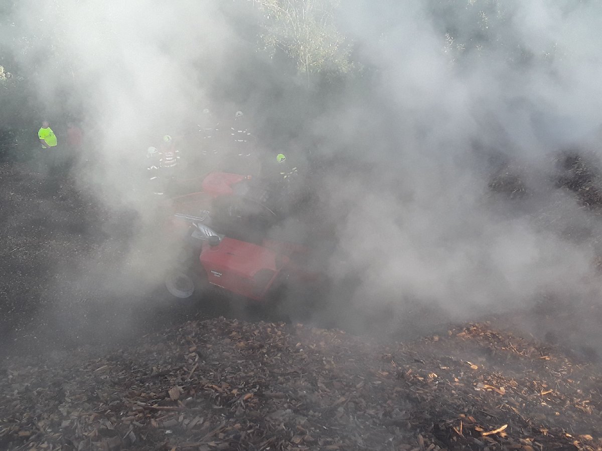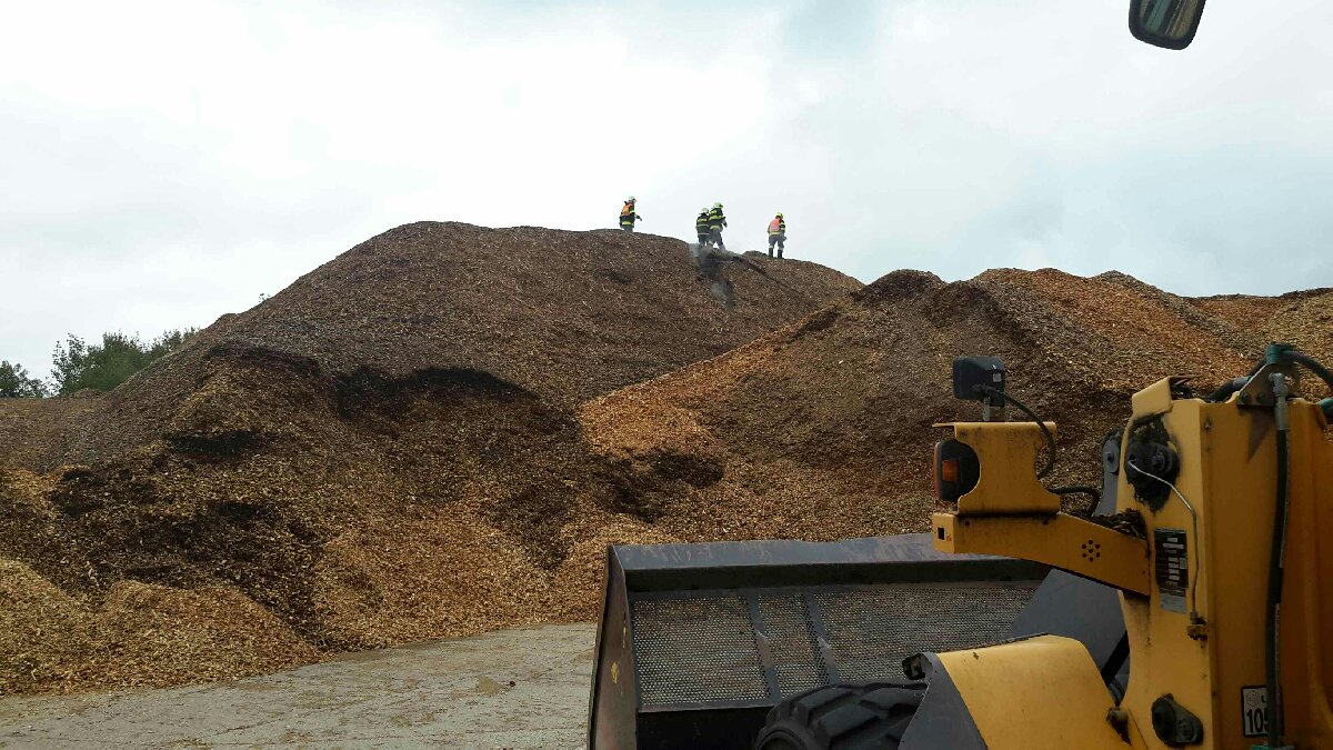 Halda materiálu naskladněná až do výšky 10 metrů o hmotnosti přes 7,5 tisíc tun začala doutnat v neděli před polednem. Po příjezdu na místo hasiči zjistili, že štěpka v jednom z nepřístupných míst hoří plamenem. K ohnisku se museli prořezat motorovými pilami a následně pak zahájili hasební práce. Kvůli hlubokým ohniskům se doutnající a znehodnocený přírodní materiál odvážel těžkou technikou na volné prostranství, kde jej hasiči rozhrabávali a prolévali vodou. Jen za neděli takto odvezli 200 tun štěpky. Práce pokračovaly během celé noci i v pondělí, kdy bylo rozhodnuto o rozdělení haldy na dvě části, aby se zamezilo skrytému šíření požáru.