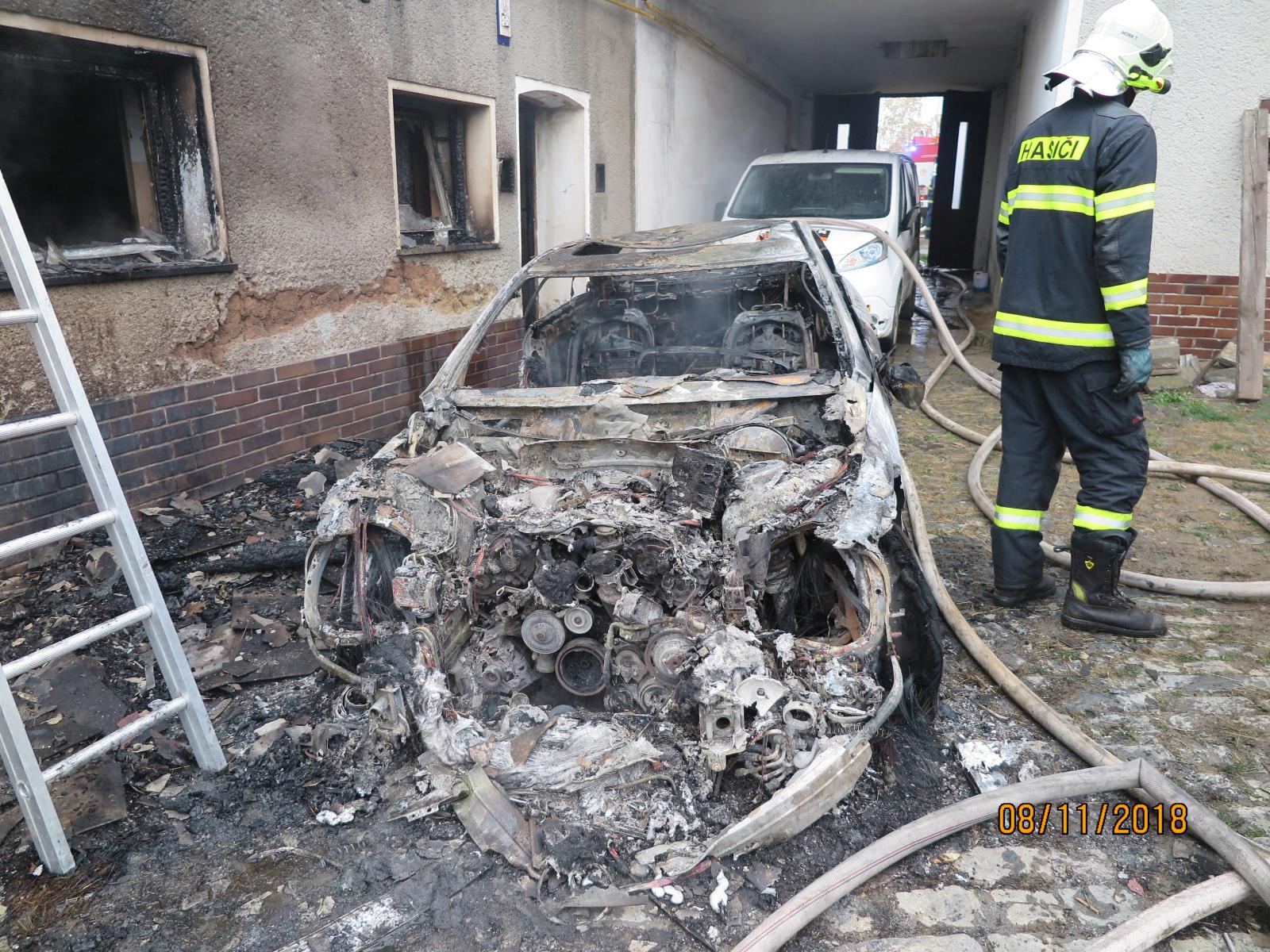 Hluboček. Již v době jízdy k požáru bylo vidět hustý kouř a šlehající plameny. Po příjezdu na místo hasiči zjistili, že hoří přístavba rodinného domu o rozměrech asi 20 x 5 metrů, uvnitř které byla zaparkována osobní vozidla. Plameny zničily jedno zaparkované vozidlo, další dvě poškodily. Oheň se přenesl také na konstrukci a střechu přístavby a částečně byl požárem zasažen i rodinný dům.