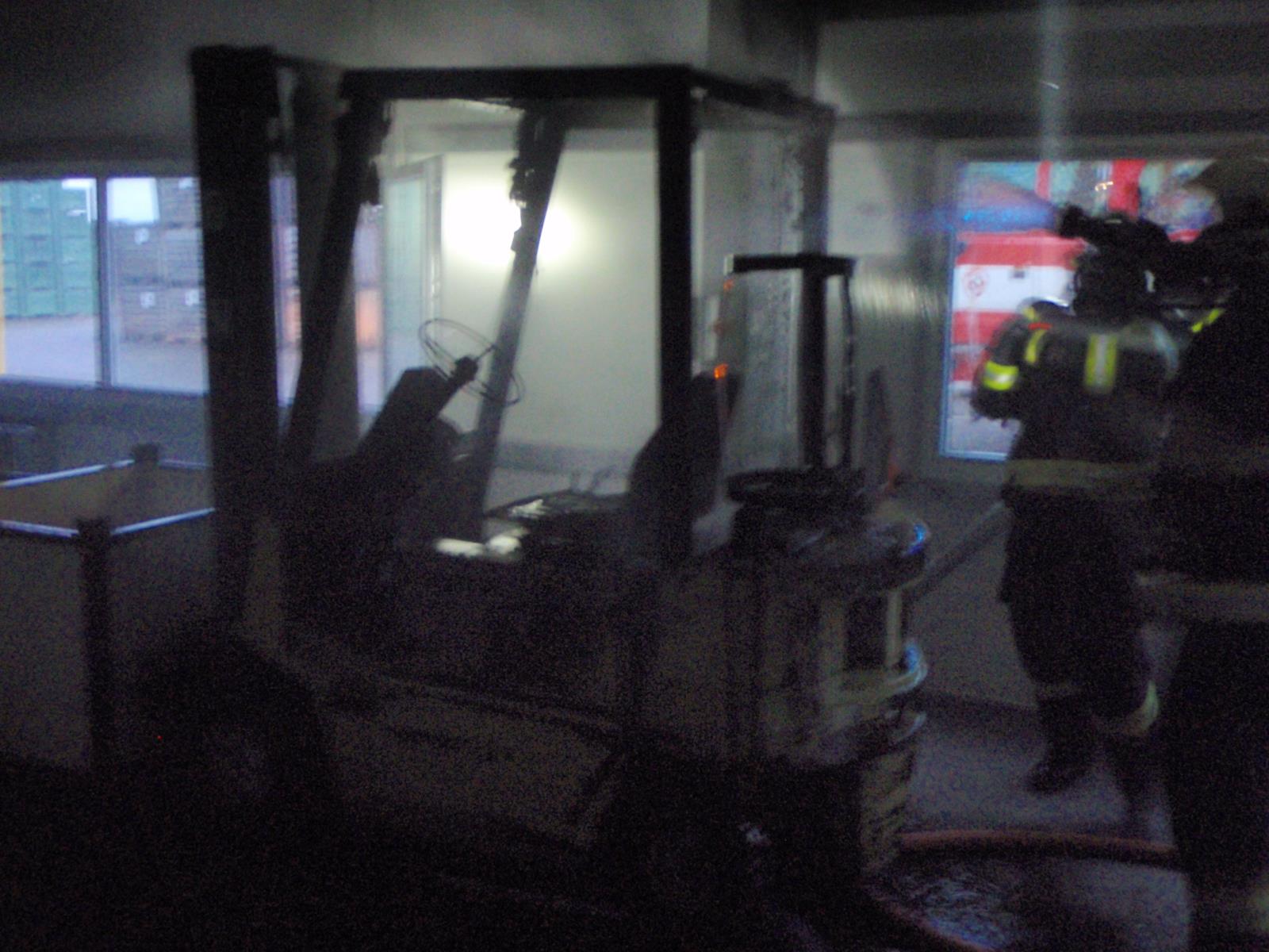 Průzkumem v zakouřené hale nalezli hasiči hořící vysokozdvižný vozík. Velmi rychle se jim podařilo zamezit výraznému rozšíření i přes to ničivé plameny zcela zničily manipulační stroj a také halovou konstrukci. Během své činnosti z prostor vynesli dvě tlakové láhve. Prostory hasiči ochladili a odvětrali pomocí přetlakových ventilátorů.