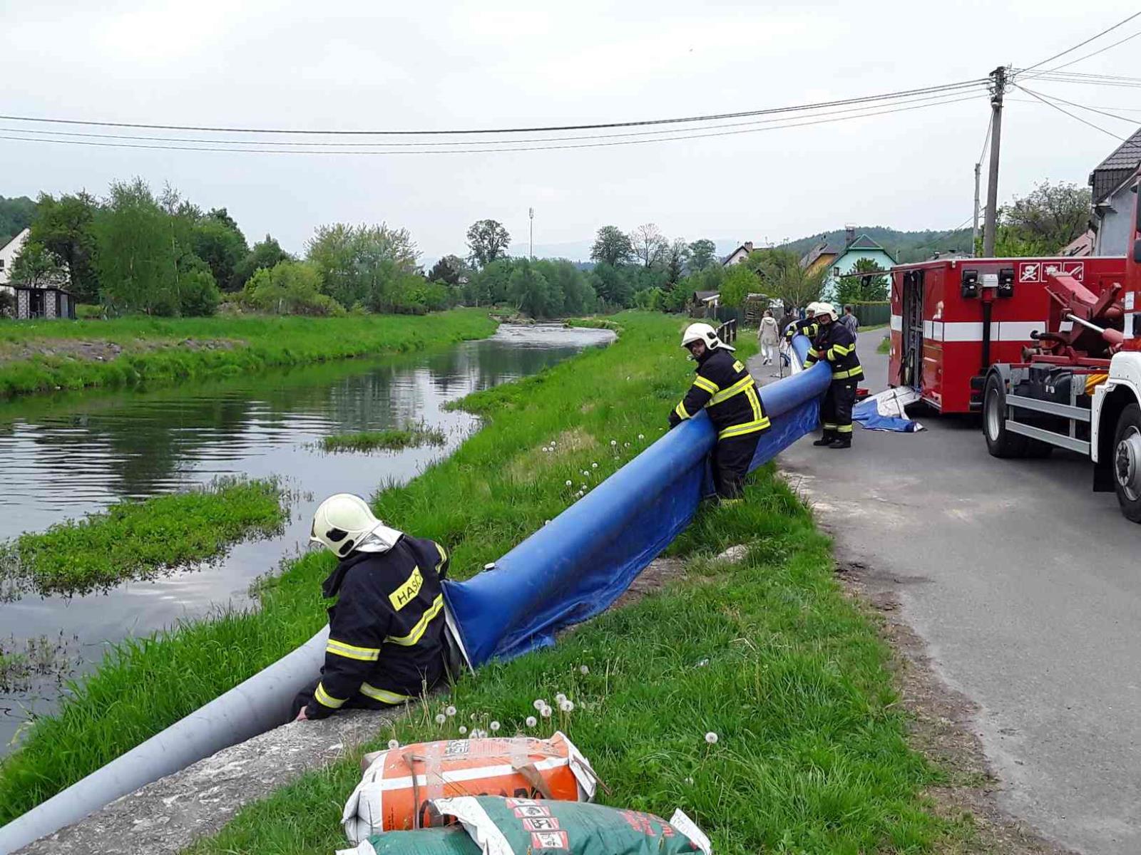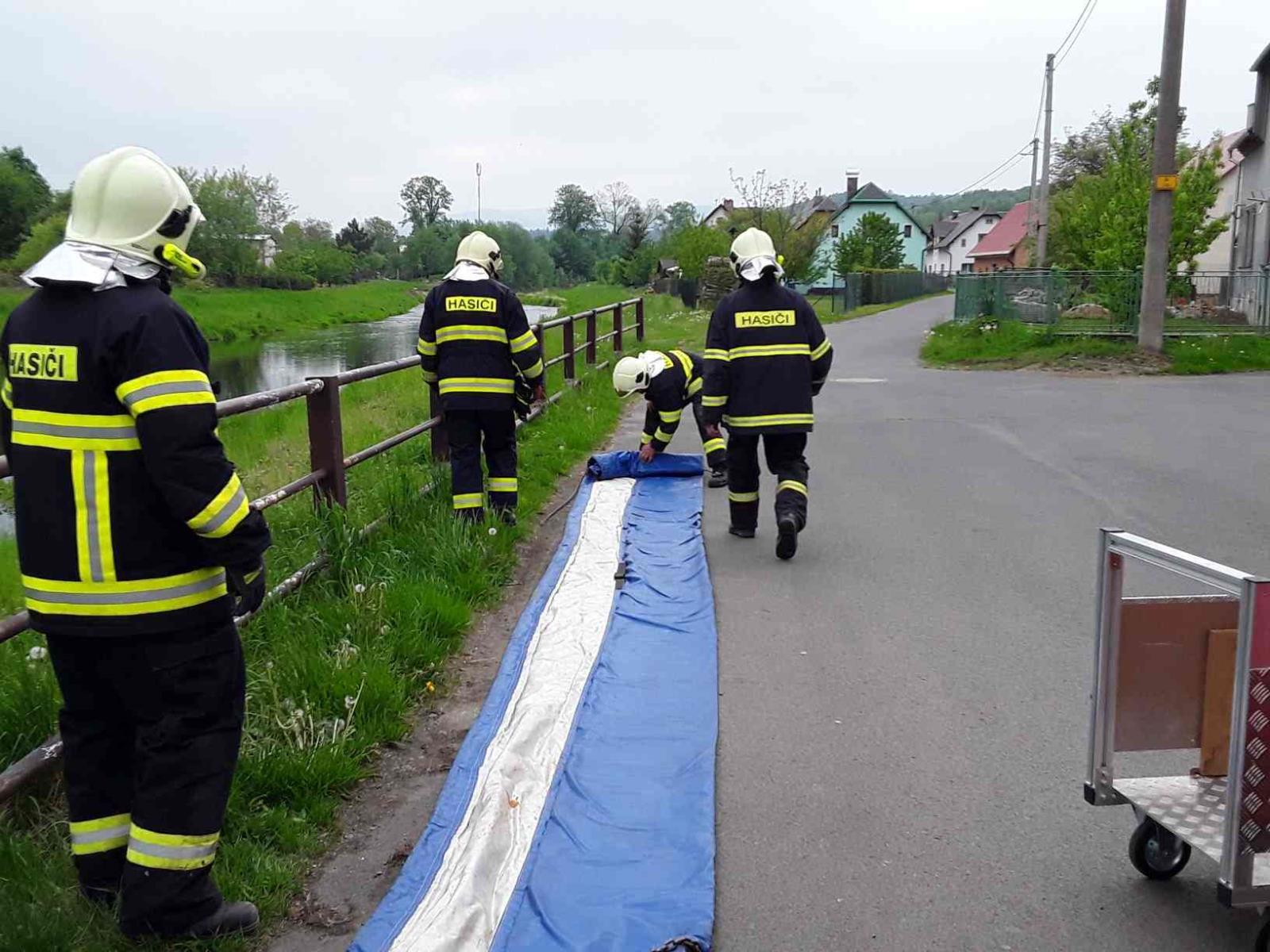 Hasiči v prvotní fázi po zabezpečení úniku provozních látek a asistenci při ošetření zraněné osoby zahájili výstavbu norných stěn.