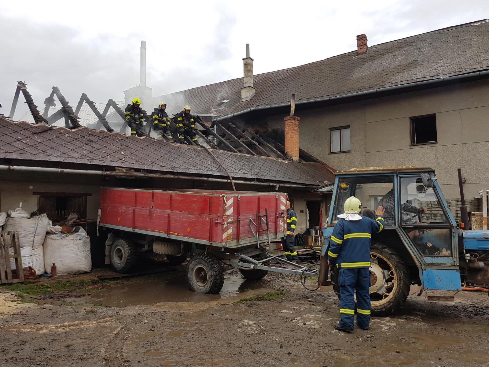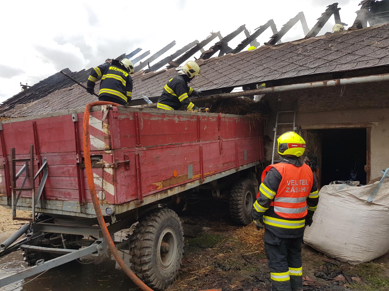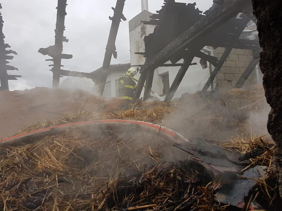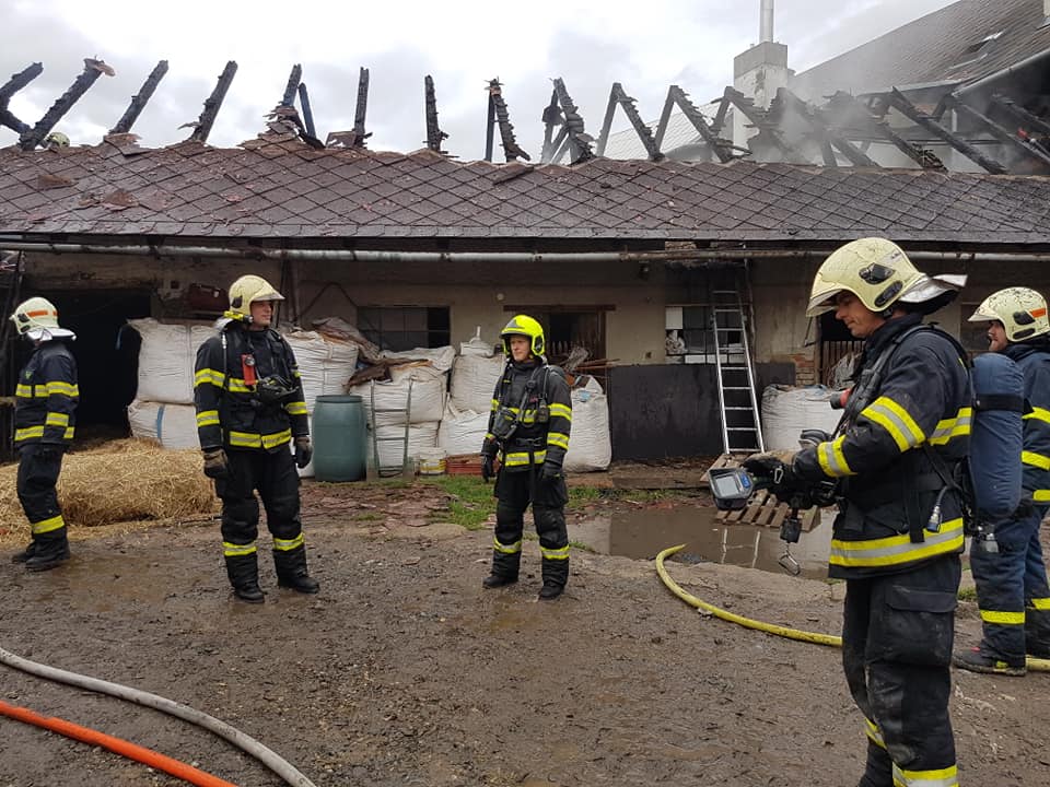 Střechu hospodářské budovy hasily v pondělí odpoledne čtyři jednotky profesionálních i dobrovolných hasičů v Třebčíně, místní části Lutína.