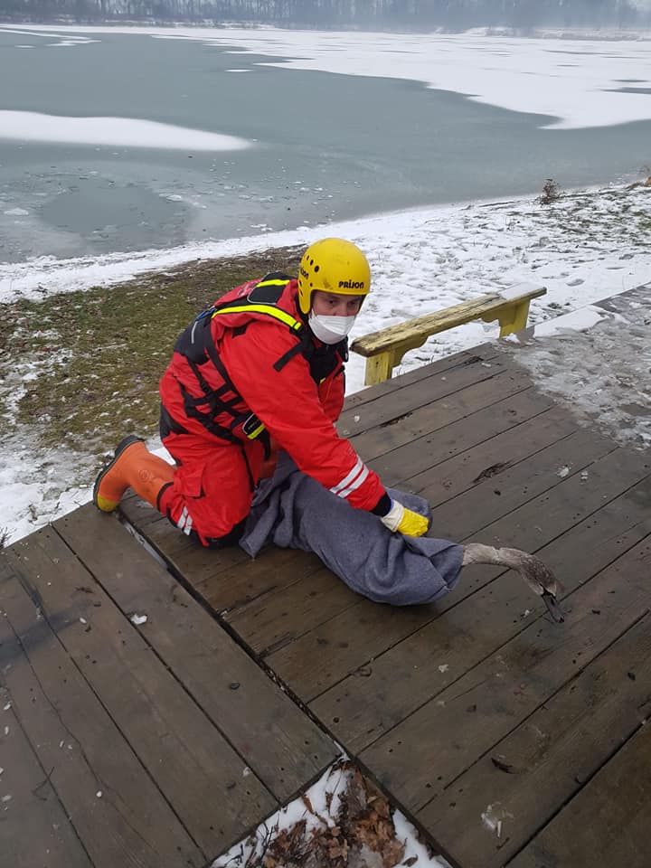 Na Štědrý den odpoledne jsme pak zachraňovali labutí mládě. Mělo poraněné křídlo, které mu přimrzlo k hladině na přírodním koupališti Jadran u Oseku nad Bečvou na Přerovsku. Labuti jsme křídlo opatrně vysvobodili a dostali ji na břeh. Poté byla dobrovolnou jednotkou z Oseku nad Bečvou převezena na záchrannou stanici Ornis v Přerově, kde se o ni postarali odborníci a ošetřili jí zranění. V souvislosti s mrazivým počasím a záchranami zvířat z vodních ploch bychom chtěli poprosit veřejnost, aby před tísňovým voláním nejprve ověřila, zda zvíře potřebuje skutečně odbornou pomoc záchranářů. Setkáváme se totiž mnohdy i s případy, kdy vyjíždíme ke zcela zdravým jedincům, kteří na zamrzlé hladině pouze odpočívají a nejeví žádné známky zranění. Po příjezdu jednotky pak spokojeně odkráčejí na jiné místo, jako se to stalo například na Štěpána v Litovli, kde měly na Olomouckém rybníce údajně přimrznout dvě dospělé labutě.