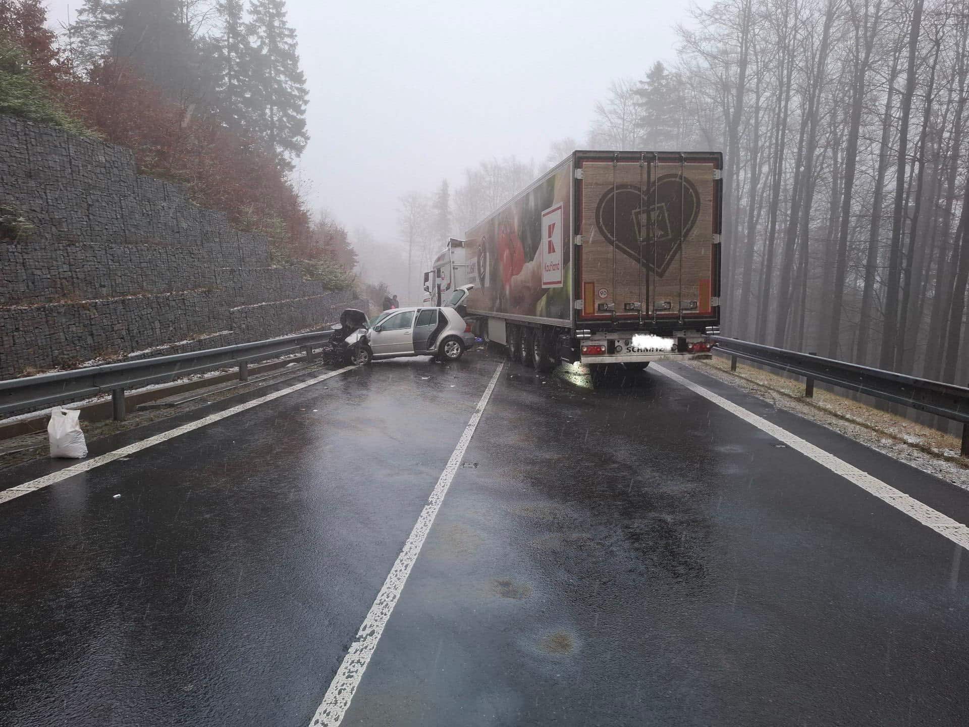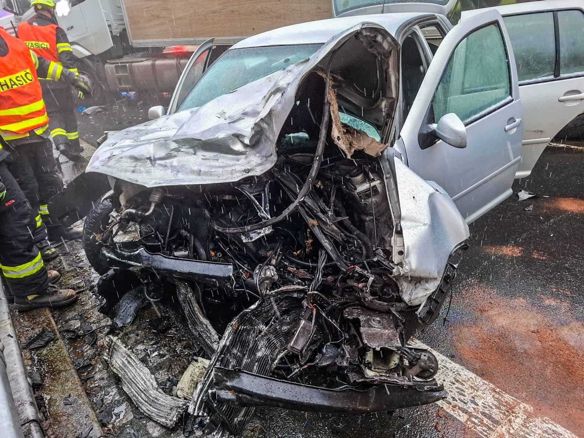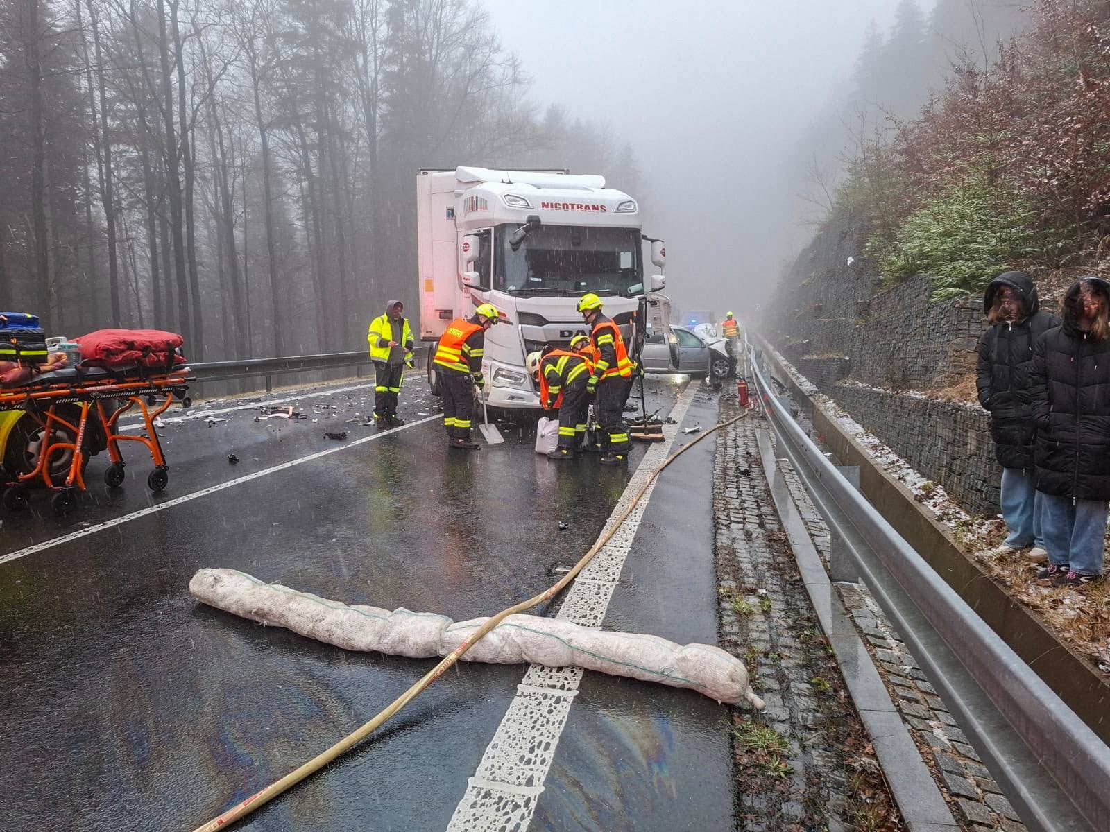 Zásah probíhal v těsné blízkosti kamionu, který zůstal po střetu částečně v jízdním pruhu. Jeho poloha komplikovala průjezd a zároveň zvyšovala riziko další kolize. I proto se velitel zásahu rozhodl přivolat automobilový jeřáb.