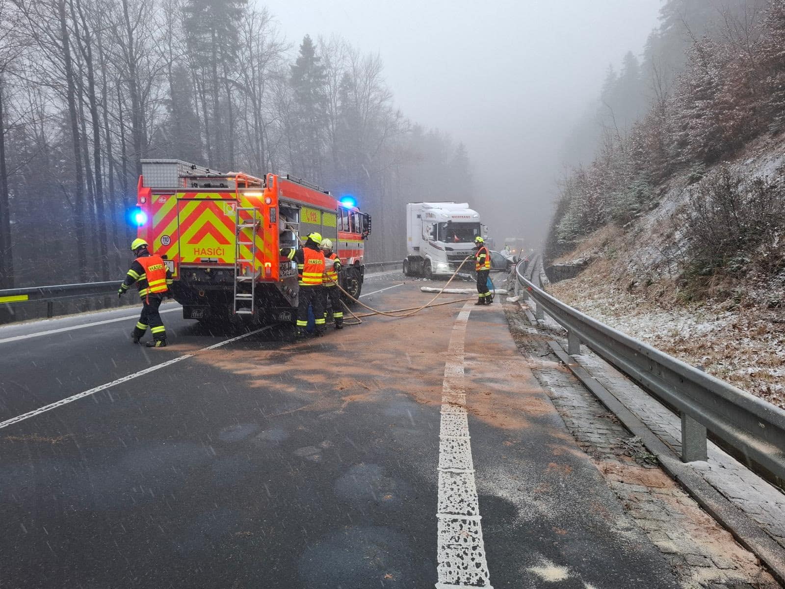 Srážka kamionu s osobním autem zablokovala silnici: Hasiči řešili únik kapalin i vyproštění vozidla
