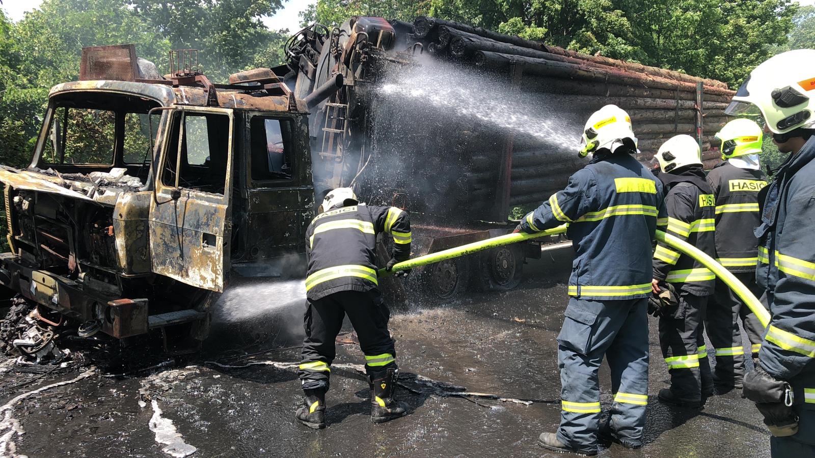 Čtyři jednotky hasičů Olomouckého kraje vyjížděly ve čtvrtek 21.6.2018 krátce po poledni k dopravní nehodě s následným zahořením motocyklu a nákladního vozidla se dřevem.