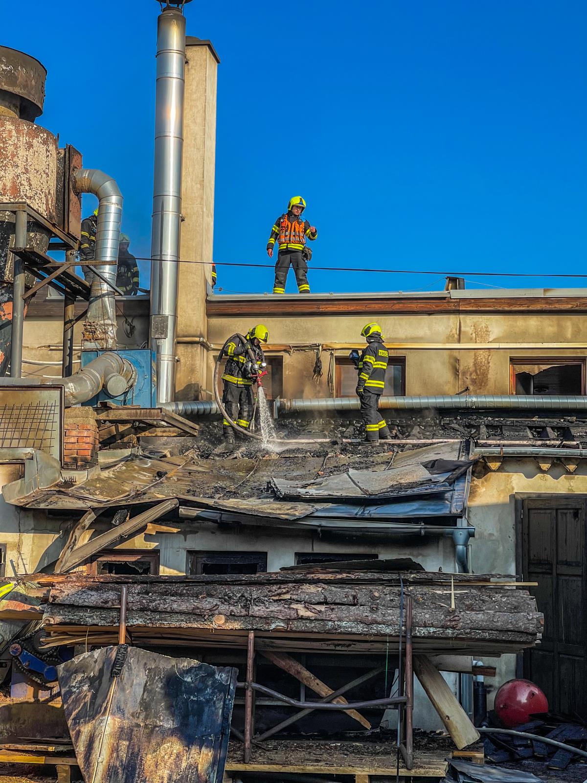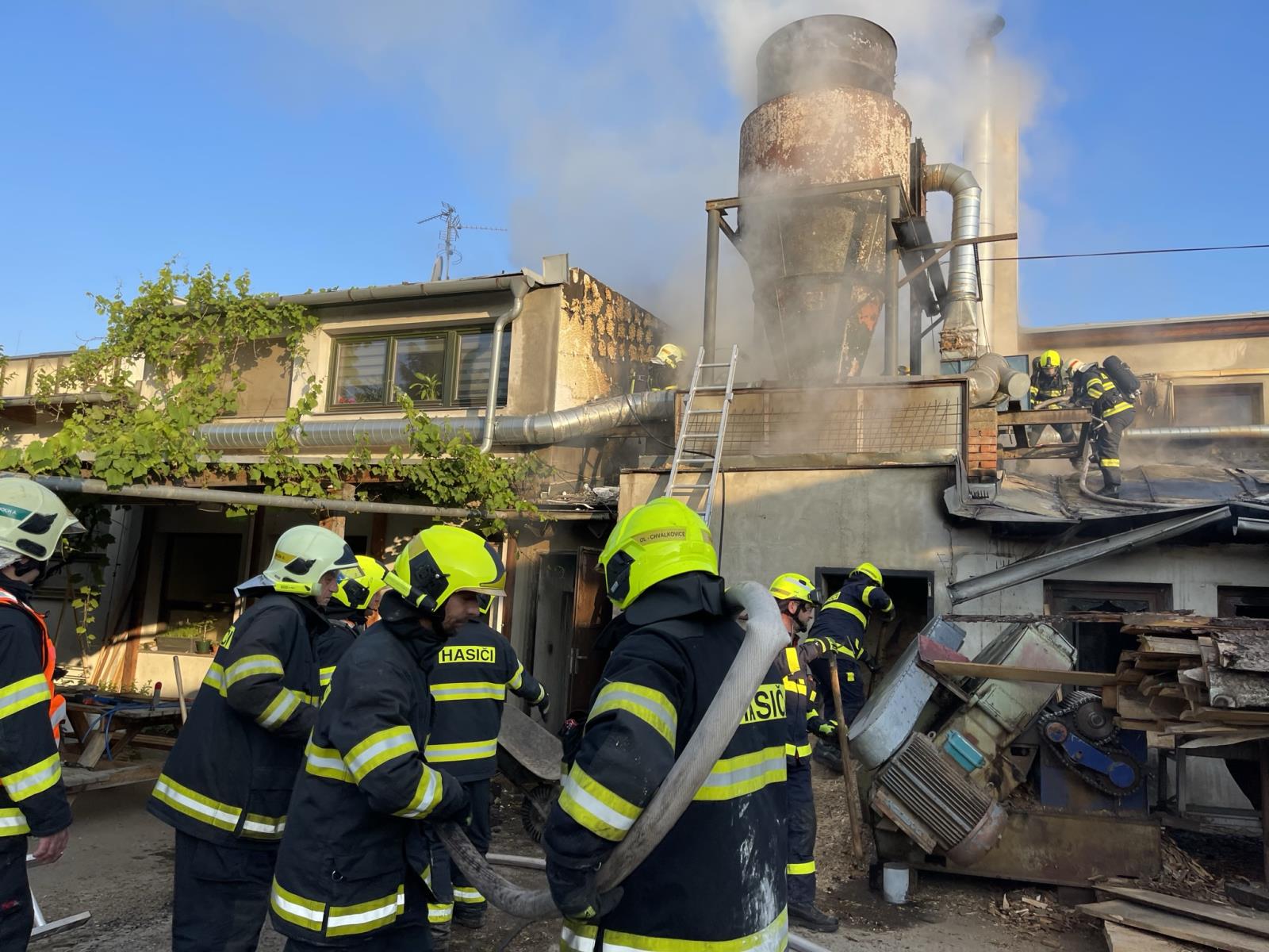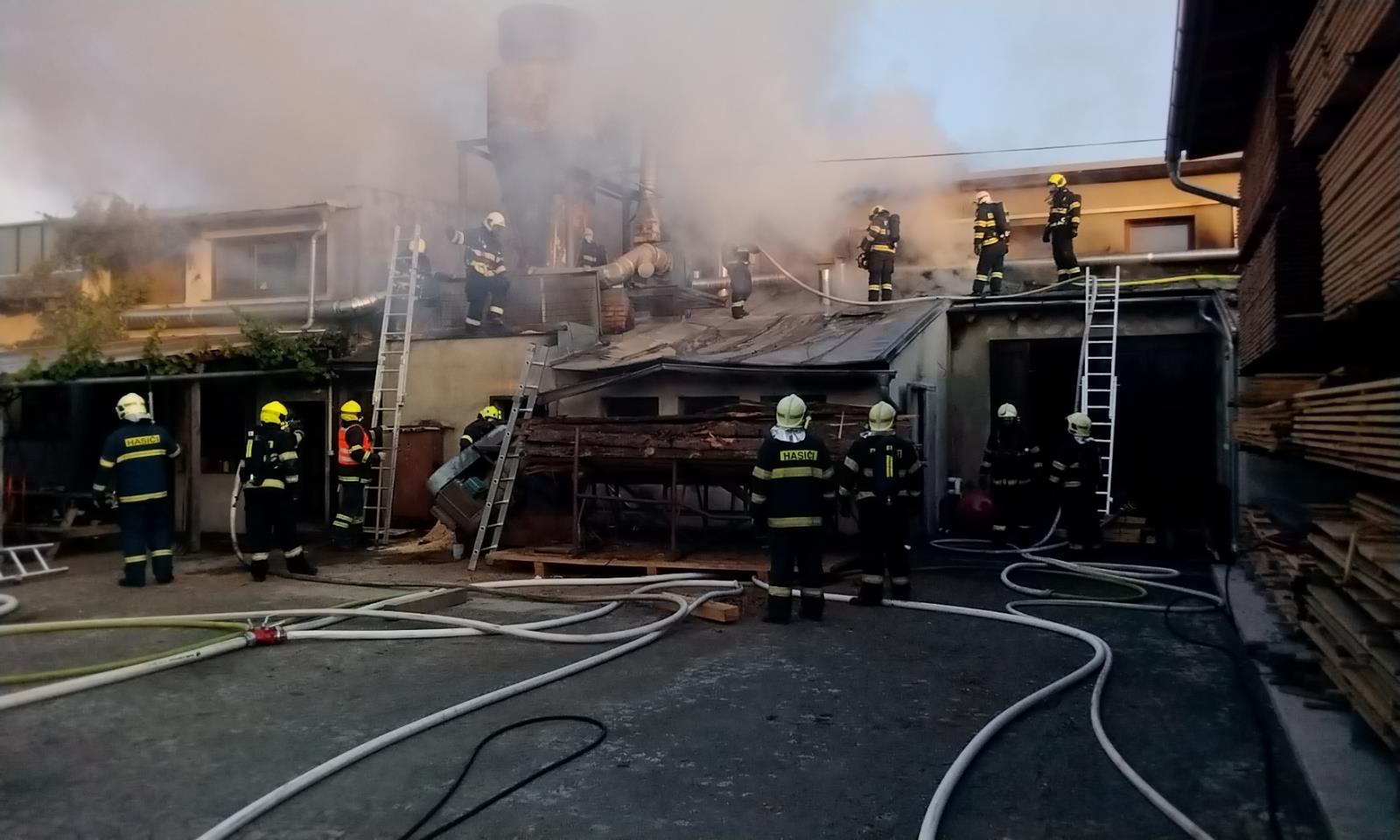 Při průzkumu bylo zjištěno, že hoří objekt s dřevařskou technologií, dílnou a obytnou částí v prvním patře, který přímo sousedí s dalšími budovami a nachází se uvnitř skladu se dřevem. Kromě hasebních prací jsme se tak museli zaměřit i na ochranu obytné části budovy a dalších objektů. Zásah probíhal v dýchací technice. Jakmile jsme zabránili šíření plamenů, vyhledávali jsme skrytá ohniska v konstrukcích a dohašovali je. Část střechy jsme museli rozebrat. Ze zásobníku jsme vyskladnili velké množství pilin, část jsme odvezli nakladačem.