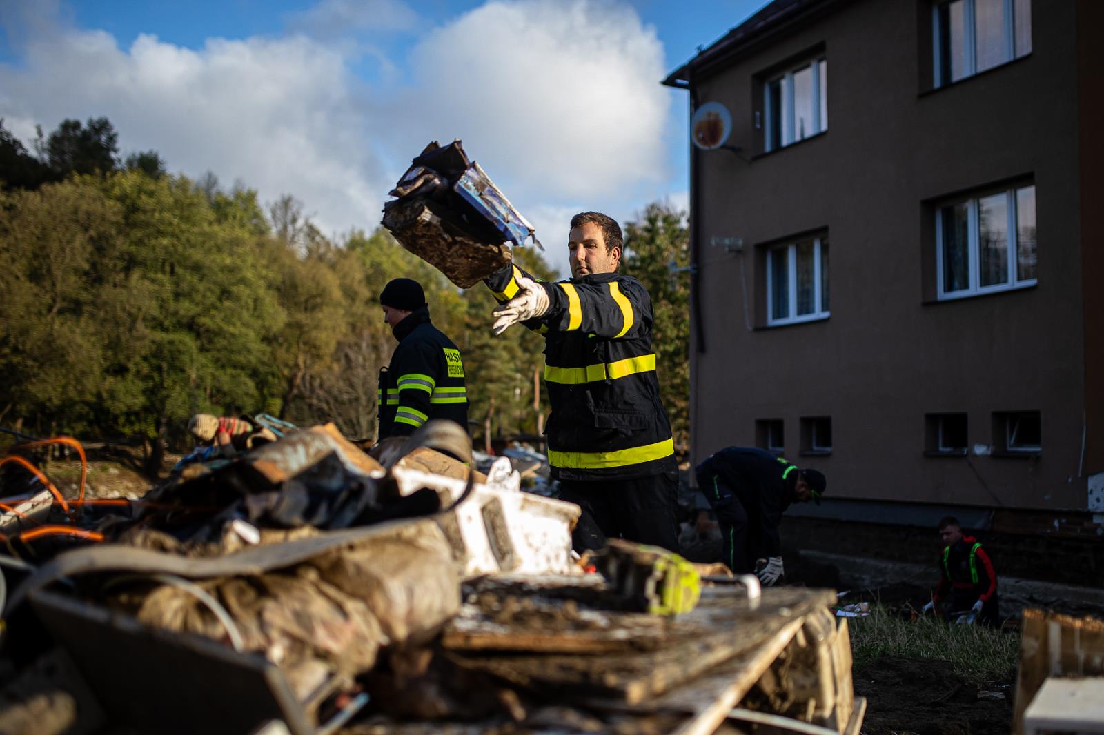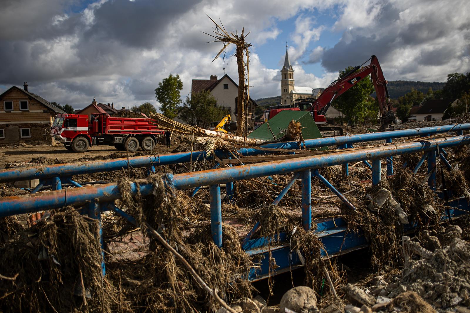 Nakládáme a odvážíme dále odpad, pomáhají nám sklopné Tatry záchranného útvaru. Dnes posílíme také naši flotilu Bobcatů – pásových nakladačů, které nám spolu s nákladními vozidly usnadní odvoz sutin, naplavenin a dalších materiálů na jednotlivá deponia. V tuto chvíli pracuje v území na 30 různých typů nakladačů. Ve spolupráci se záchranným útvarem také na jednotlivých deponiích připravujeme podloží a rozšiřujeme je.