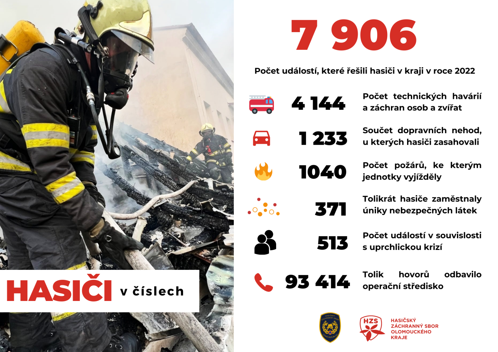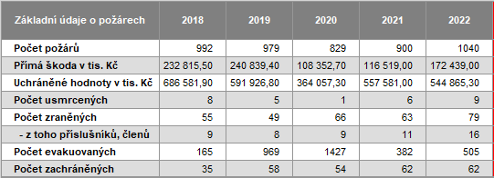 Loni jsme hasili 1040 požárů, což je nejvyšší číslo za poslední čtyři roky. Naše statistiky evidují o 140 požárů víc než v roce 2021. Zachránili jsme při nich 62 lidí, 505 osob jsme evakuovali. V přímé souvislosti s požárem loni zemřelo 9 lidí. To je nejvíce za poslední čtyři roky. Při požárech se zranilo 79 lidí a také 16 hasičů a byly při nich způsobené přímé škody za téměř 175 milionů. Díky včasným zásahům se nám podařilo uchránit majetek za více než půl miliardy korun.