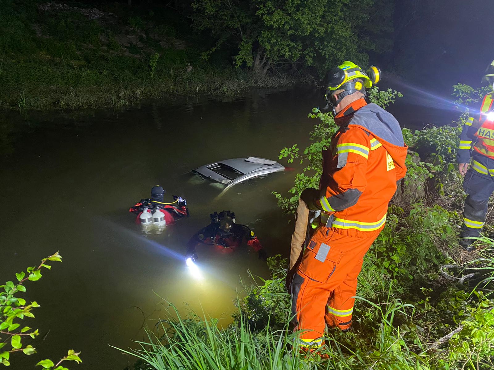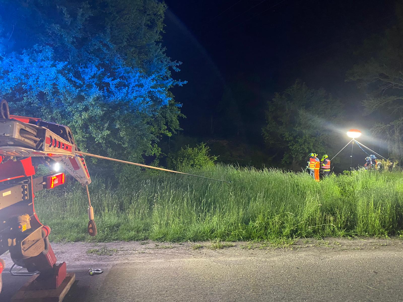 21.5.2021 Osobní automobil z mlýnského náhonu u Kojetína vyprošťovali profesionální a drážní hasiči ve čtvrtek večer. Řidič a spolujezdec skončili svou jízdu s vozidlem ve vodě.