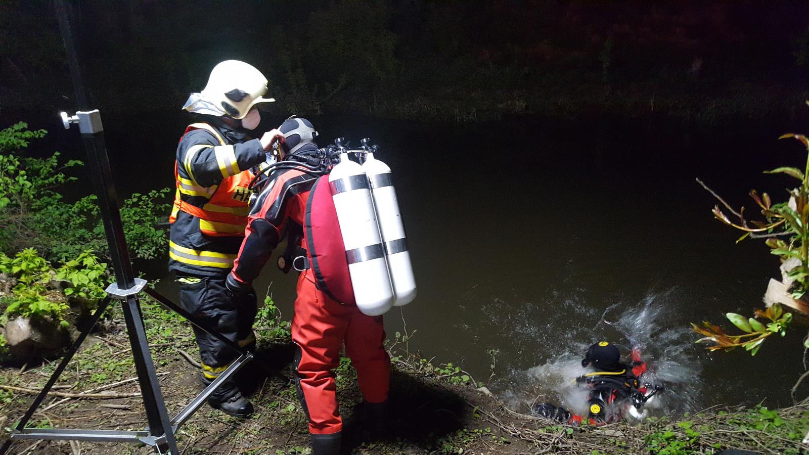Hasiči-potápěči ze stanice Lipník nad Bečvou ponořený automobil zajistili lany ve spodní části