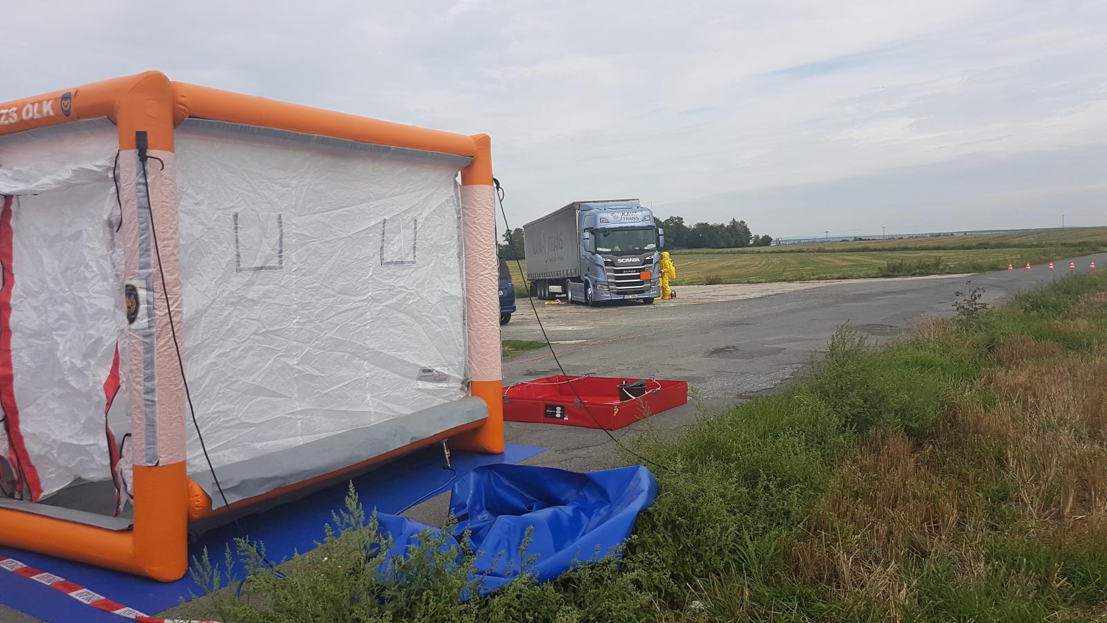 Na místo vyjeli profesionální hasiči z Přerova, kteří po příjezdu zjistili, že z odstaveného kamionu uniklo asi 500 l chlornanu sodného, který řidič převážel v nádrži o objemu 1000 l. Látka unikla jak do půdy, tak na zpevněnou odstavnou plochu, proto velitel zásahu povolal na místo pracovníky životního prostředí.