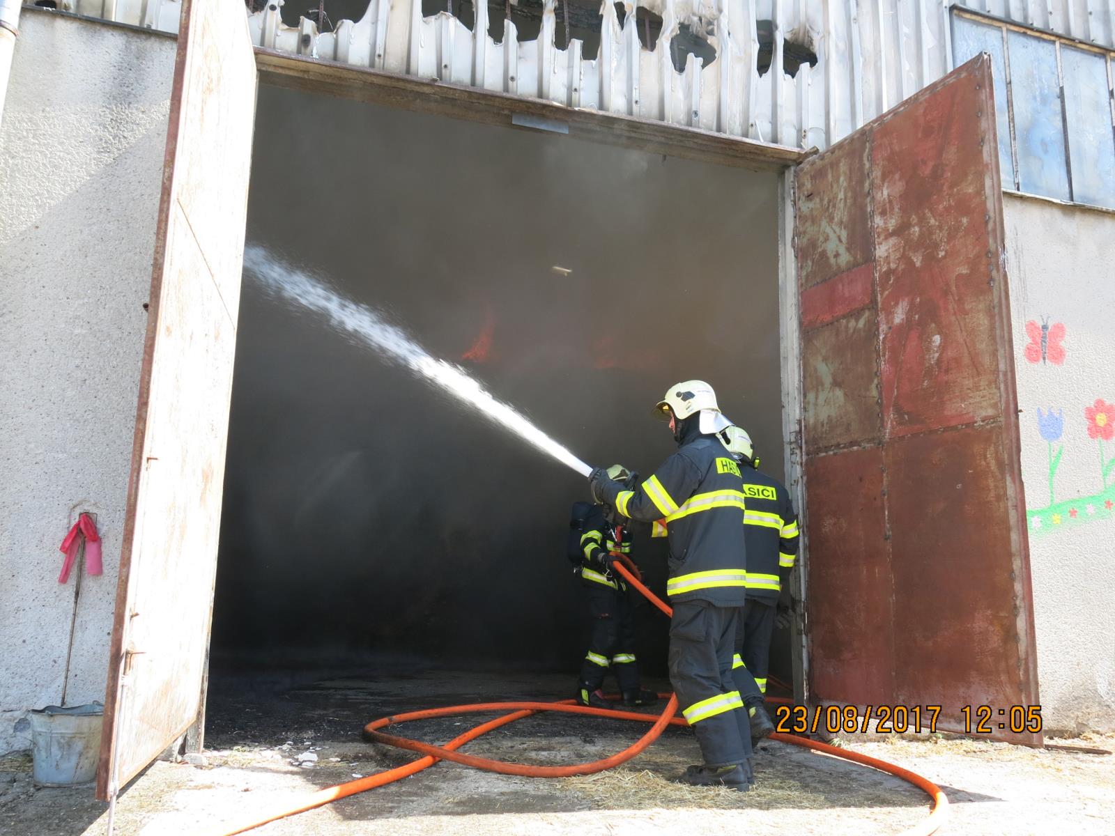 Zásah u požáru skladovací haly se slámou pokračuje i dnes.