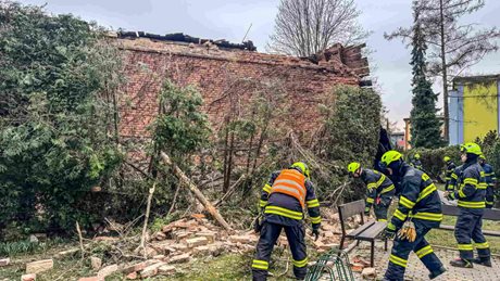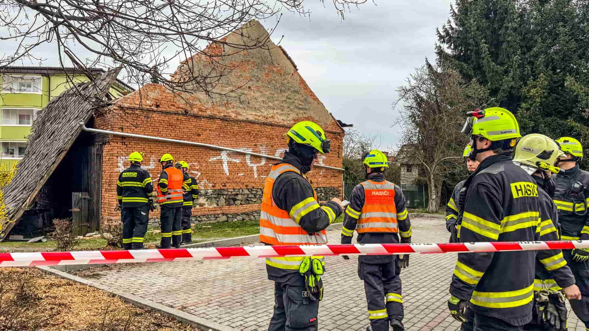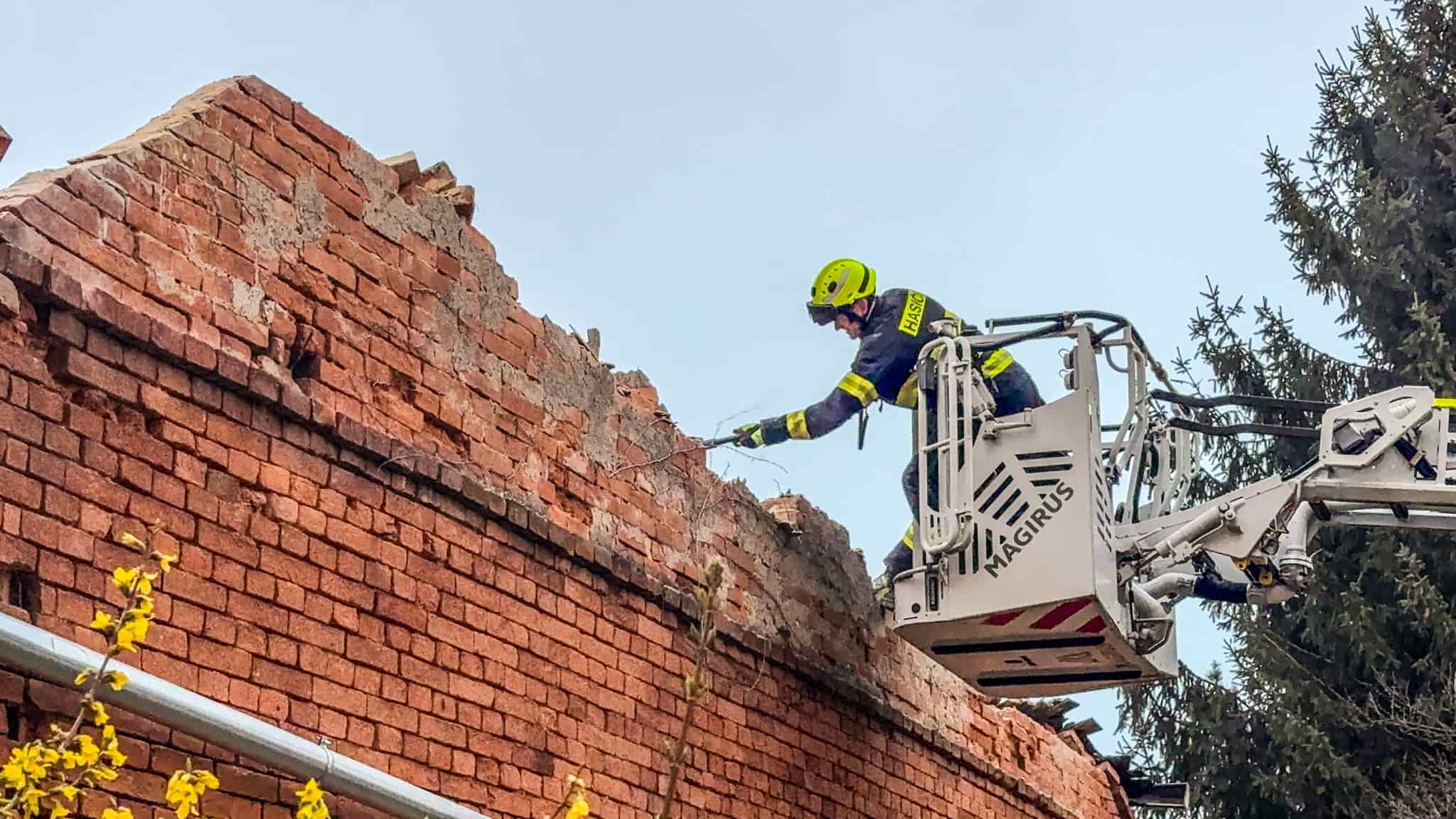 Z objektu se zřítila štítová zeď a část střechy, která dopadla až na přilehlý chodník. Hasiči po příjezdu vyhodnotili situaci jako nebezpečnou a okamžitě zajistili prostor proti vstupu veřejnosti. Následně zahájili práce na odstranění nestabilní části konstrukce. Pomocí výškové techniky postupně rozebrali hrozící zeď tak, aby nedošlo k dalšímu samovolnému pádu. Zásah probíhal s důrazem na bezpečnost zasahujících i obyvatel v okolí.