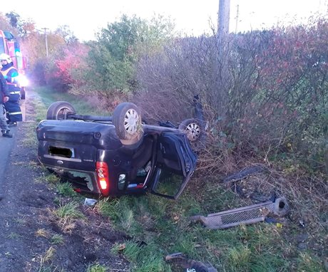 Auto po nehodě skončilo na střeše, zraněného zachraňovali hasiči