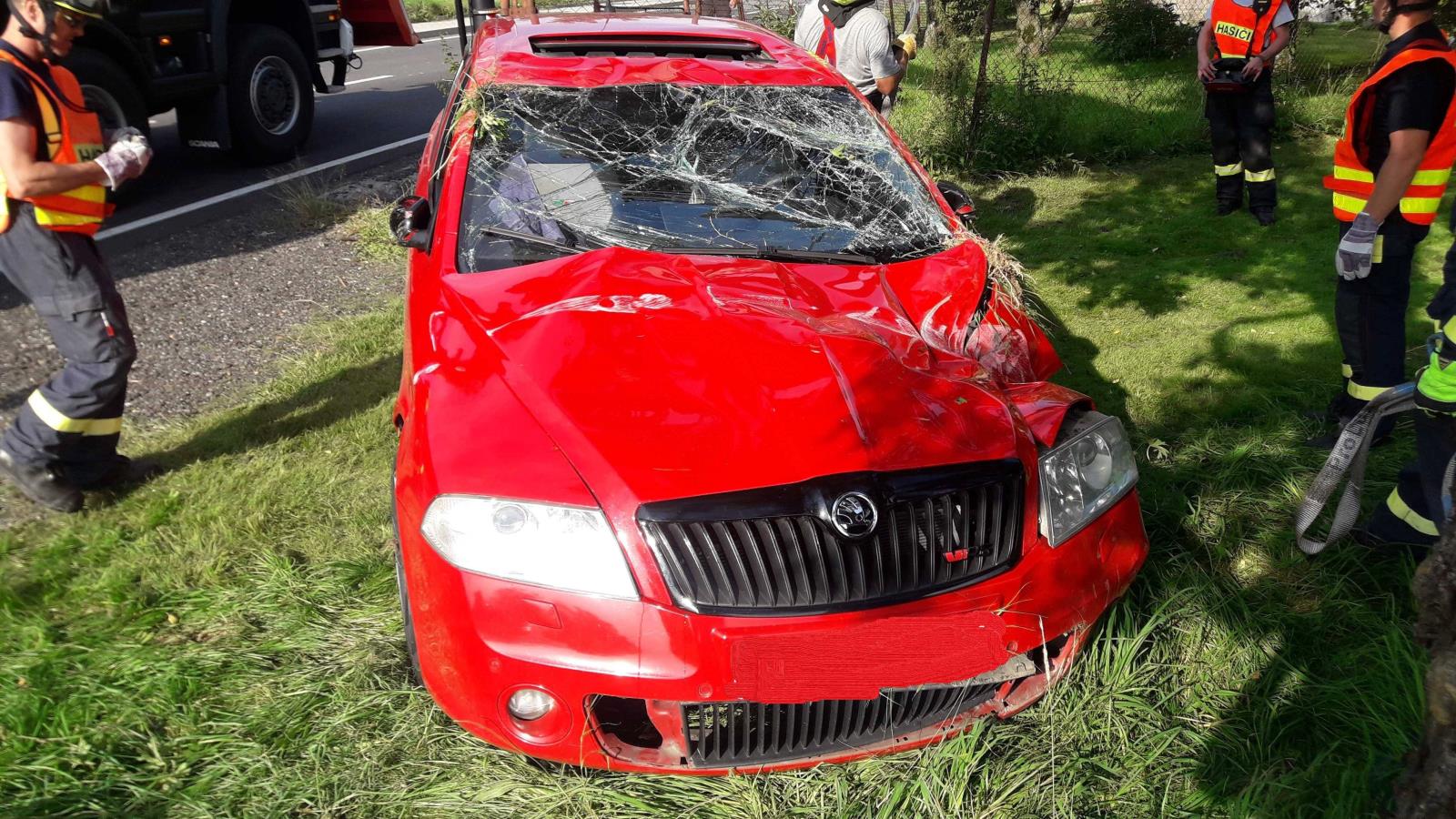 Automobil ve Zhoři na Svitavsku skončil na střeše mimo komunikaci