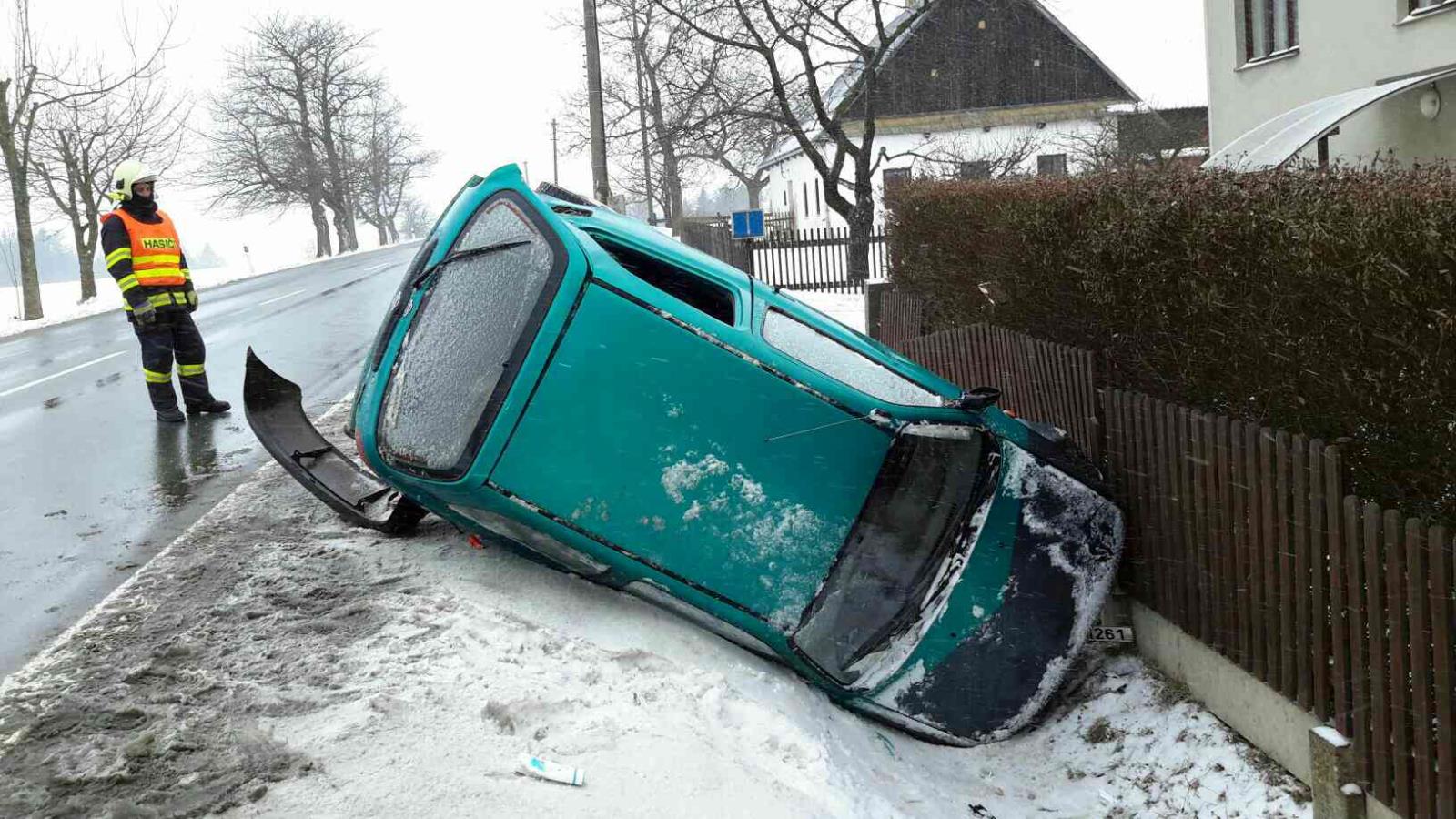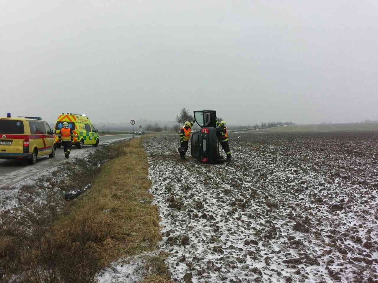 Ve Strašově na čerstvém sněhovém poprašku havarovalo i osobní auto, které skončilo na střeše. Událost byla, 6. března 2018, v 8.12 hodin nahlášena na operační a informační středisko hasičů. Na místo vyjela jednotka z Přelouče. Při této nehodě byly zraněny tři osoby a ihned předány zdravotníkům. Hasiči dále zajistili vozidlo a převrátili zpět na kola.