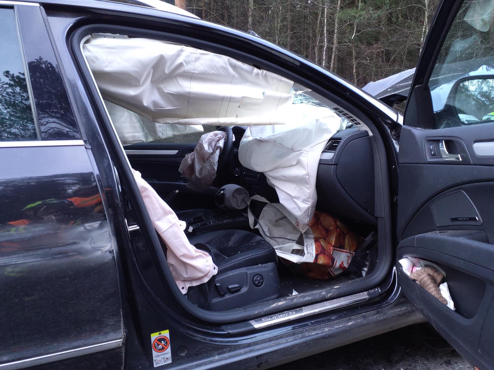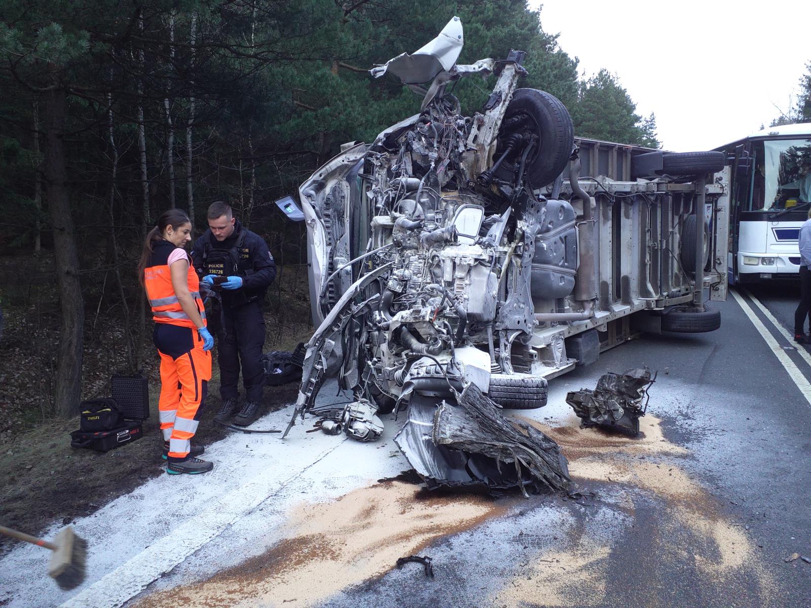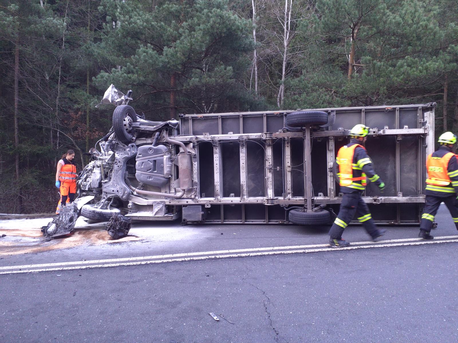 Dodávka, která skončila na boku začala po nehodě hořet. Uhasit se jí podařilo ručním hasícím přístrojem projíždějícím řidičem před příjezdem hasičů.
