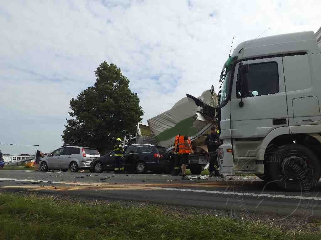 Kolize pěti vozidel (tři osobní, jedna dodávka a jedno nákladní) si vyžádala jednu zraněnou osobu.