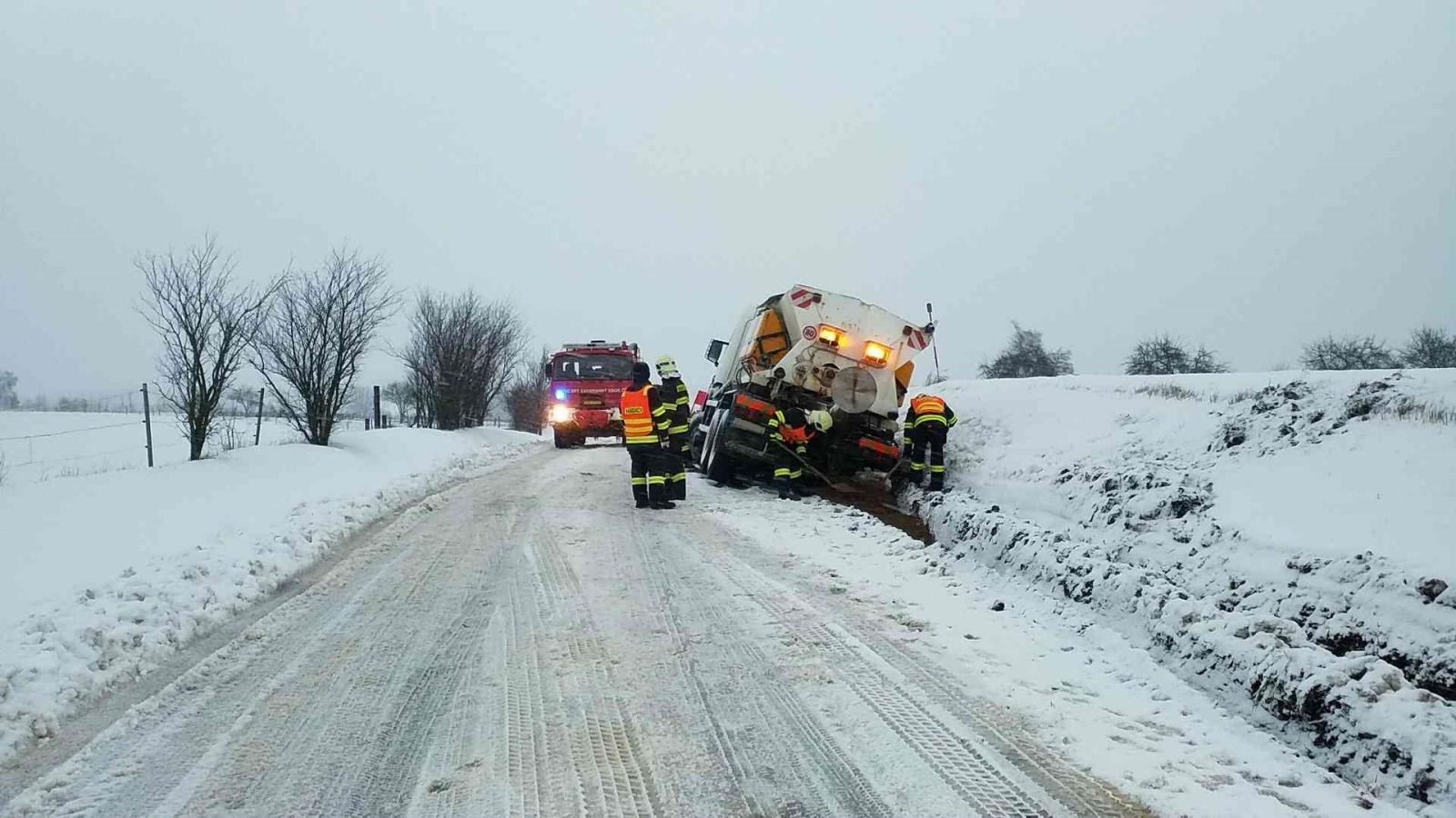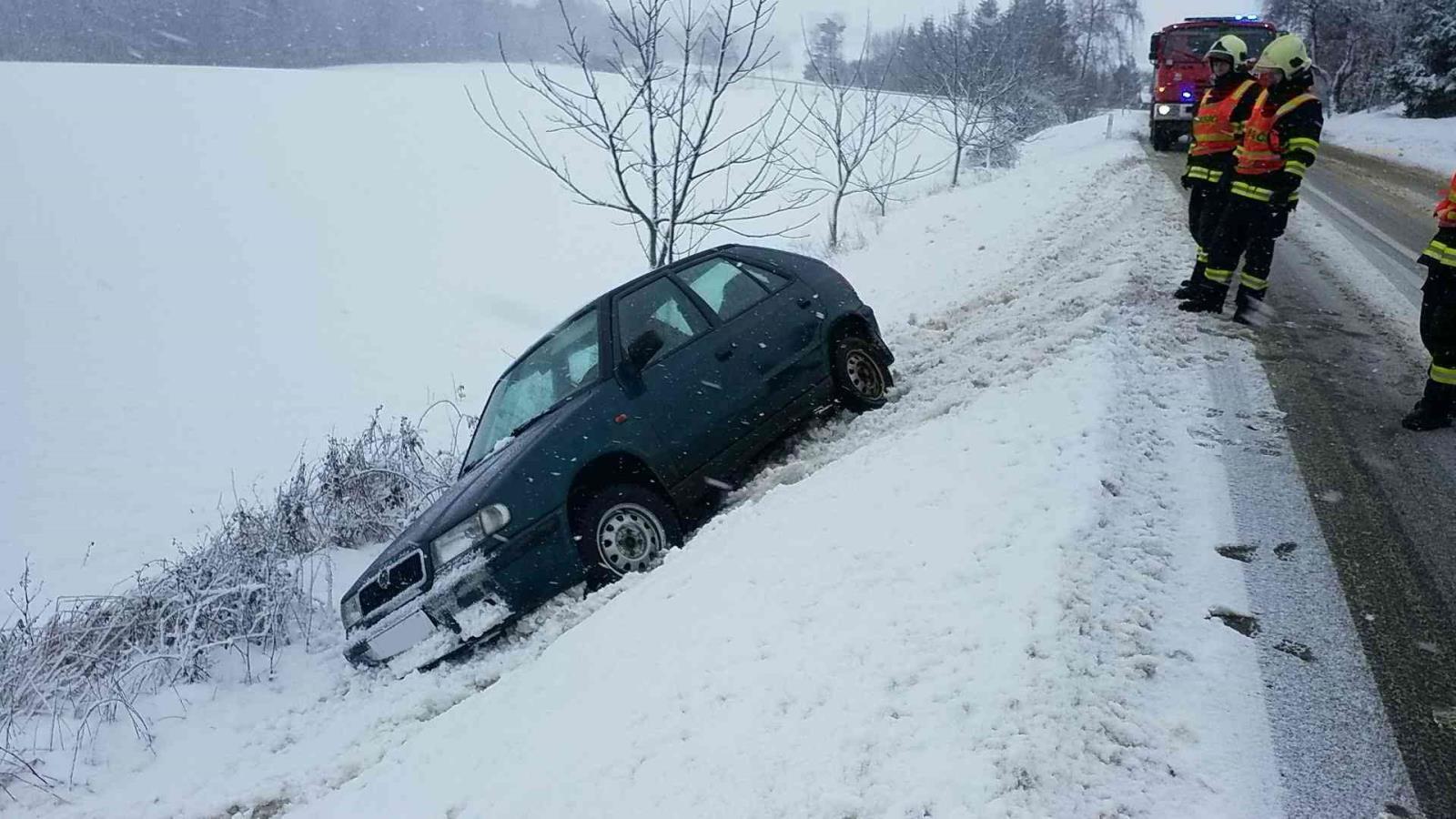 V Lanškrouně pak skončilo v příkopu a závějích osobní auto mimo komunikaci. Nehoda se obešla bez zranění i úniku provozních náplní. Hasiči automobil vytáhli.