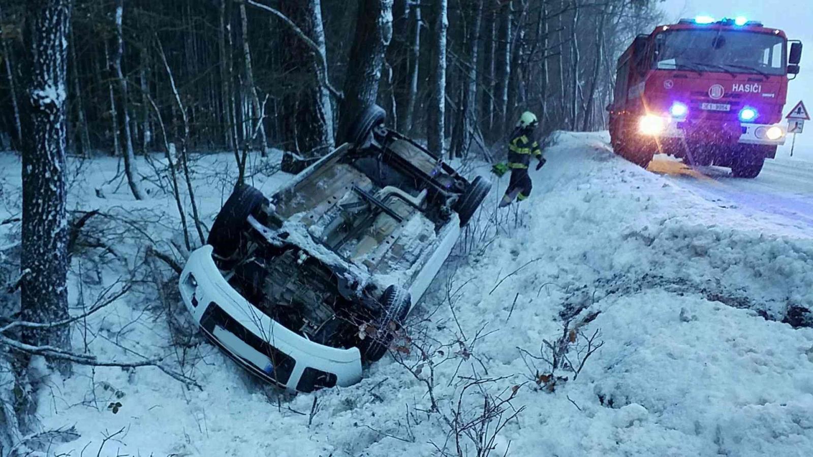 V Libchavách skončilo osobní auto na střeše. Řidiče od nehody odvezla posádka zdravotníků na vyšetření. Převrácené vozidlo hasiči zpět obrátili na kola pomocí jeřábu.