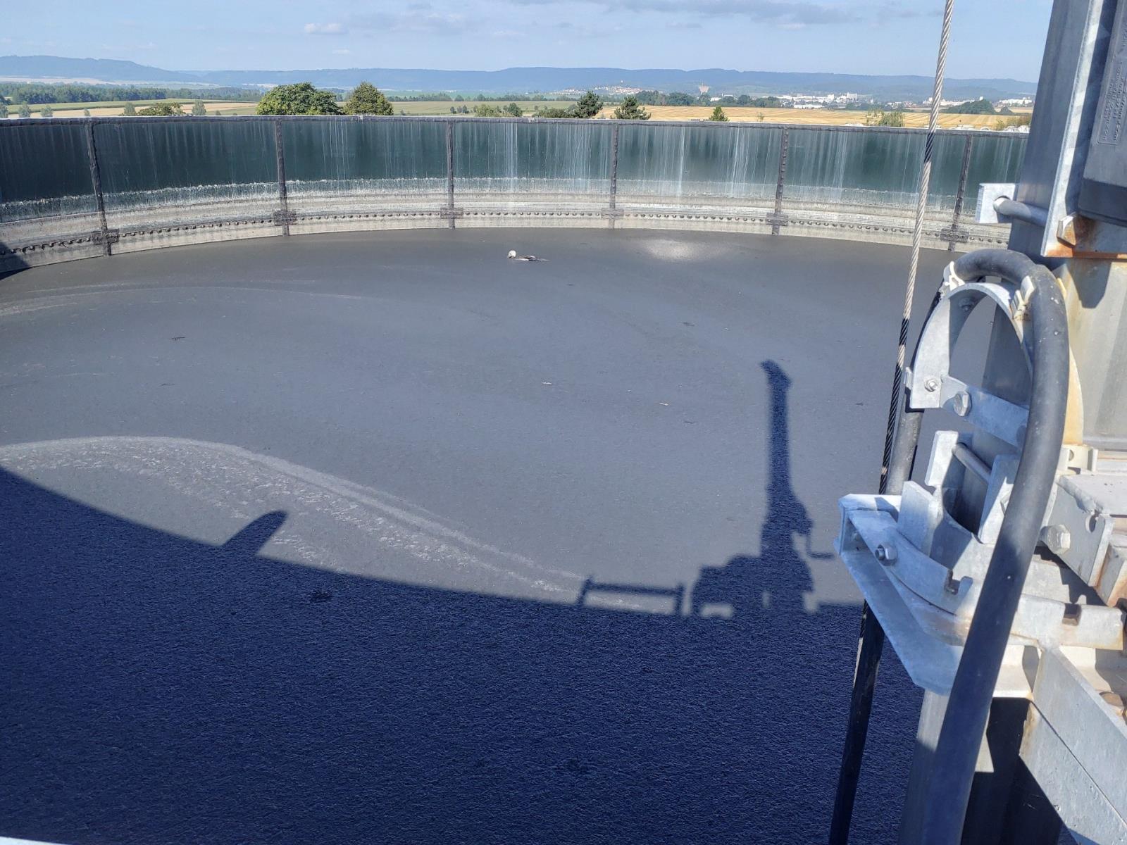 Čáp plaval na hladině, ale nemůže se z ní zvednout k odletu. Srně spadlé do žumpy.