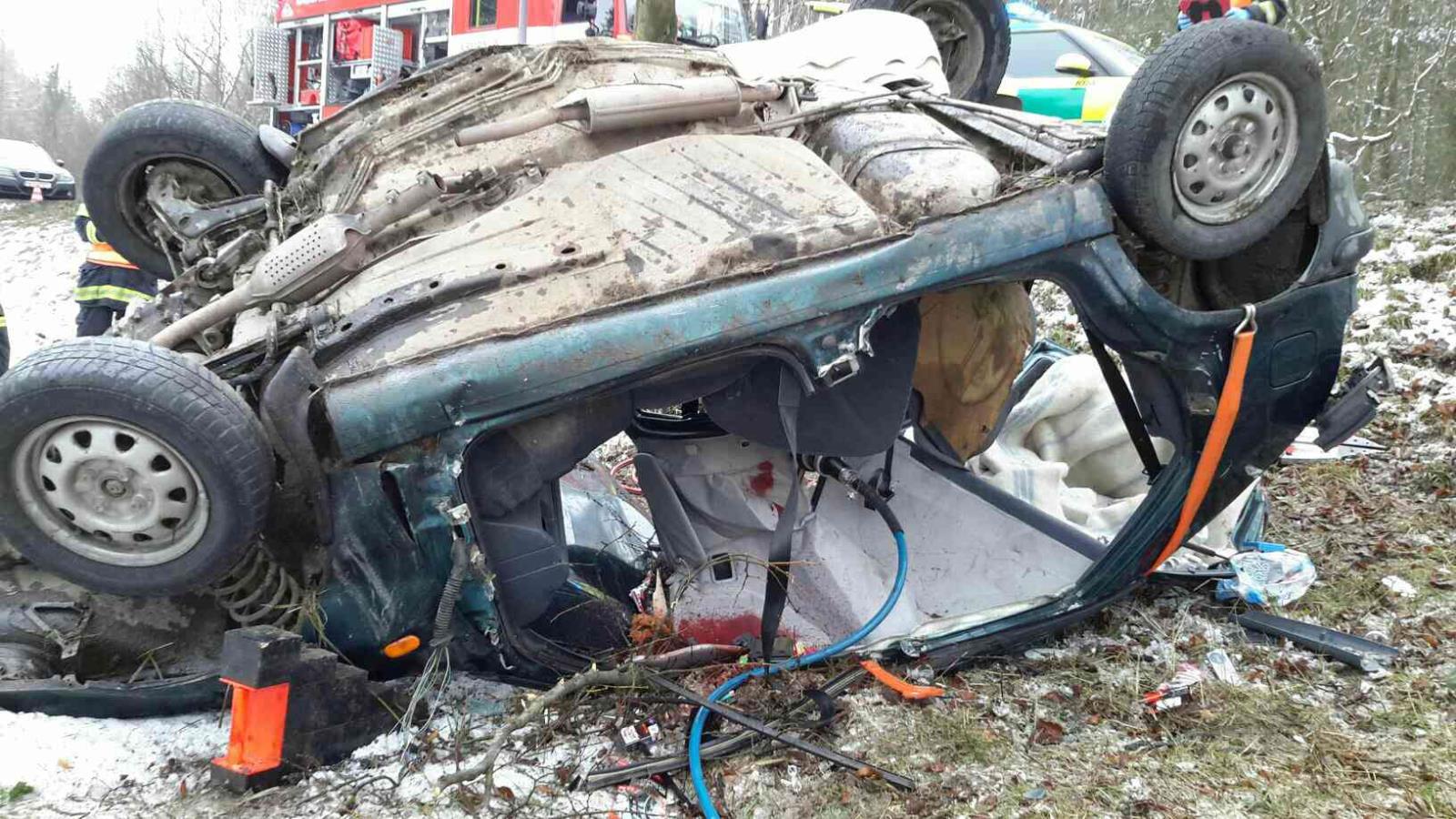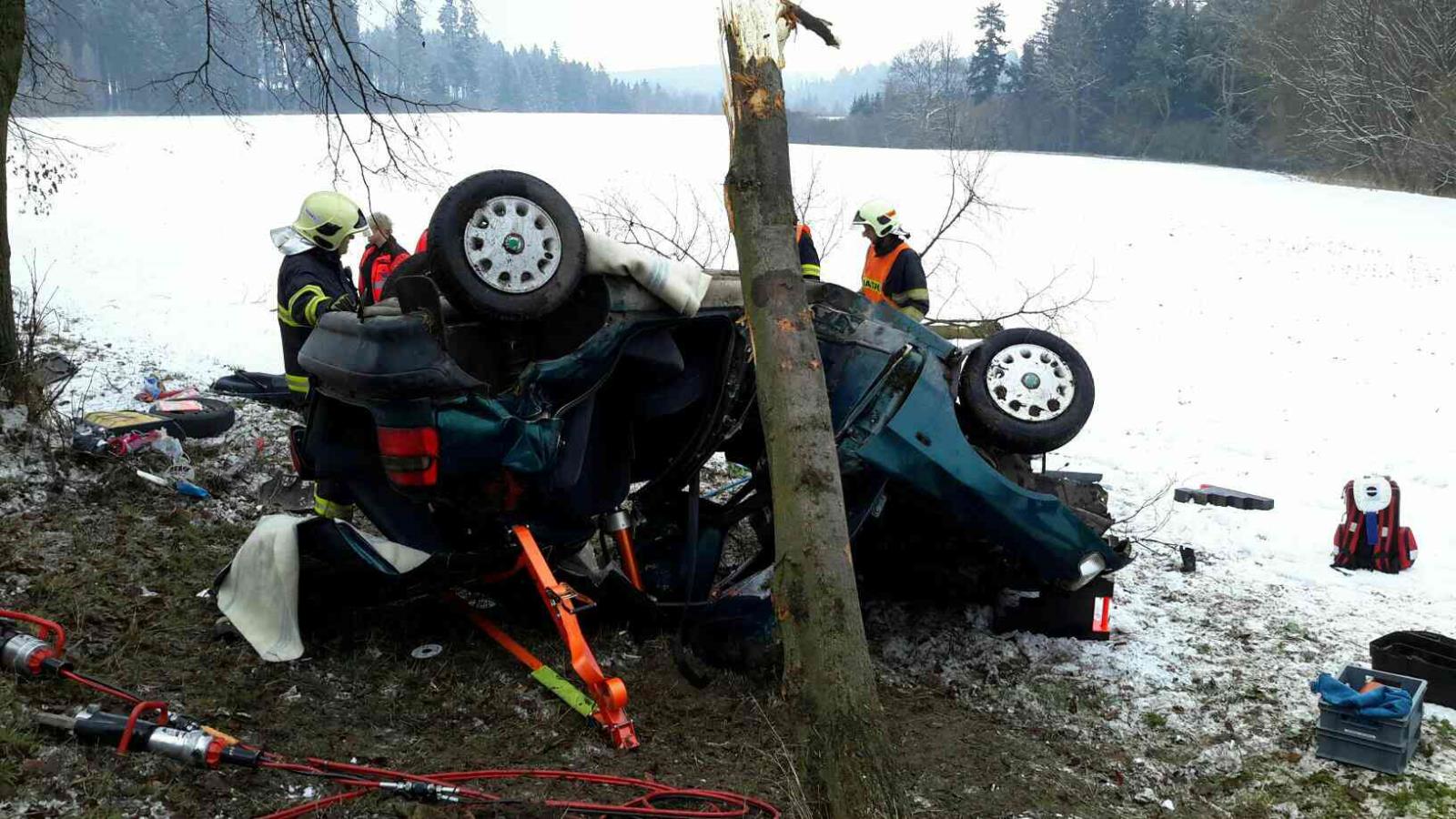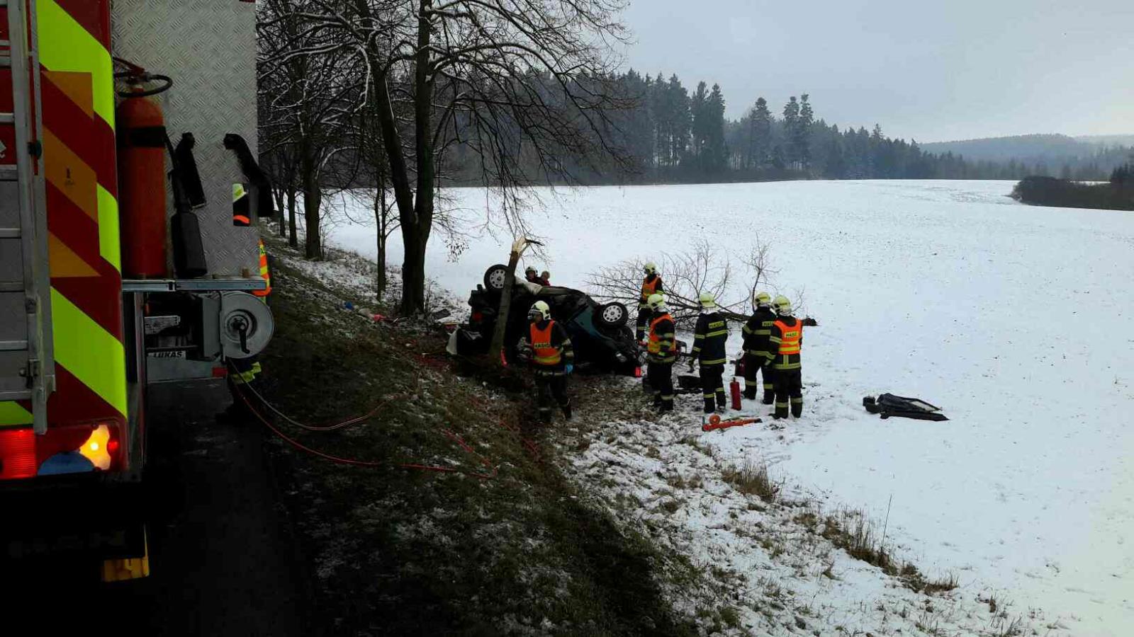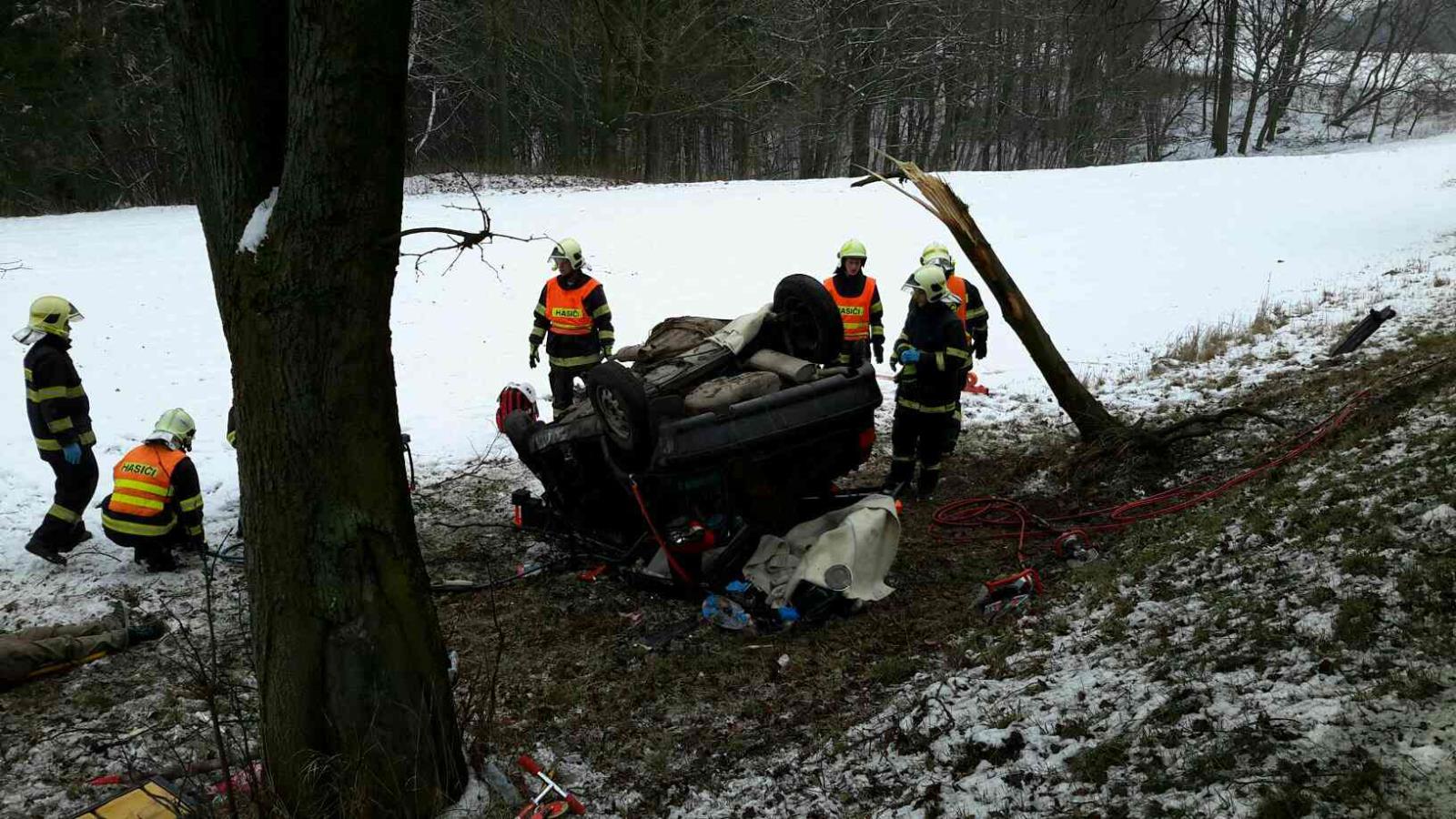 Řidič osobního vozidla vyjel ze silnice. S automobilem řidič přerazil strom a skončil na střeše. Při příjezdu hasičů byla uvnitř vozu zaklíněná osoba, kterou hasiči ihned začali vyprošťovat pomocí hydraulického vyprošťovacího zařízení. Po náročném vyproštění byla osoba předána do péče zdravotníků. Lékař ale konstatoval u osoby smrtelné zranění. Hasiči dále museli odříznout zlomený strom a poté vytáhli vozidlo z příkopu a převezli ho na policejní dvůr k dalšímu vyšetřování. Událost byla ze strany hasičů ukončena v 16.16 hodin.