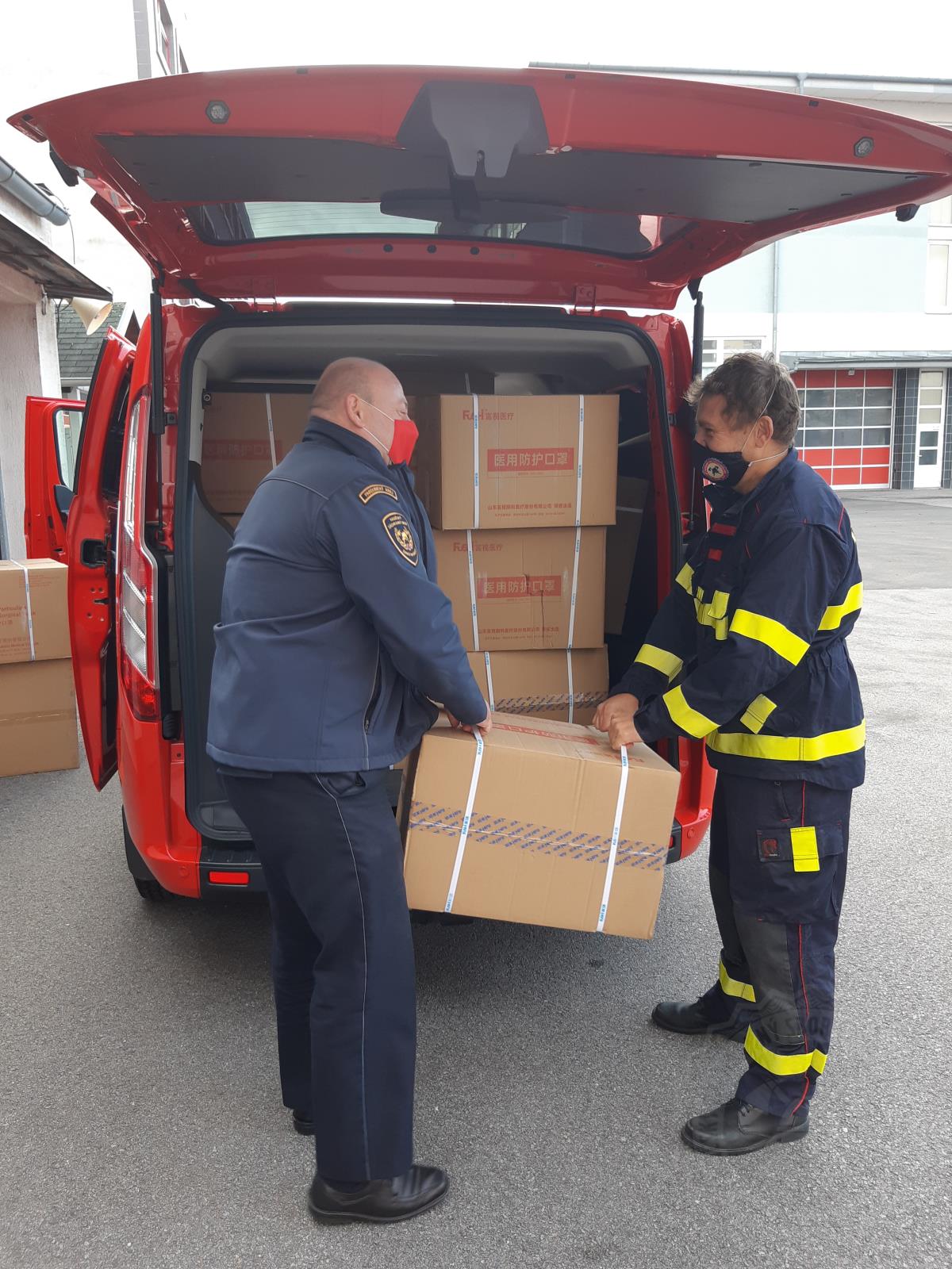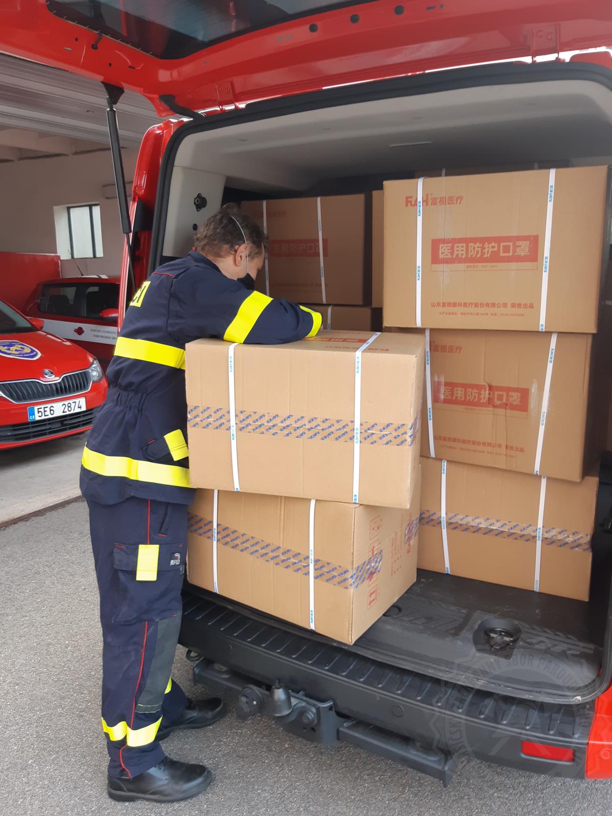Hasiči rozváží ochranné pomůcky pro potřebu zaměstnanců sociálních služeb v zařízeních domovů pro osoby se zdravotním postižením, domovů pro seniory