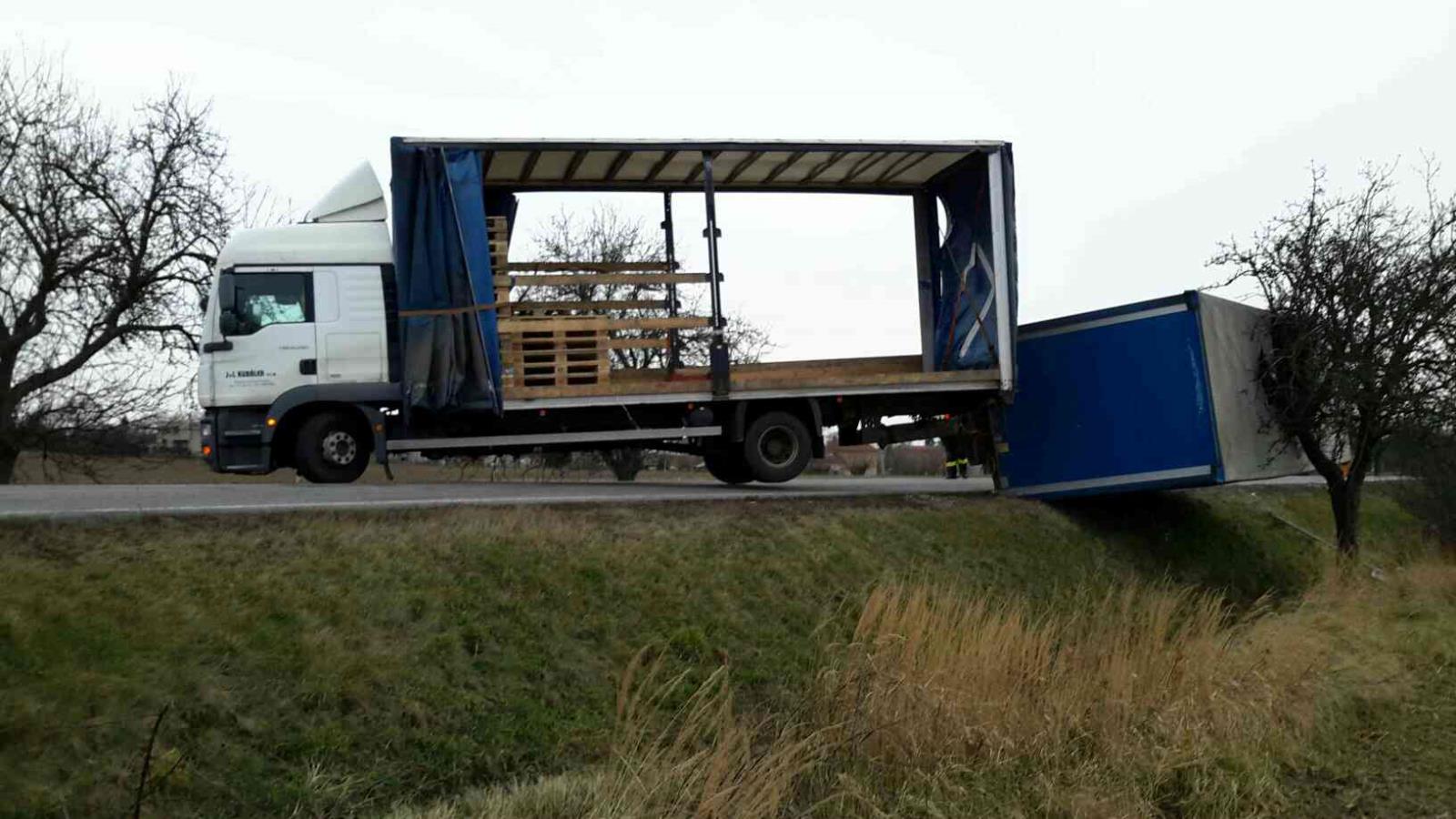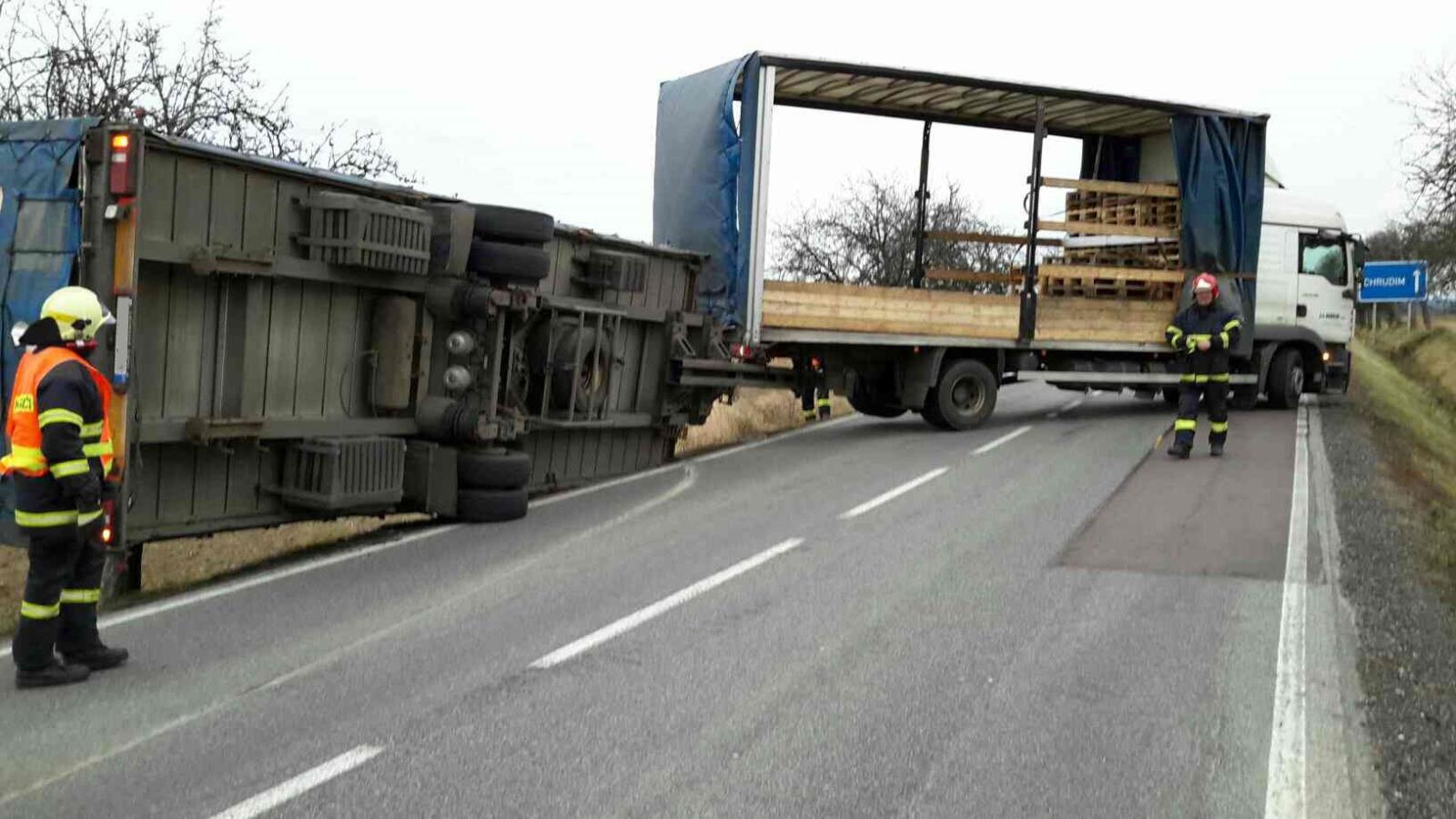 Silný vítr převrátil prázdný kamion s přívěsem v Bukovině u Přelouče. Hasiči zajistili vozidlo proti dalšímu převrácení a přívěs vrátili zpět na kola.
